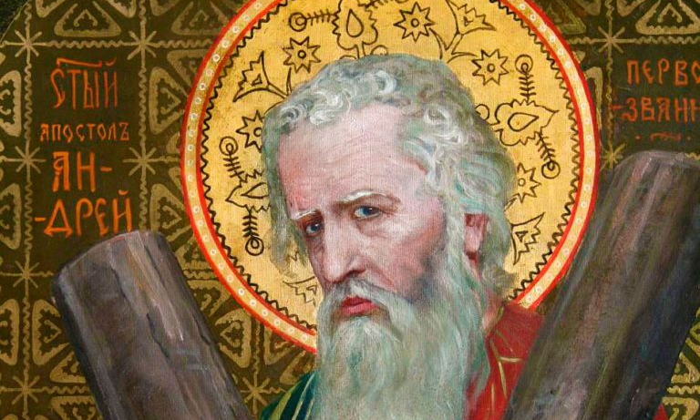 Святий Андрій – брат апостола Петра та один із дванадцяти Христових апостолів. Андрій був учнем Івана Хрестителя, від якого почув про Ісуса. Він став першим, кого Христос покликав як Свого апостола, тож у східній традиції Андрія називають Первозваним (лат. Primus Vocatus). Андрій супроводжував Спасителя під час Його проповіді. Після Христового Воскресіння і Зіслання Святого Духа вирушив проповідувати Христову науку на Сході Римської імперії; за переданням, голосив Слово Боже у Греції – Епірі та Ахаї – а також Візантії. Як стверджують давні церковні письменники, апостол Андрій побував на Русі і навіть поблагословив київські гори. Свою подорож Андрій закінчив у Греції: апостол постраждав у місті Патри у 77 році. За наказом проконсула Егея апостола Андрія після катувань розіп’яли на скісному хресті. На ньому він страждав три дні, а тоді відійшов до Господа.