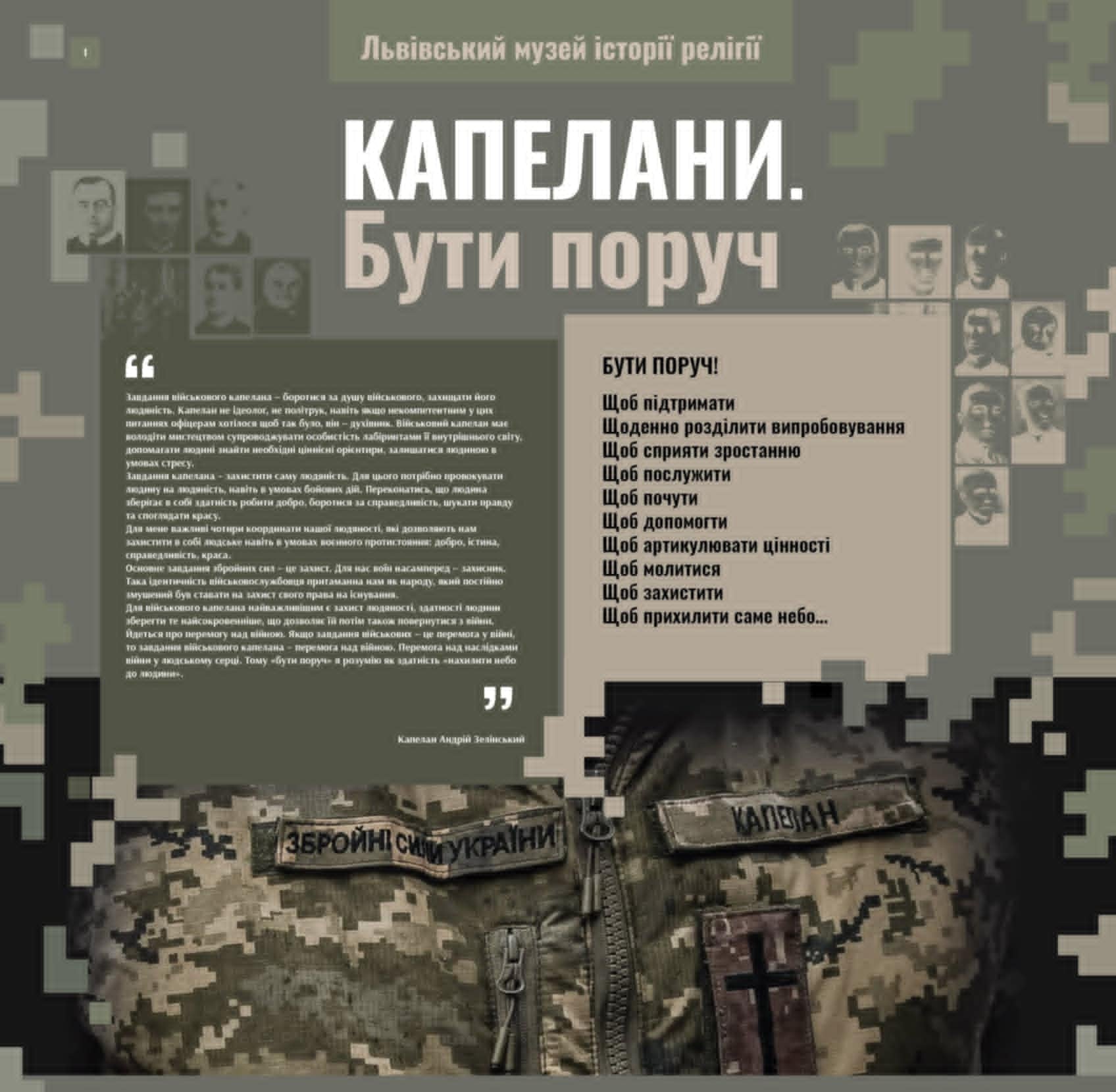 Підготувала виставку Руслана Бубряк, завідувачка виставкового відділу Львівського музею історії релігії. 16 тематичних банерів розкажуть про історію становлення капеланства, про священників-капеланів, які діяли у військових формуваннях і які сьогодні здійснюють душпастирство над військовими, про їхню роль на війні. За основу організатори взяли документальні світлини з музейних фондів, унікальні експонати, які надали самі ж капелани.