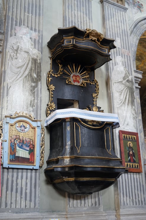 Інтер’єр храму прикрашають фрески XVII століття, авторство яких приписують анонімному італійському майстрові (за однією з гіпотез, це був маляр із Болоньї, який навчав о. Бенедикта Мазуркевича, в якого згодом вчився Станіслав Строїнський).