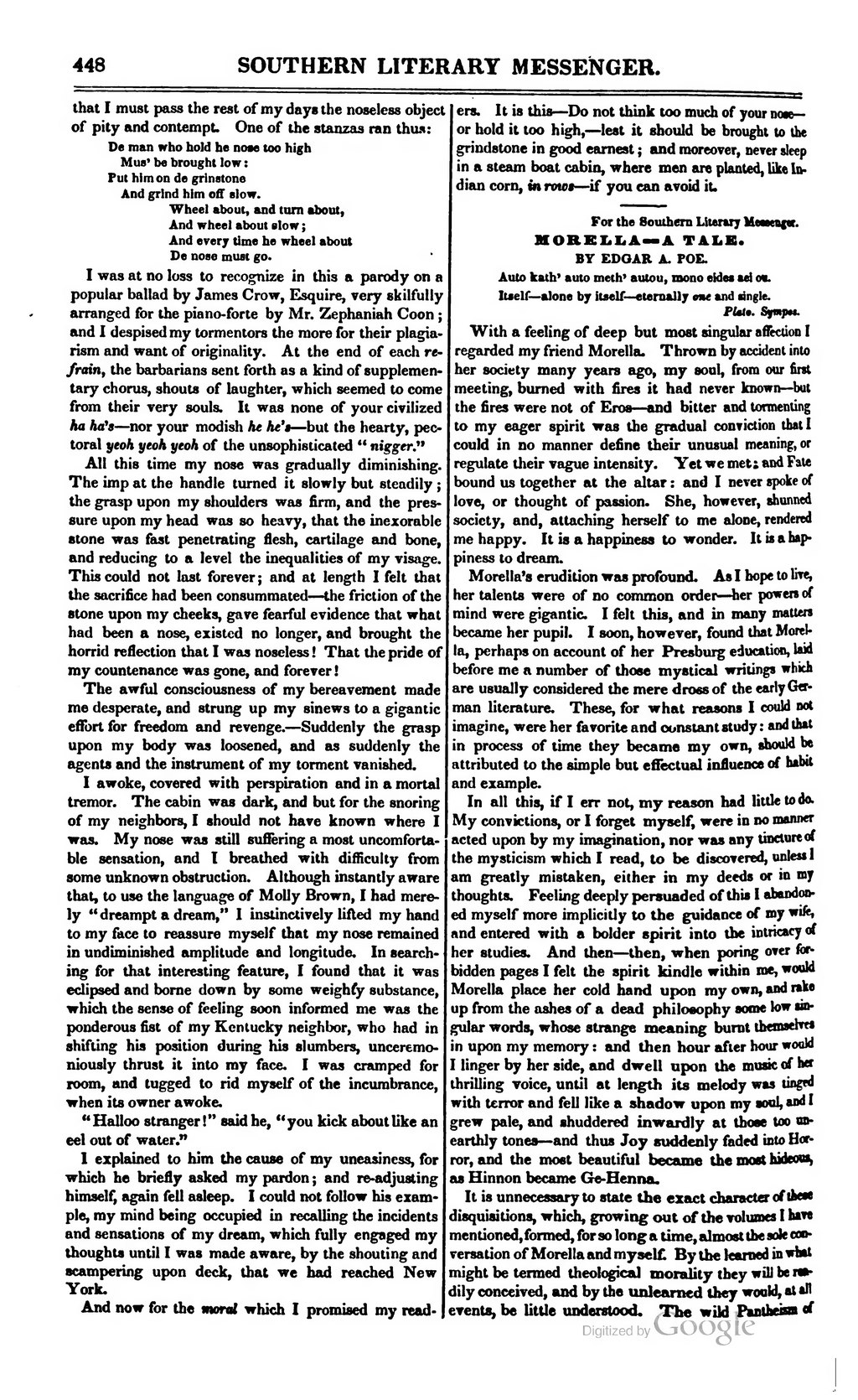 Щоправда, в пізніших передруках Едґар По редагував текст і прибрав із нього вірша – і таке рішення виглядає доволі логічним. Адже героїня цього оповідання на ім’я Морелла – не що інше, як справдешня відьма; вже буквально в наступній сцені вона проклинає свого чоловіка, а згодом, по своїй смерті, знову з’являється в оповіді, щоб мучити його. З огляду на це молитва до Богоматері тут видається радше іронічним жартом – хоч цілком можливо, що автор первісно вкладав у цей сюжет інший зміст. Можна припустити, що, попри свій очевидний зв’язок із чорною магією, Морелла все-таки перед смертю шукає спасення. Наприклад, у середньовічних оповіданнях трапляються розповіді про те, як Діва Марія рятувала розкаяних відьом, що не могли молитися Богові, але зверталися з благанням до Неї.