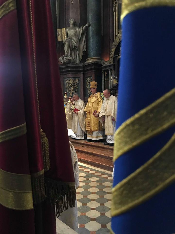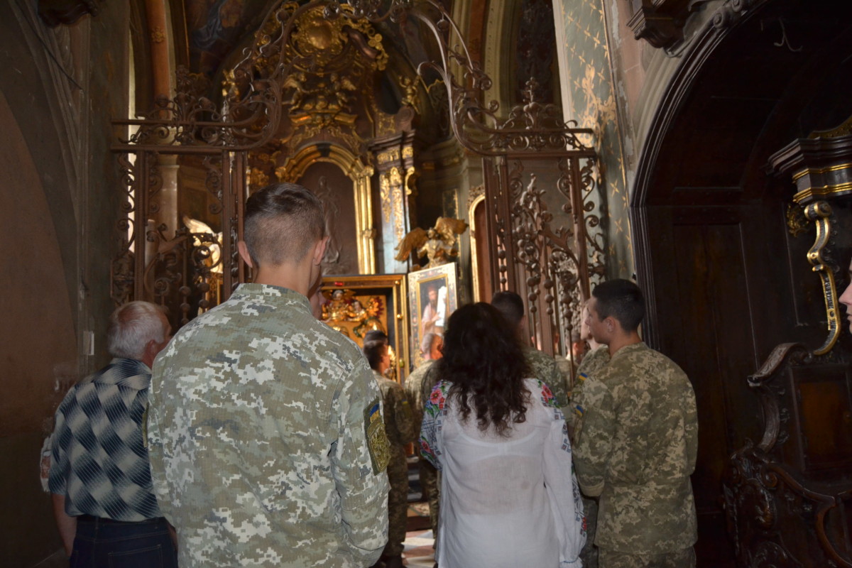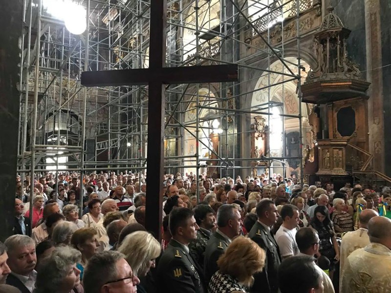 Нині львів’яни заповнили не лише стіни Гарнізонного, але також площу перед храмом. Архиєрейську Літургію з нагоди храмового празника очолив єпископ Стемфордської єпархії УГКЦ Павло (Хомницький).