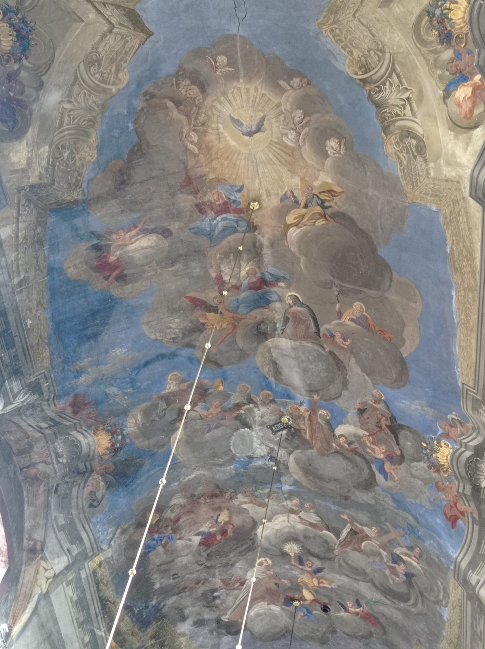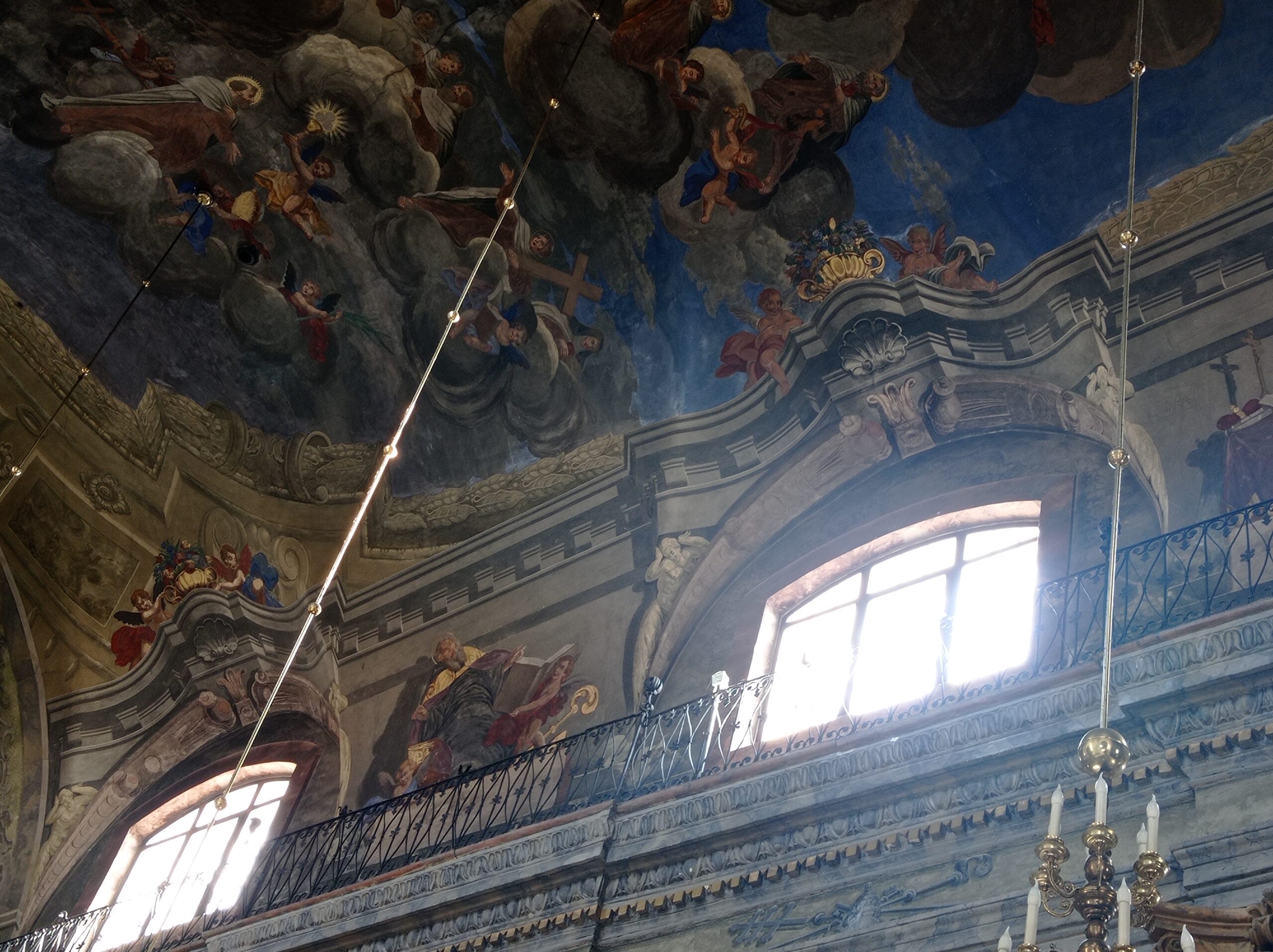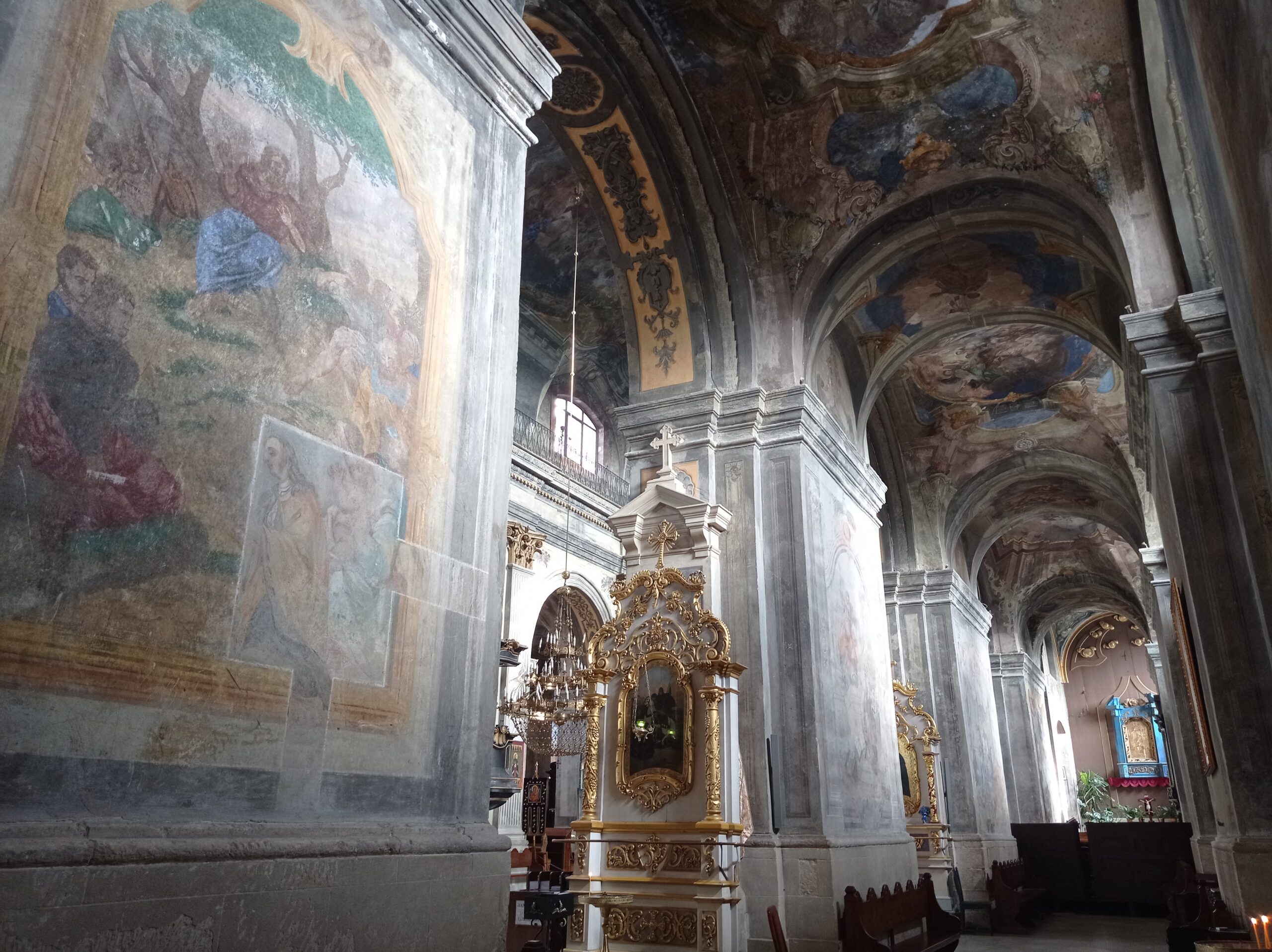«Болонський маляр Джузеппе Педретті разом зі своїм учнем – львівським монахом Бенедиктом Мазуркевичем – розробив і виконав першу складну програму розписів храму. Звичайно, вони протягом століть теж були перемальовані. Стінопис було реставровано і частково перемальовано тричі – 1870, 1906, 1918 роки. Тобто те, що ми бачимо – не факт, що оригінал. Хоча є й оригінальні фрески і склепіння, зокрема над вівтарем і головною навою. Під час реставрації зображення поправляли, а дещо просто малювали наново. Тому зараз можемо бачити, що в деяких місцях є щось зовсім інше, а подекуди зображення те саме, але перемальоване заново», – зазначив настоятель храму.