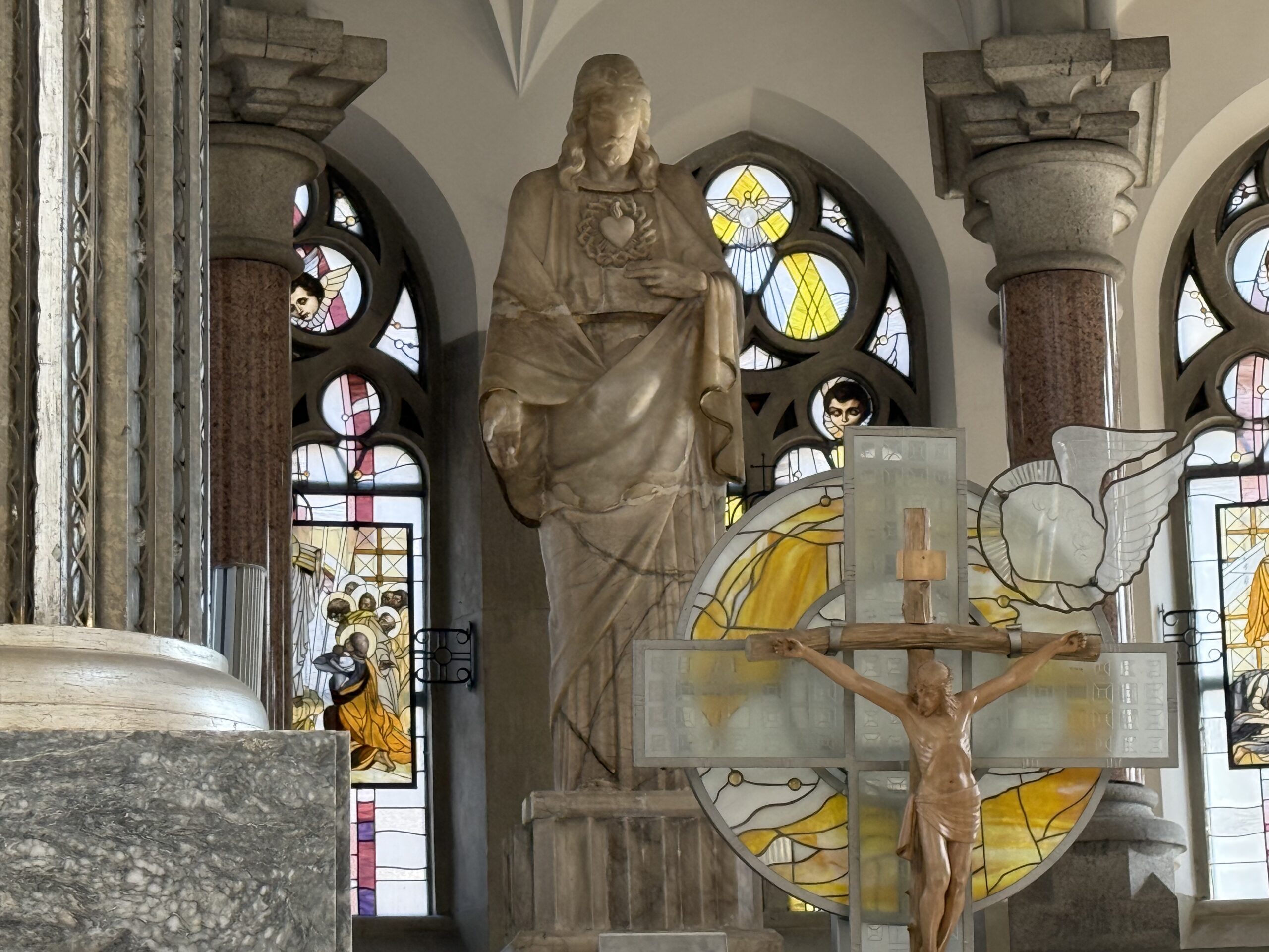 Теперішній інтер’єр зберігає чимало колишніх елементів. Це, зокрема, скульптури янголів та двох Пап у вівтарі, а також велика відновлена фігура Спасителя посередині. На стінах можна побачити ікони з 1990-х. Різьблені елементи все ще зберігаються на своїх місцях, хоча сучасна концепція передбачає акцент саме на камені й склі, які надають храмові більшого простору та відкритості.