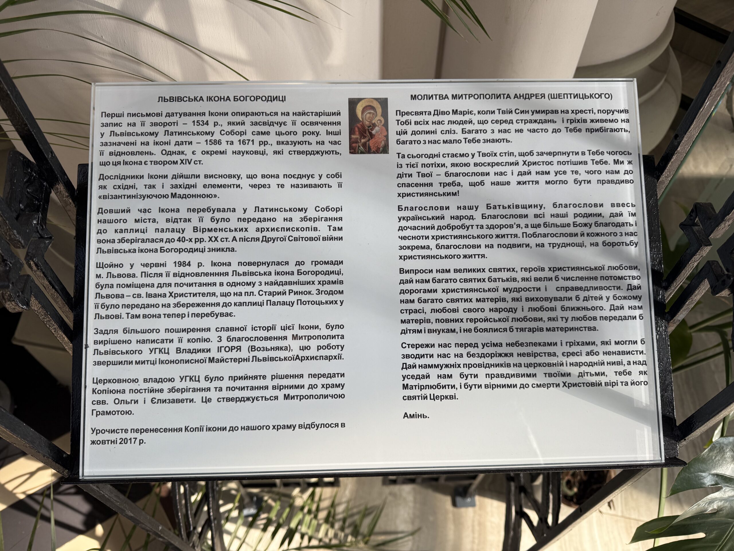 У лівій ніші перебуває копія Львівської ікони Богородиці, передана сюди грамотою митрополита Ігоря. Цю чудотворну ікону вважають найстарішою у Львові й датують XIV століттям. Її оригінал після реставрації зберігається у фондах Львівської національної галереї мистецтв у палаці Потоцьких. Свого часу ікону відшукав український мистецтвознавець Борис Возницький (1926-2012).