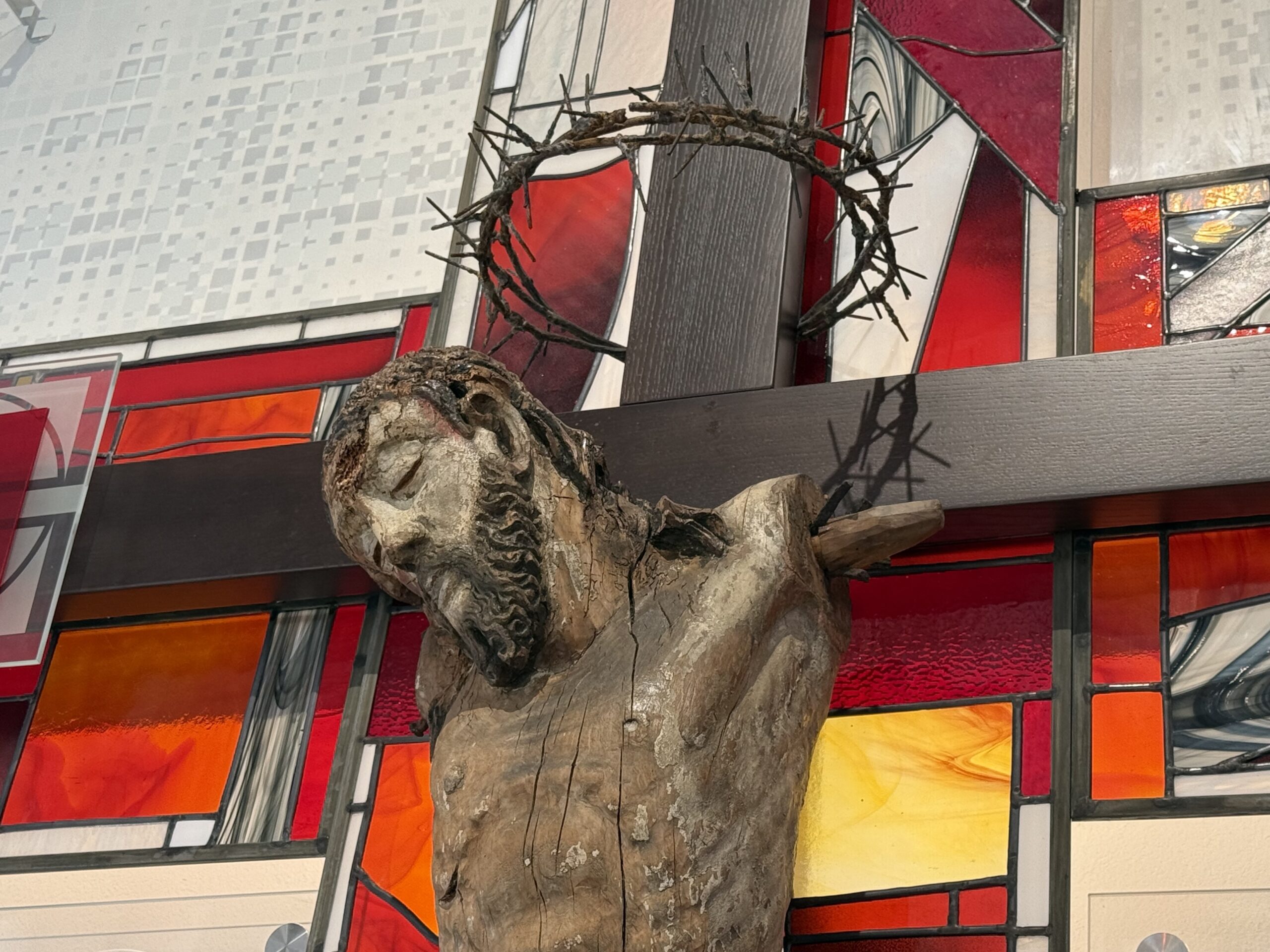 У каплиці праворуч розташоване незвичайне розп’яття – скульптура Христа без рук. Із ним також пов’язана особлива історія. «Після ІІ Світової війни це розп’яття було в цьому храмі, і його призначили на знищення – хотіли спалити. Попри храм ішла дівчина, яка побачила на купі сміття розп’яття без рук. Ввечері вона повернулася і забрала його додому, де переховувала довший час – аж доки сама стала бабцею. І тоді веліла дітям, щоби привезли його до цього храму, бо воно звідси є. І от якраз – здається, в 2022 році – у Велику П’ятницю ми готуємо Плащаницю – і під’їхав хлопчина, привіз це розп’яття – так на руках його приніс і розповів цю історію», – розповів о. Іван. З цією справою звернулися до митрополита Ігоря. Були варіанти відновити руки, або ж виставляти це розп’яття замість Плащаниці. Врешті зійшлися на варіанті виділити для нього окреме місце, аби протягом року можна було його бачити у незміненому вигляді.