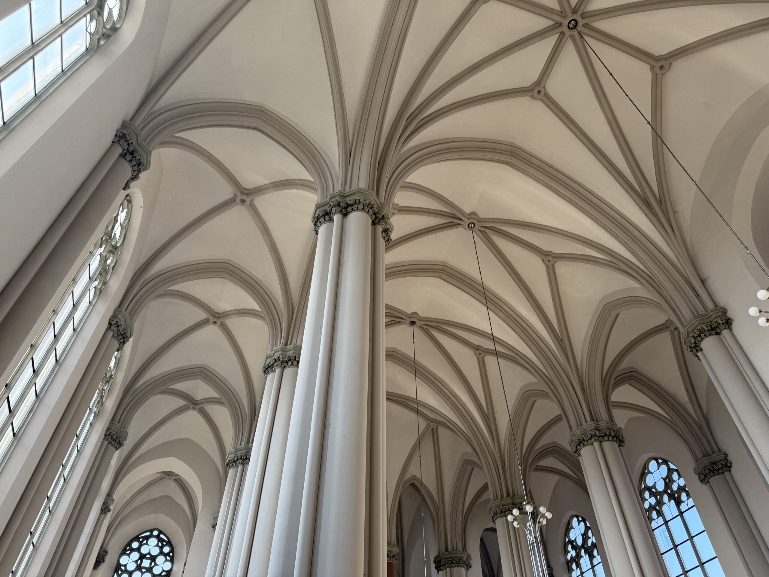 До 1908 року зусиллями будівничих вже було зведено стіни під накриття, а вежі – до половини своєї висоти. Храм постав у неоготичному стилі з багатьма класичними елементами готики – високі гостроверхі шпилі, стрілчасті вікна, портал з великою трояндою в центрі, внутрішній вертикальний простір. В проєкті була розробка різнопланових вітражів, проте реалізувати цю ідею не вдалося, і вікна засклили звичайним склом.