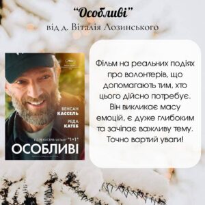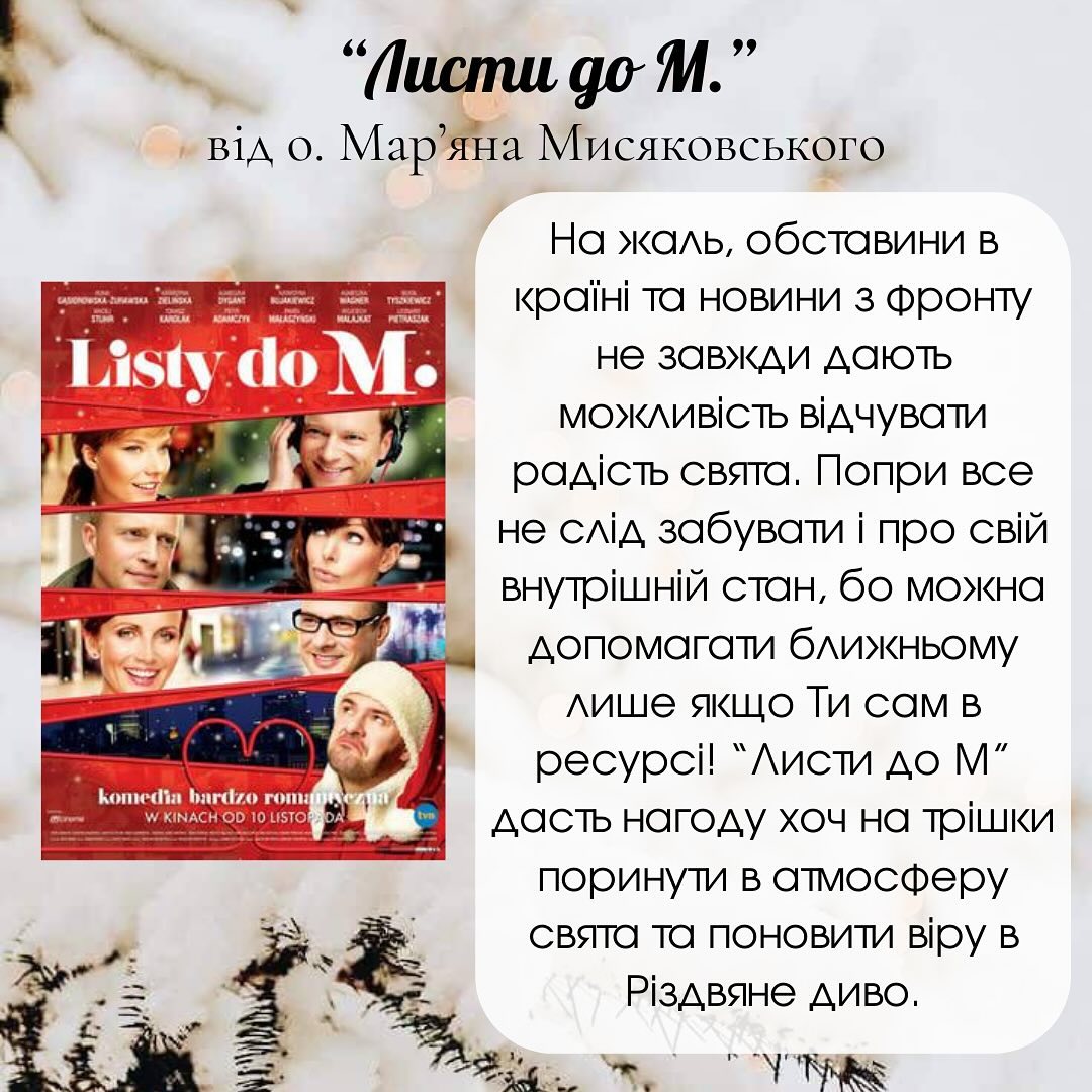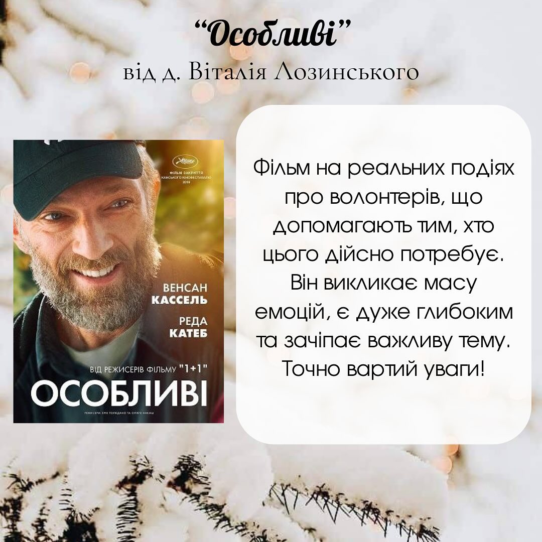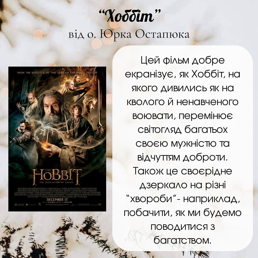 Зокрема капелани пропонують коротку анотацію, що може зацікавити і розповісти про особливість фільму. Є тут як класично святкові рекомендації – такі як фільми «Листи до М» чи «Зимова фантазія», так і стрічки, що не втрачають актуальності у будь-який час, наприклад, «Прихована краса», «Особливі» і навіть «Хоббіт» – екранізація відомого роману Дж. Р. Р. Толкіна.