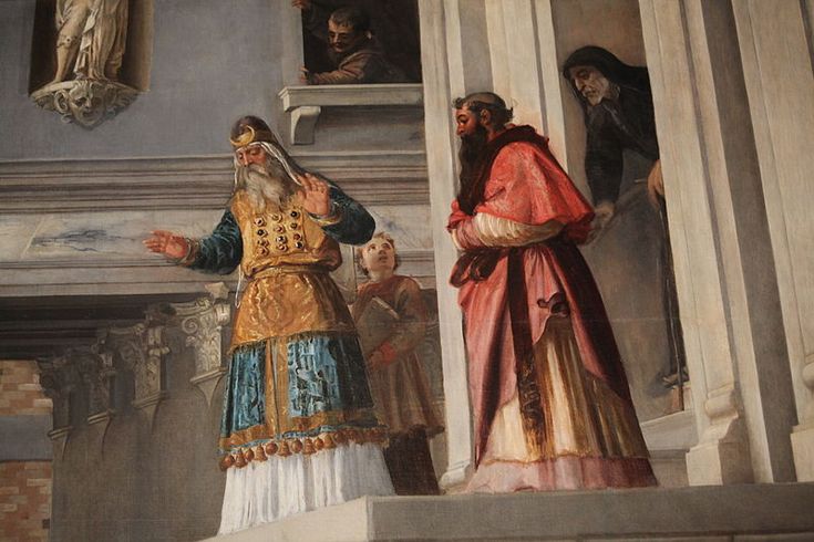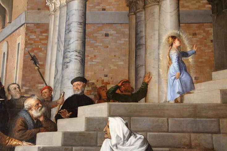 Все це досить цікаво, але не тому ця картина є такою відомою. Геніальність картини полягає в тому, як Тіціан протиставляє хаотичному натовпу Пресвяту Діву. На вершині сходів чекає багато оздоблений первосвященник. Його вбрання включає ефод і 12 коштовних каменів, які представляють 12 колін Ізраїлю. Це один із найвпливовіших людей в Ізраїлі. Внизу сходинок стоять батьки Богородиці, інші дорослі та поважні особи. У небі – дивовижне видовище, коли самі хмари наближаються, наче священне кадило.