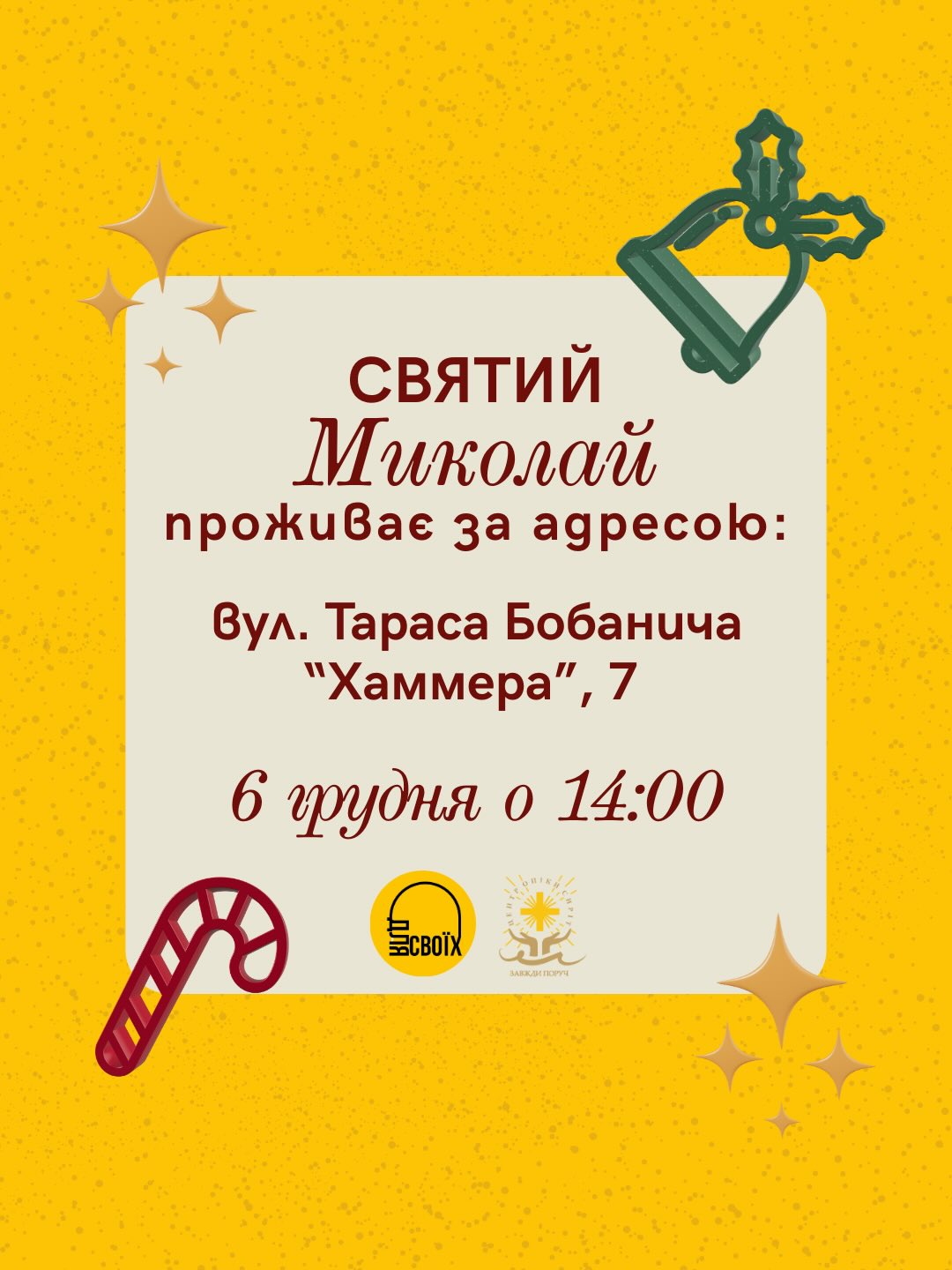«6 грудня Святий Миколай проживає за адресою вул. Тараса Бобанича “Хаммера”, 7 – саме тут він чекатиме на всіх, щоб подарувати тепло, увагу та святковий настрій. Ми створюємо відкрите свято для всіх, але головна місія цього дня – підтримати дітей-сиріт та подарувати їм справжнє диво», – розповідають організатори.