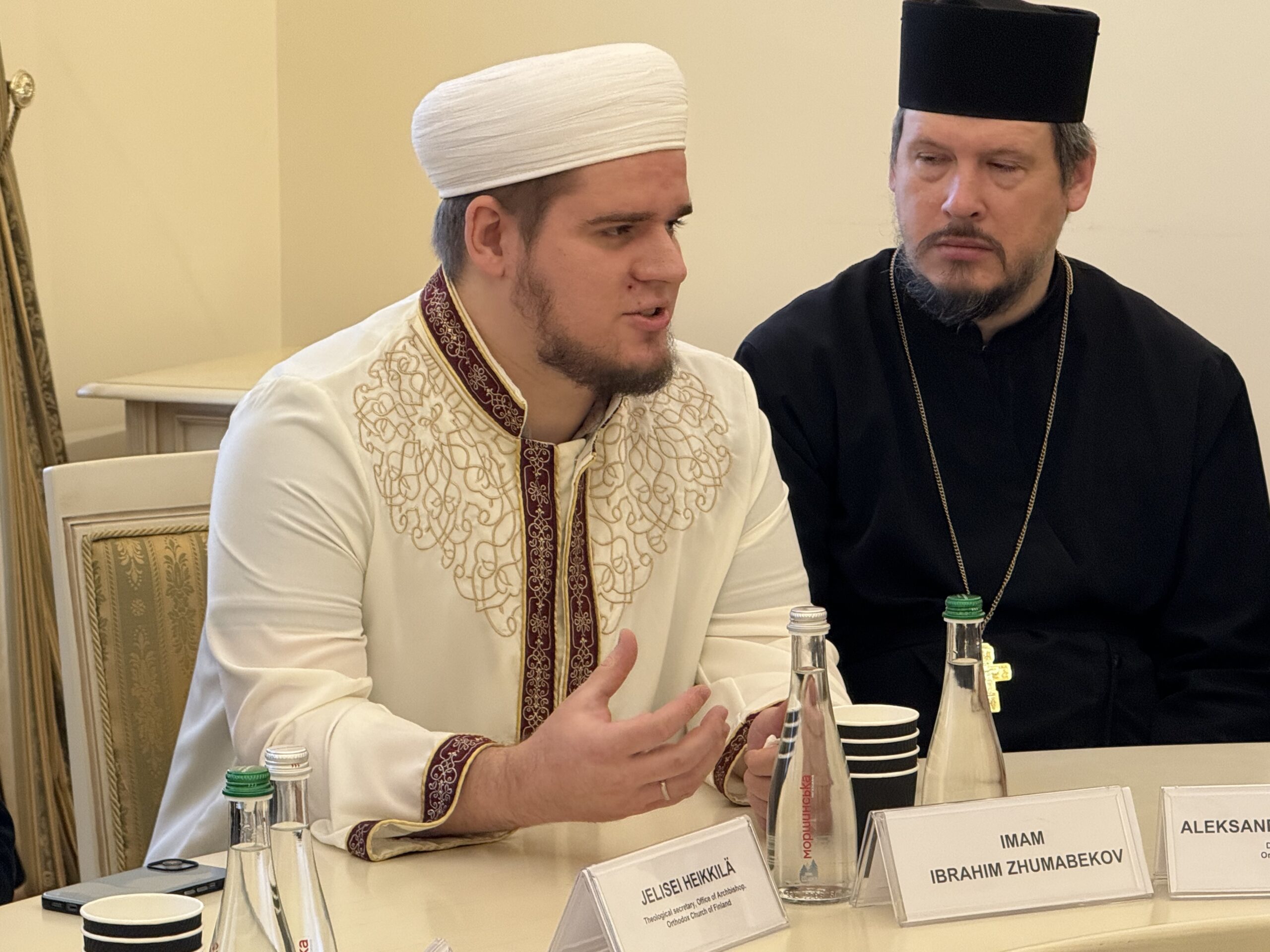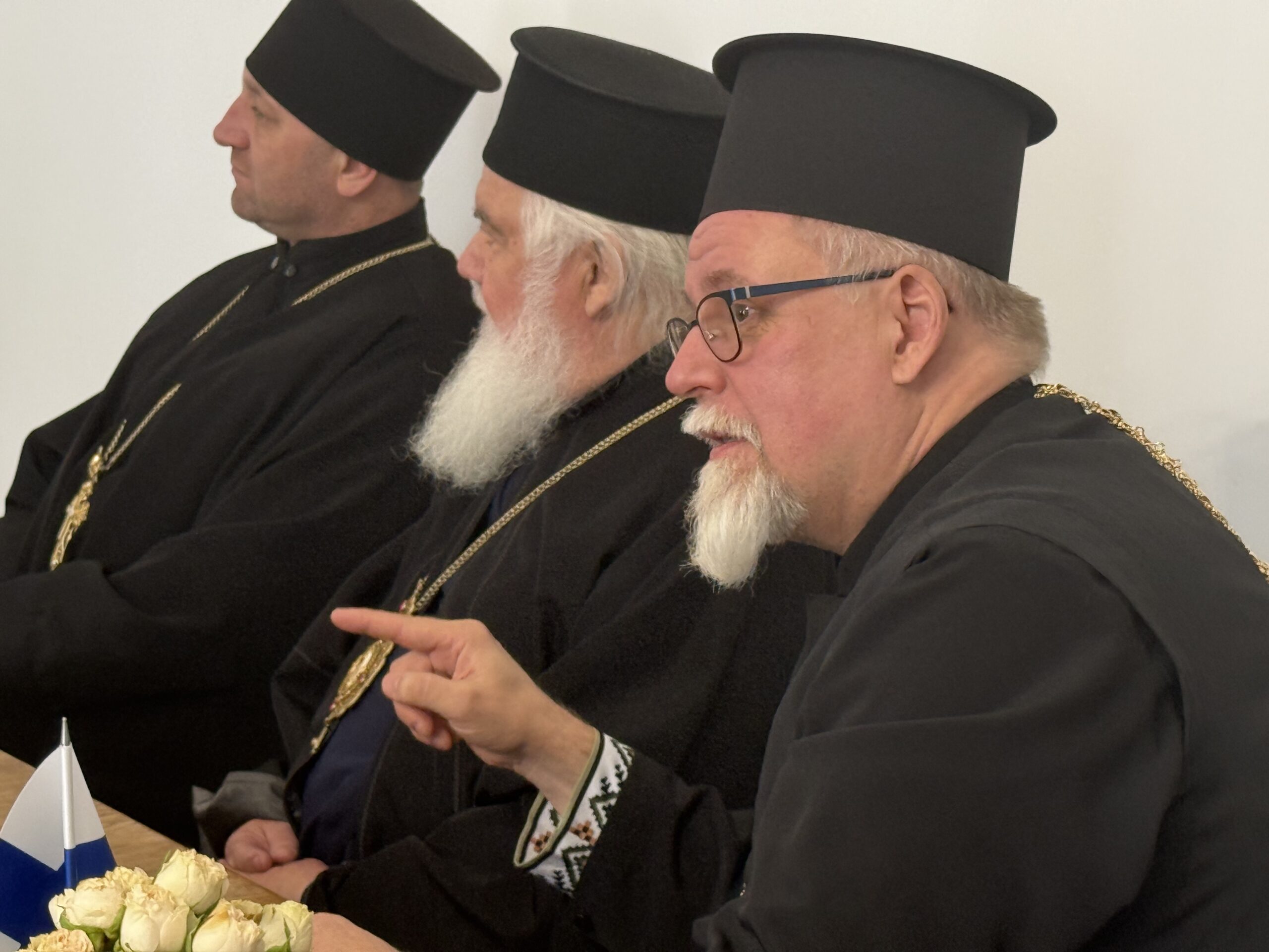 Предстоятеля Фінської Православної Церкви супроводжують секретар його канцелярії Єлисей Хейккіля і декан парафії м. Йоенсуу Олександр Рощенко.