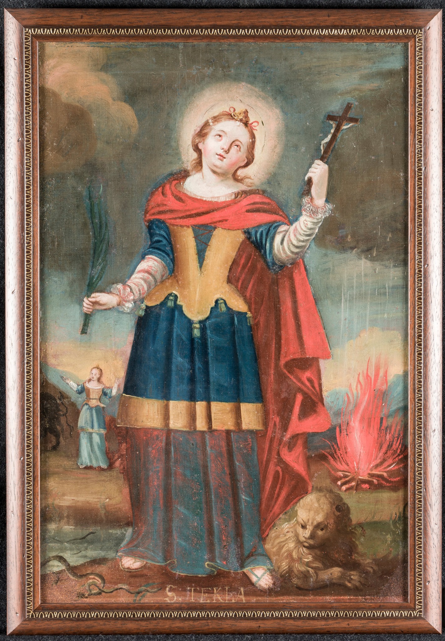 Як розповіла «Духовній величі Львова» завідувачка експозиційного відділу Львівського музею історії релігії Ірина Боцько, відомості про життя святої Теклі знаходять у апокрифічних «Діяннях Павла і Теклі» ІІ століття, а також анонімному «Житії і чудах святої Теклі» V століття. За переданням, вона жила в І столітті в місті Іконії (суч. тур. Конья) в Малій Азії, походила з родині багатих язичників і була заручена зі знатним юнаком. Коли в місто прийшов апостол Павло, Текля почула його проповідь, навернулася у християнську віру і відмовилася від заручин, через що її наречений оскаржив Павла перед владою. Апостола ув’язнили, але Текля підкупила охорону, аби таємно зустрітися з ним. За це вони обоє постали перед судом, і Павла вигнали з міста, а Теклю засудили до спалення живцем. Проте сталося чудо – під час страти вогонь загасив раптовий рясний дощ. Завдяки цьому Текля покинула Іконію і разом з Павлом пішла до Антіохії. Передання говорить, що тут її домагався один зі знатних містян, Олександр; коли дівчина, боронячись, роздерла на ньому одяг, то була засуджена на розшматування звірами. Проте ті не чіпали Теклі, а навпаки – зализували їй рани. Дівчину катували у різний спосіб, проте врешті відпустили. Текля відшукала апостола Павла у Мирах і з його благословення проповідувала Євангеліє до старості, навернувши, зокрема, власну матір.