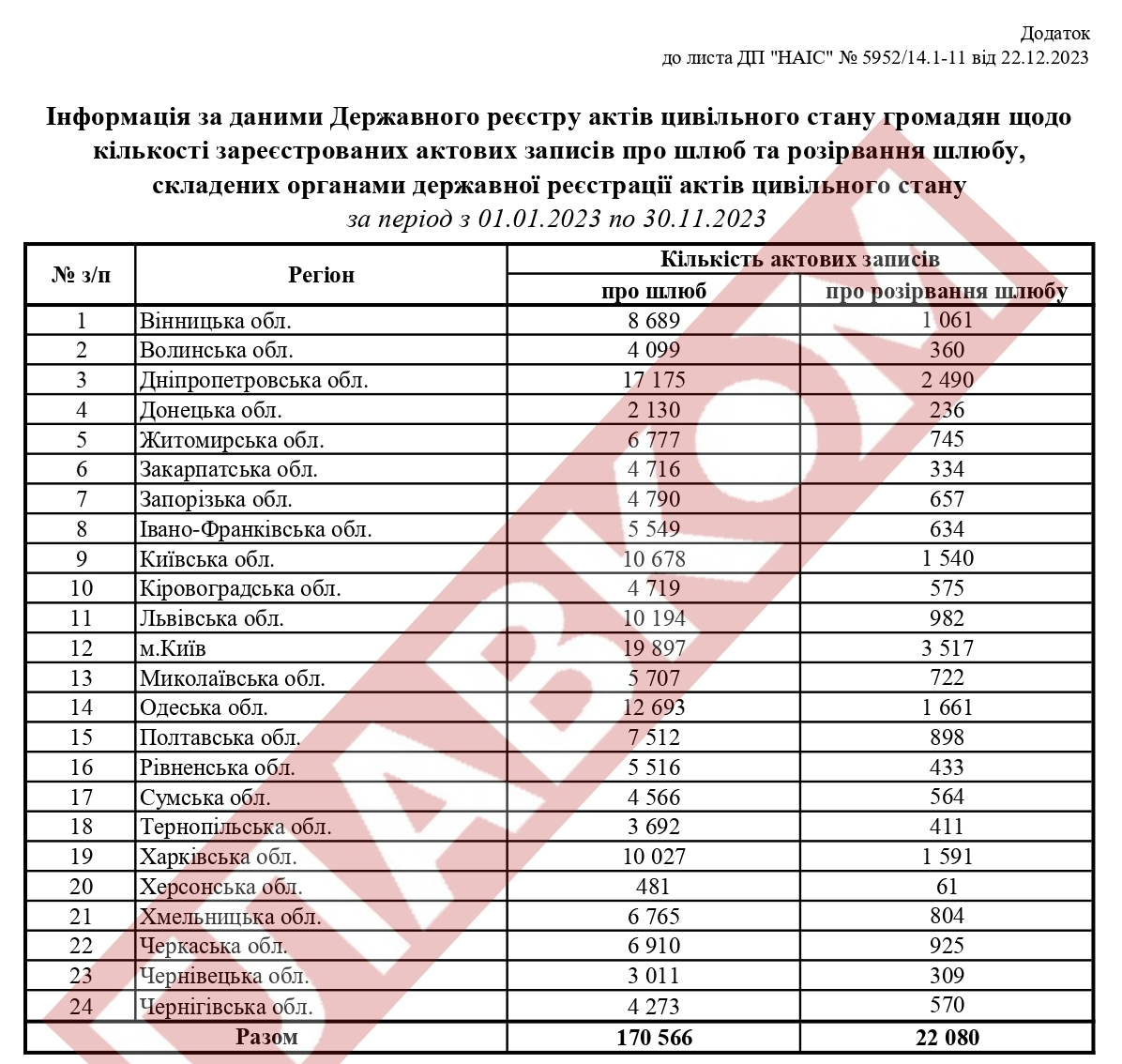За даними Державного реєстру актів цивільного стану громадян, протягом січня-листопада 2023 року було зареєстровано 170 тис. 566 шлюбів, а також 22 тис. 80 актових записів про розірвання шлюбу.