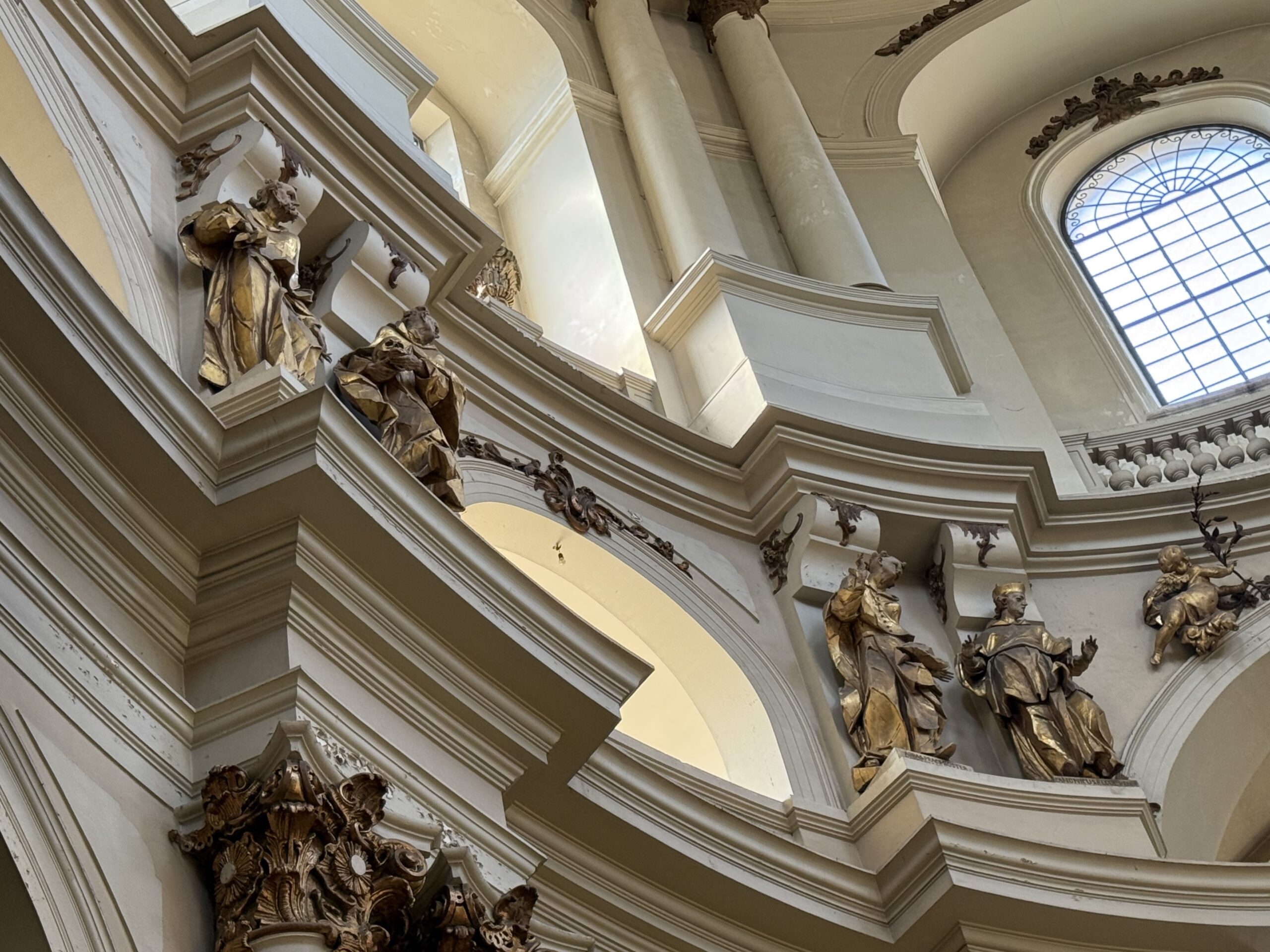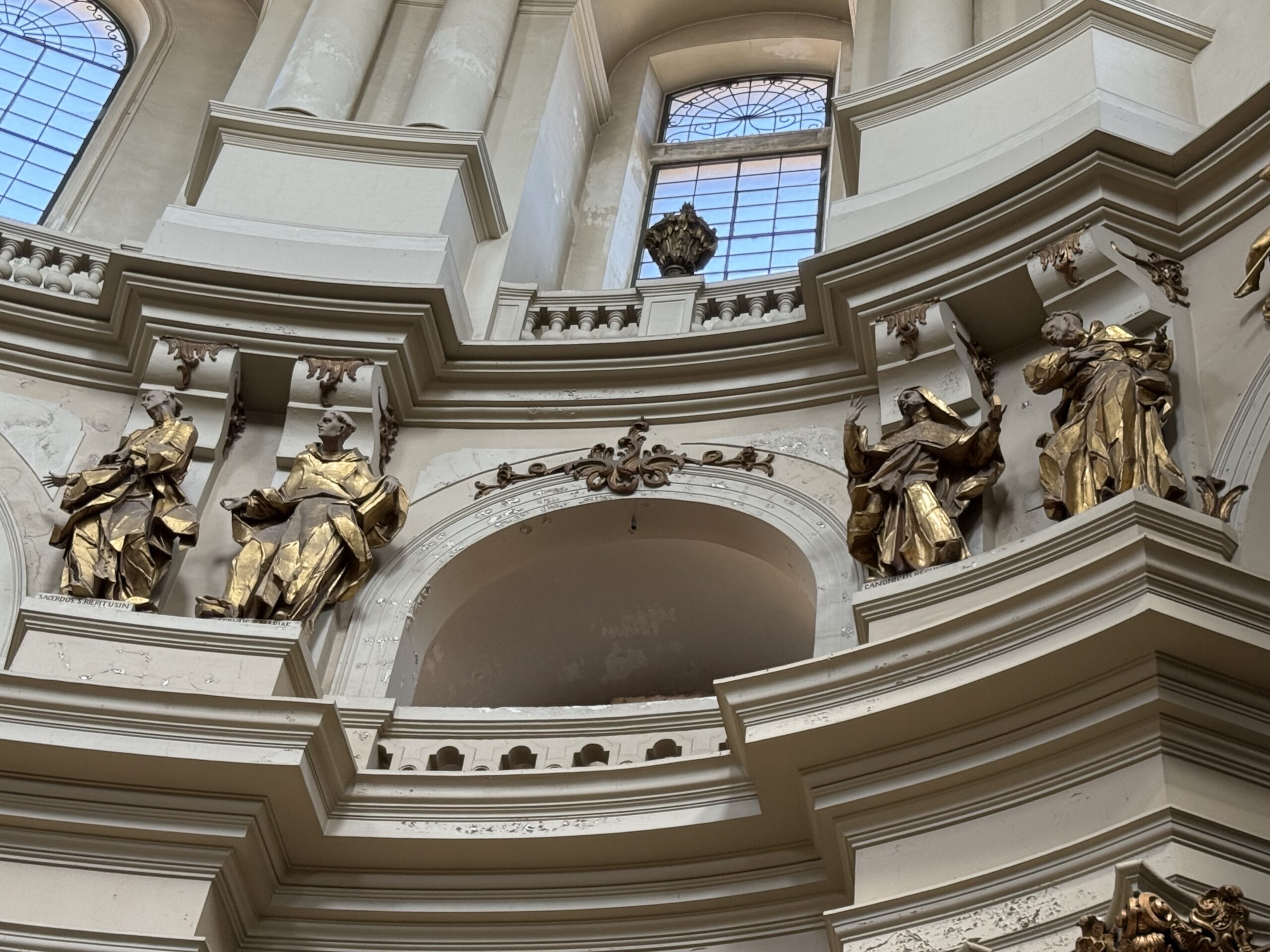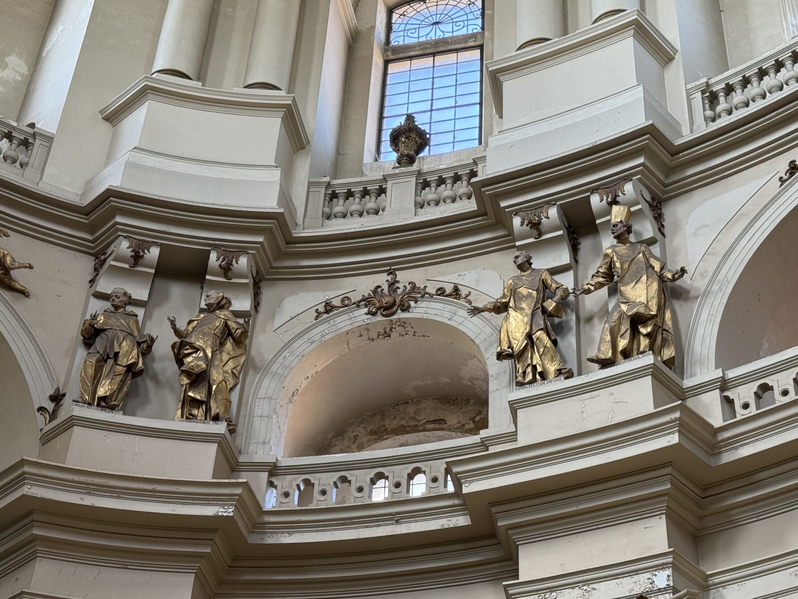 Прикрашають вівтар чотири дерев’яні скульптури XVIII століття авторства Матвія Полейовського: Іван Хреститель, апостоли Петро і Павло та євангелист Лука. Щоправда, у радянський час деякі елементи були втрачені – Хреститель «загубив» палицю, у святого Петра поцупили ключі, а святий Павло залишився без меча. Проте самі скульптури разом із вісімнадцятьма статуями ченців різних орденів під куполом створюють барокову композицію, що вражає і в наш час.