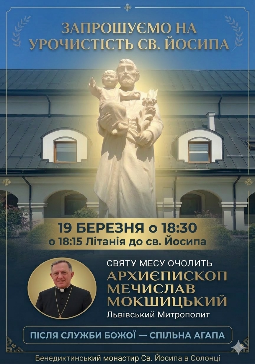 Монастир бенедиктинок у Солонці під Львовом запрошує молитовно відсвяткувати урочистість святого Йосипа та п’ятиліття обителі. Молитву очолить митрополит Львівський РКЦ Мечислав Мокшицький.