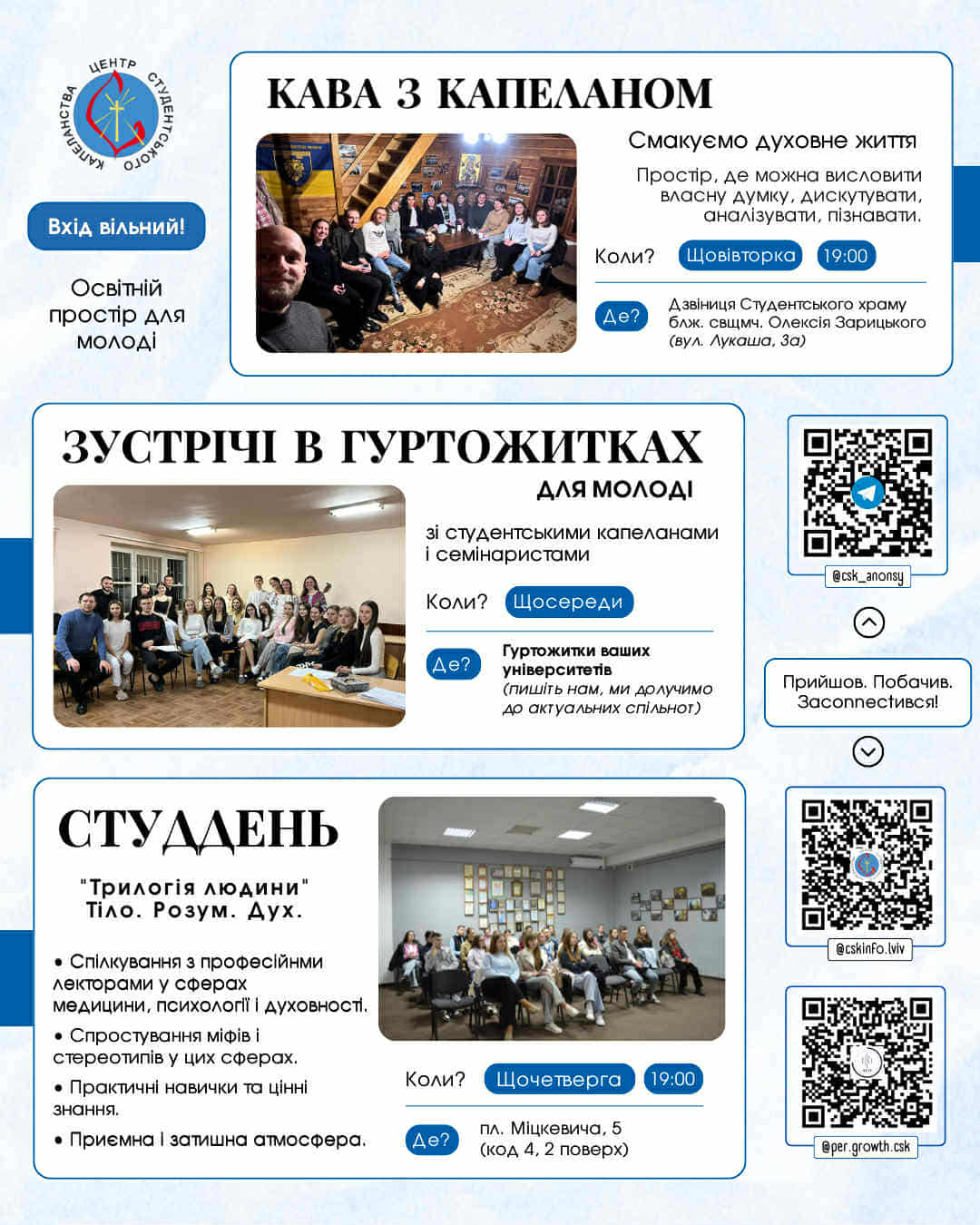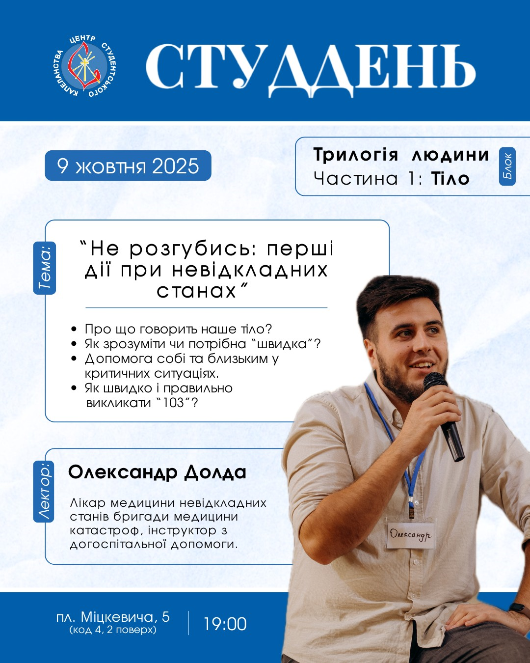 У новому семестрі львівський Центр студентського капеланства відновлює щочетверговий СТУДДЕНЬ (Студентський день) – зустрічі для молоді на актуальні теми, що відбуваються щочетверга протягом навчального року. Протягом наступних кількох місяців молодіжні зустрічі будуть присвячені темі «Трилогія людини». Вона включатиме три тематичні блоки: