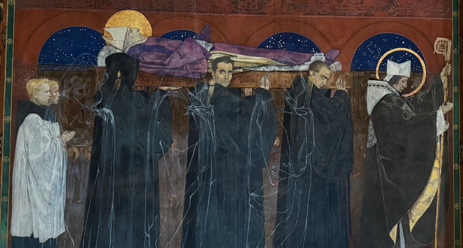 Одилон лежить на ношах, його несуть… і хто? Ченці в чорних шатах**. Але поруч із ними йдуть напівпрозорі духи померлих. Вони тримають смолоскипи, їхні обличчя освітлені світлом свічок. Вони моляться за Одилона, просячи вічного світла для того, хто колись молився за них.