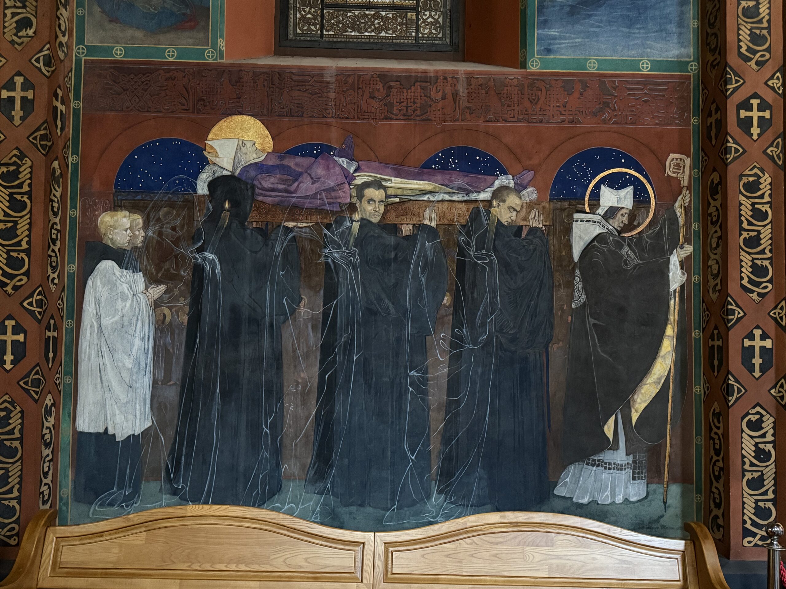 ** Щодо фрески Генрика Яна Розена «Поховання святого Одилона» варто додати, що ченці, зображені на ній, знаменують собою минуле (обличчя особи закрите каптуром), сьогодення (чернець повернувся і дивиться на людей), майбутнє (очі ченця закриті: майбутнє для нас закрите). На фресці Ян Розен зобразив обличчя своїх сучасників, а середній чернець – його автопортрет.