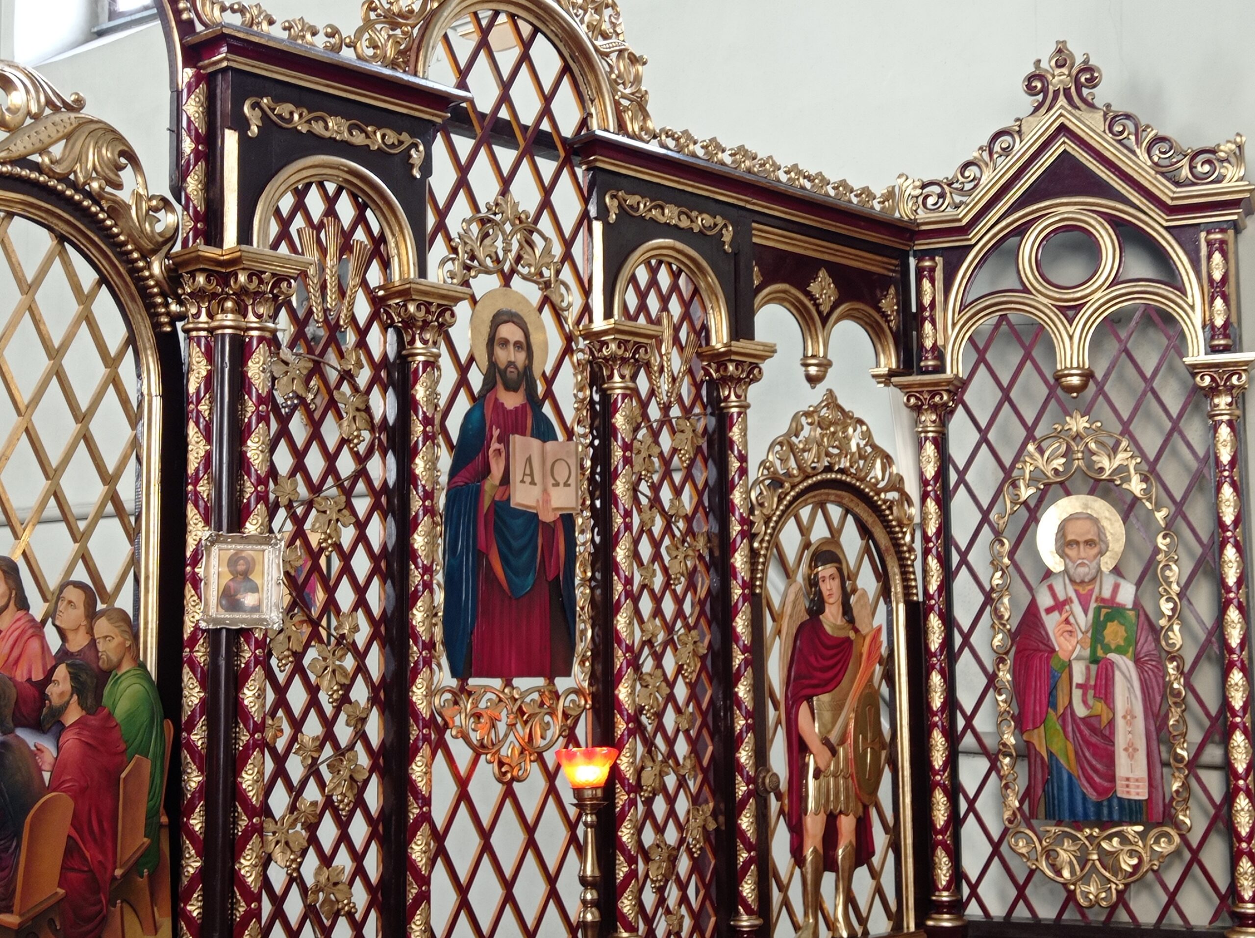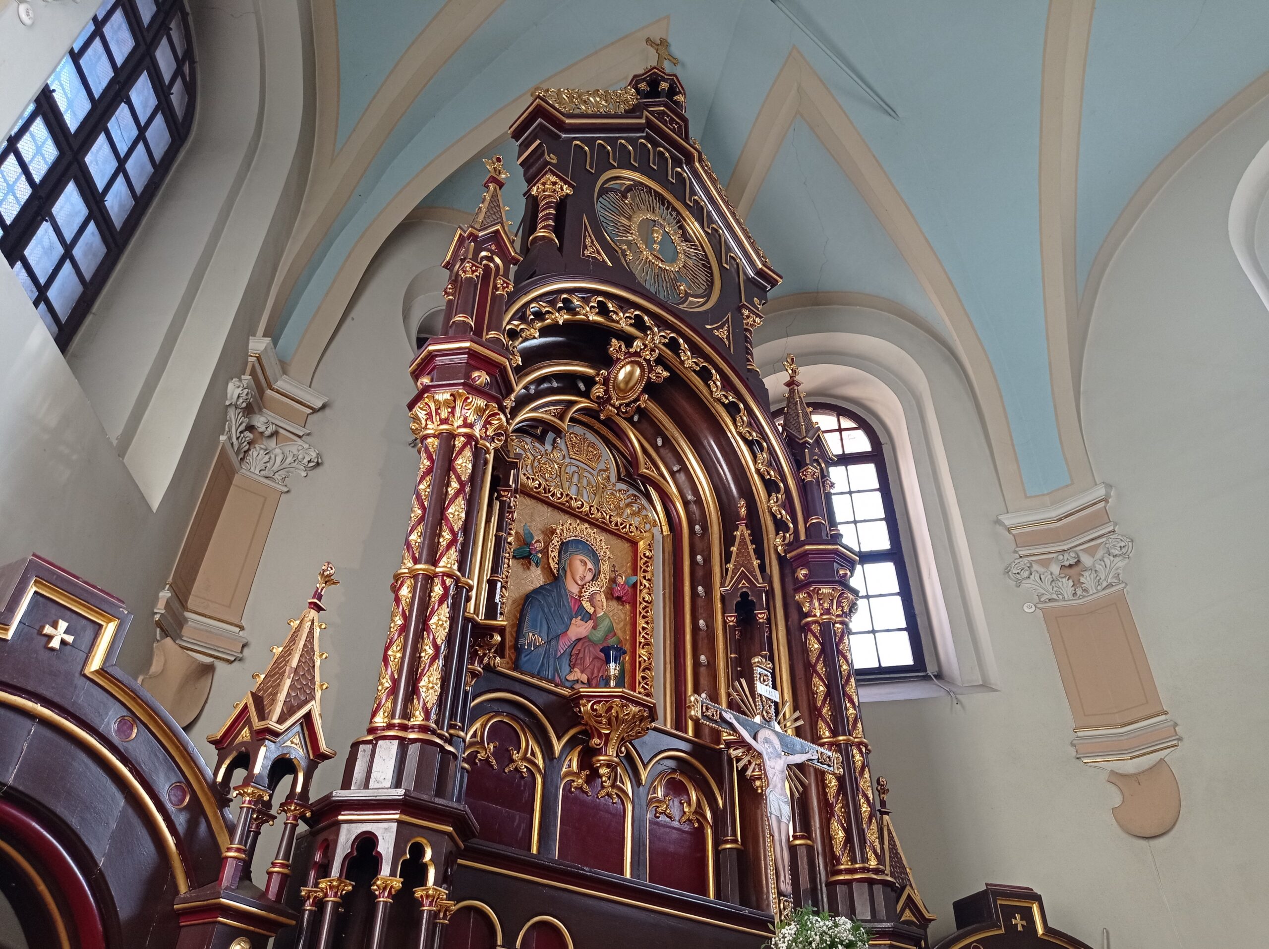 Цікавий і незвичайний елемент сучасного внутрішнього оздоблення храму – іконостас, що повторює за стилем центральний вівтар. Ікони тут виконані у вигляді барельєфів. Іконостас та два бокові престоли спорудили в храмі вже у дев’яностих роках. Центральний вівтар неодноразово реставрували, та водночас він потребує подальшого відновлення свого колишнього вигляду, адже багато його елементів відсутні. «Коли ми оглядали дзвіницю, то бачили багато дерев’яних елементів, які візуально є схожими на ці частини, і, можливо, нам вдасться їх колись відновити, реставрувати. Старі світлини теж нам показують, що тут були також дерев’яні лавки для священнослужителів, а у храмі вірних – для людей, та в більшості, на жаль, ці елементи є втрачені», – зазначив о. Роман Прокопець.