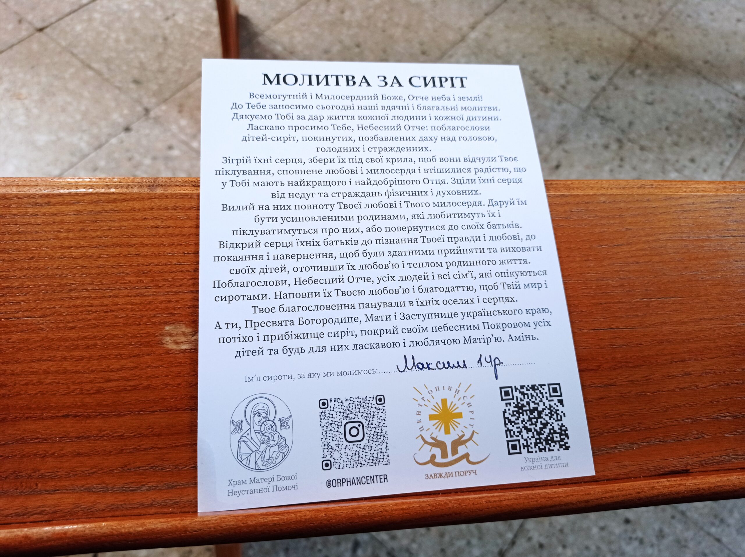 Окрім активностей та корисних заходів, що привертають увагу до справи усиновлення, у храмі Матері Божої Неустанної Помочі триває постійна молитва за сиріт. Для цього на тетраподі та неподалік від входу у вільному доступі розміщені спеціальні символічні образки Пресвятої Родини з іменем дитини-сироти. Люди можуть брати такі образочки додому і молитися за цю конкретну дитину в своїх сім’ях і родинах. З них також можна дізнатися про «Центр опіки сиріт» і можливості усиновлення.