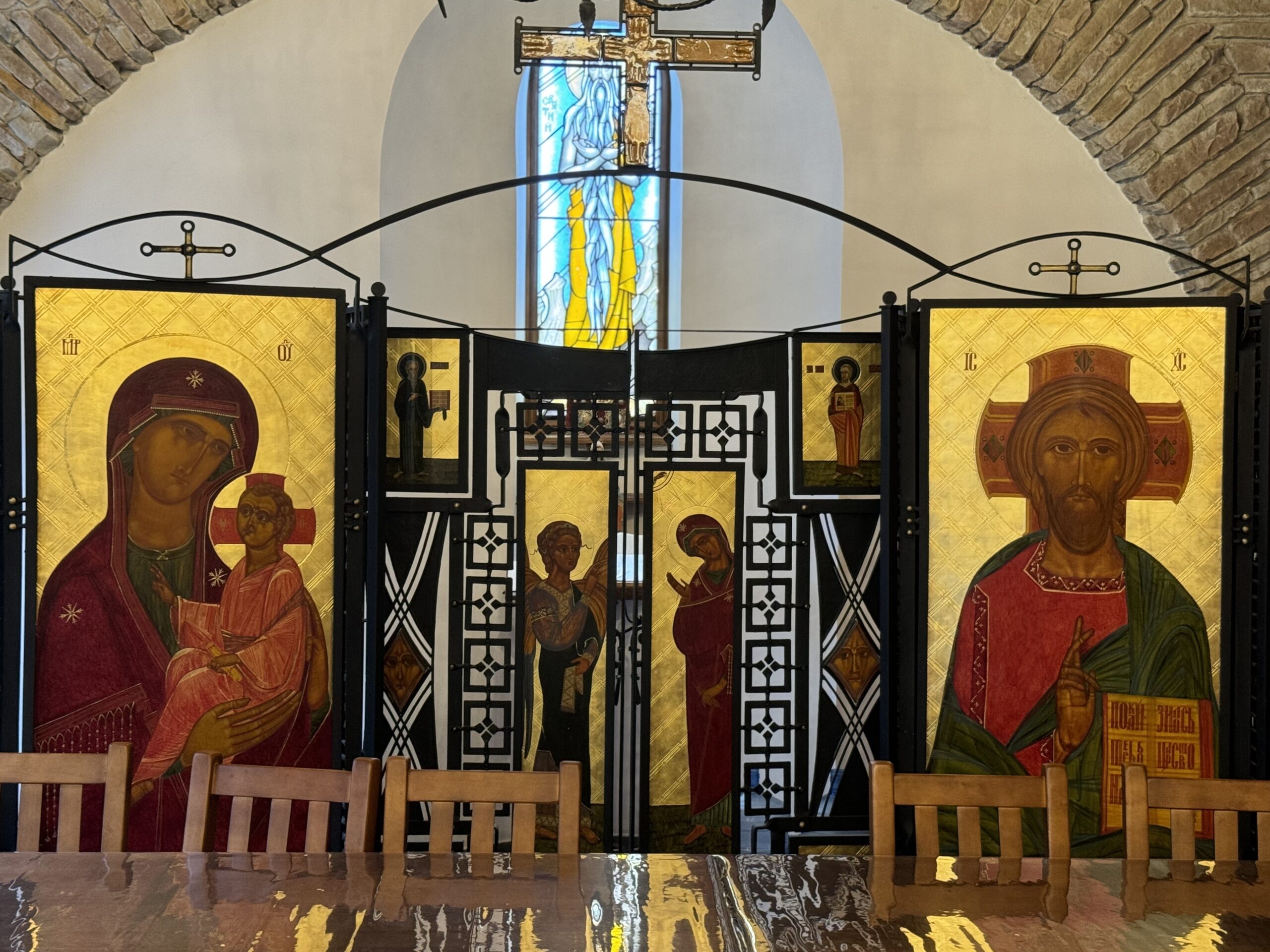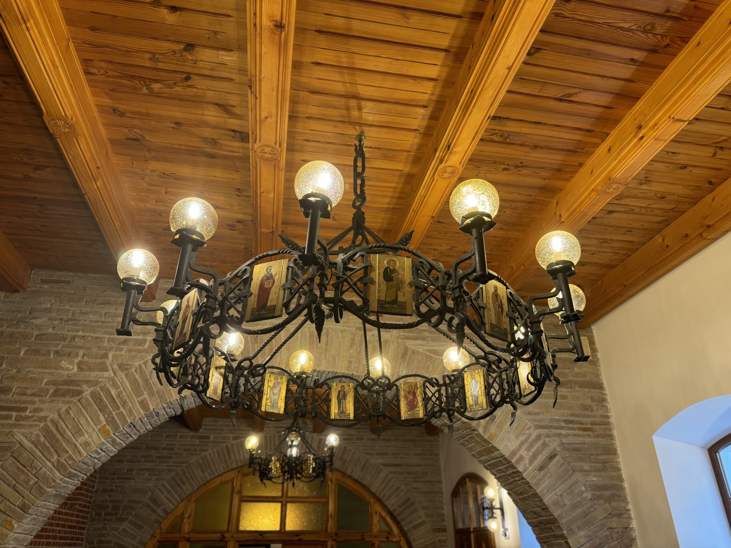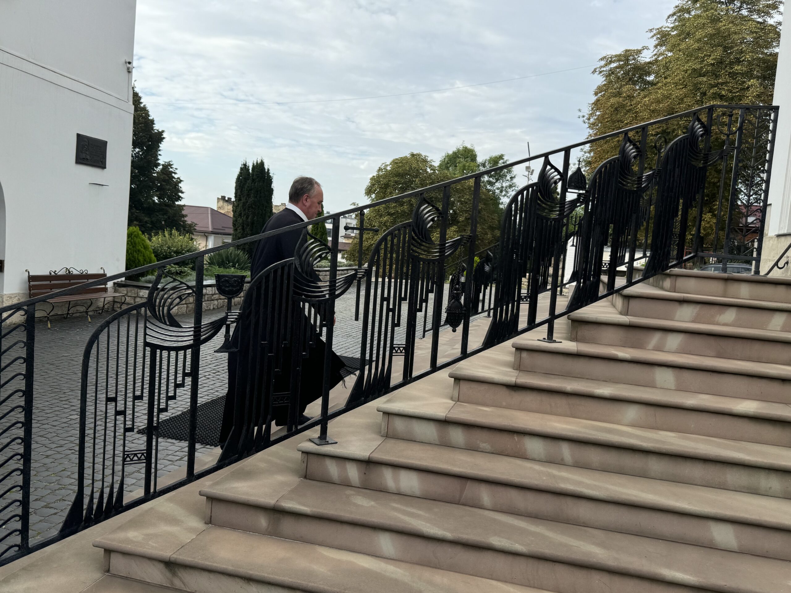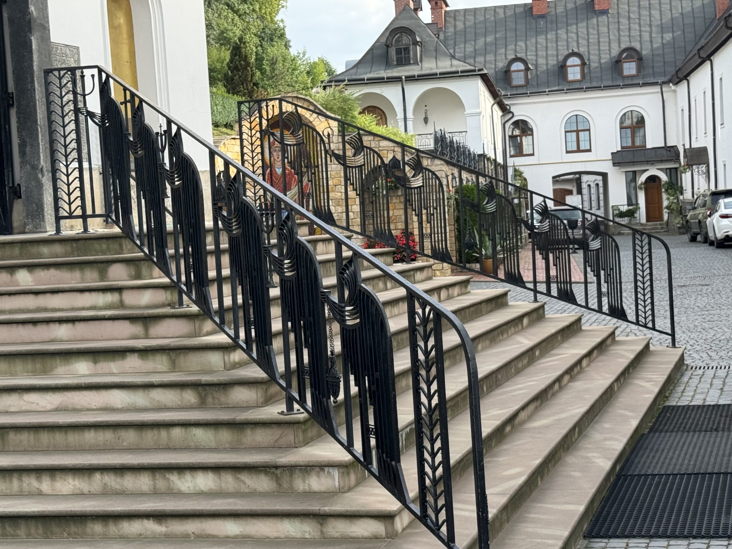 Великою окрасою церковних сходів є ковані металеві поручні, які проєктував і виготовляв талановитий митець Олег Боньковський в 1998 році. З двох сторін по діагоналі бачимо ченців, які перебувають у русі, в роздумах. Створюється