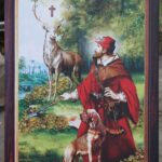 Святий Губерт – єпископ Льєжа, вважається покровителем мисливців, єгерів, лучників, лісників та мисливських собак. Народився в 650-х у Тулузі (Франція) в родині Бертрана, герцога Аквітанського. За переказами, замолоду Губерт був пристрасним мисливцем і шанувальником світських розваг; після смерті дружини при пологах повністю присвятив себе мисливству. Вранці Страсної П’ятниці Губерт вирушив на полювання і побачив у лісі надзвичайно красивого оленя. Він погнався за ним, та як тільки націлив на звіра зброю, той обернувся і між його рогами засвітився хрест. У той самий момент мисливець почув голос, що закликав його до покаяння; за легендою, пролунали слова: «Чи не час уже перестати звірину убивати, чи не час тобі уже Бога шукати?!». Вражений мисливець відмовився від усіх своїх титулів і спадщини на користь молодшого брата Одо, що став опікуном його сина, а сам ступив на дорогу священства. Пізніше Губерт був обраний єпископом Льєжа і здобув велику шану і любов серед вірних. Він помер у 727 році, а в 1744 римський папа Бенедикт XIV канонізував його.