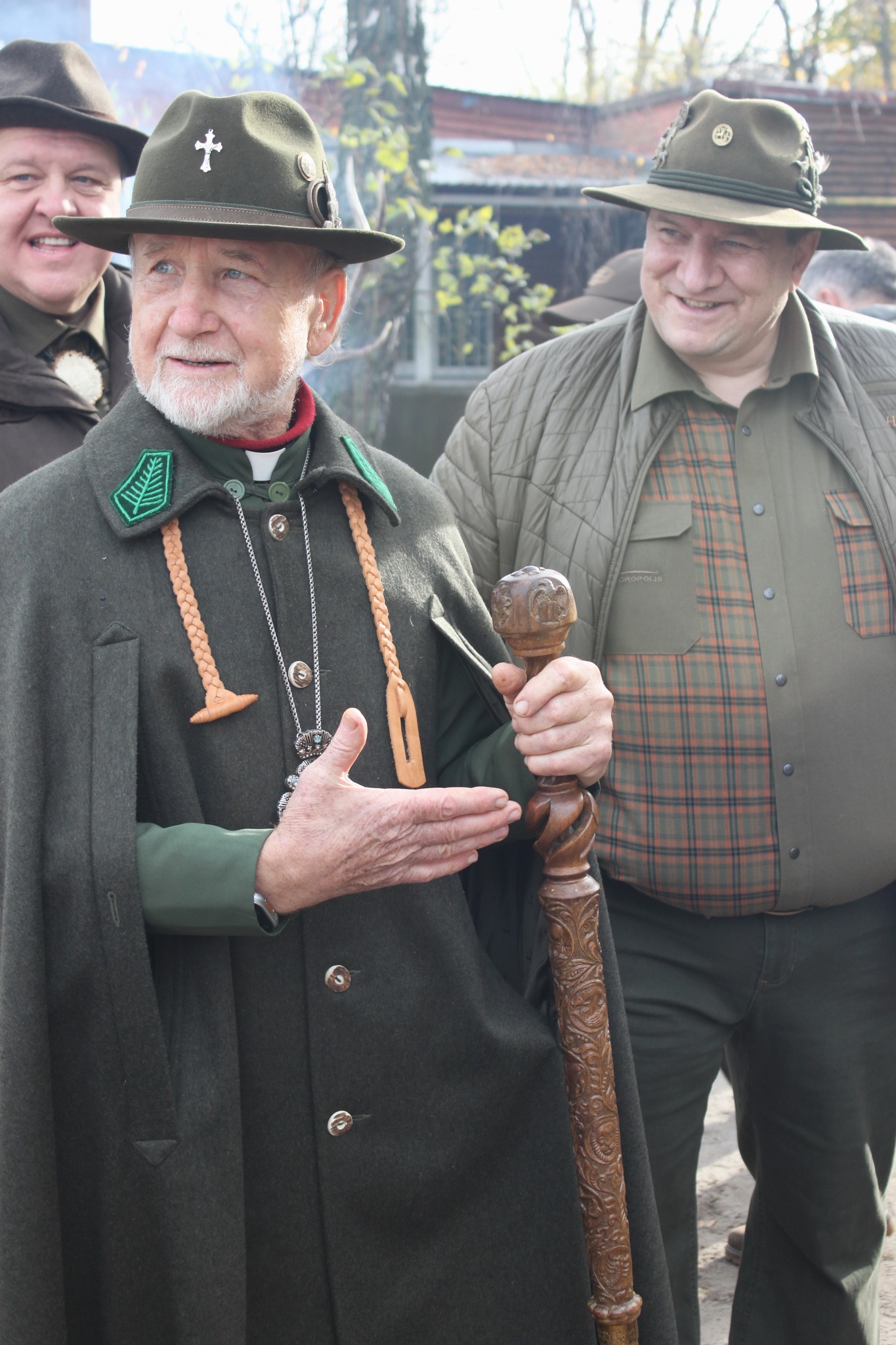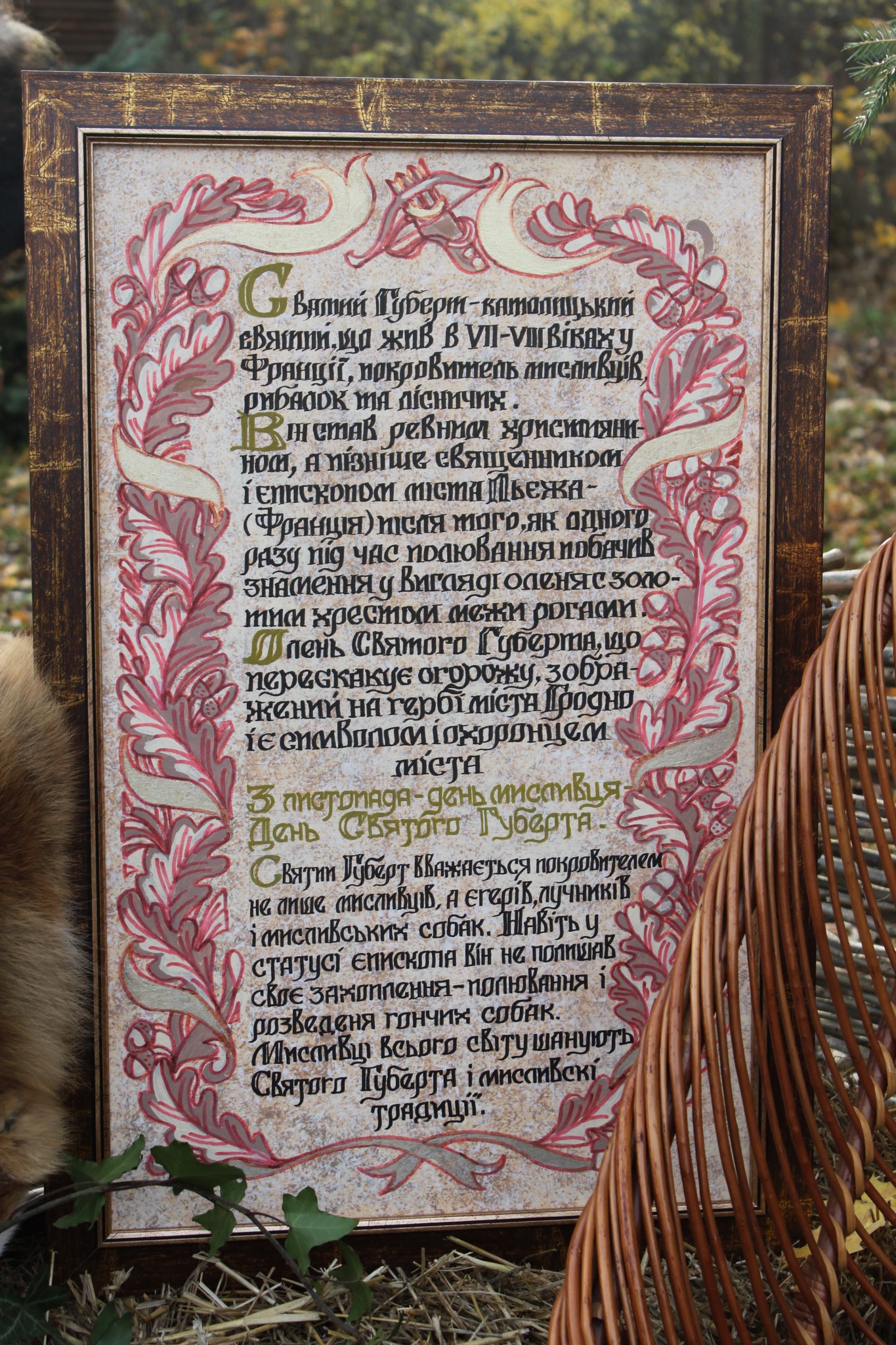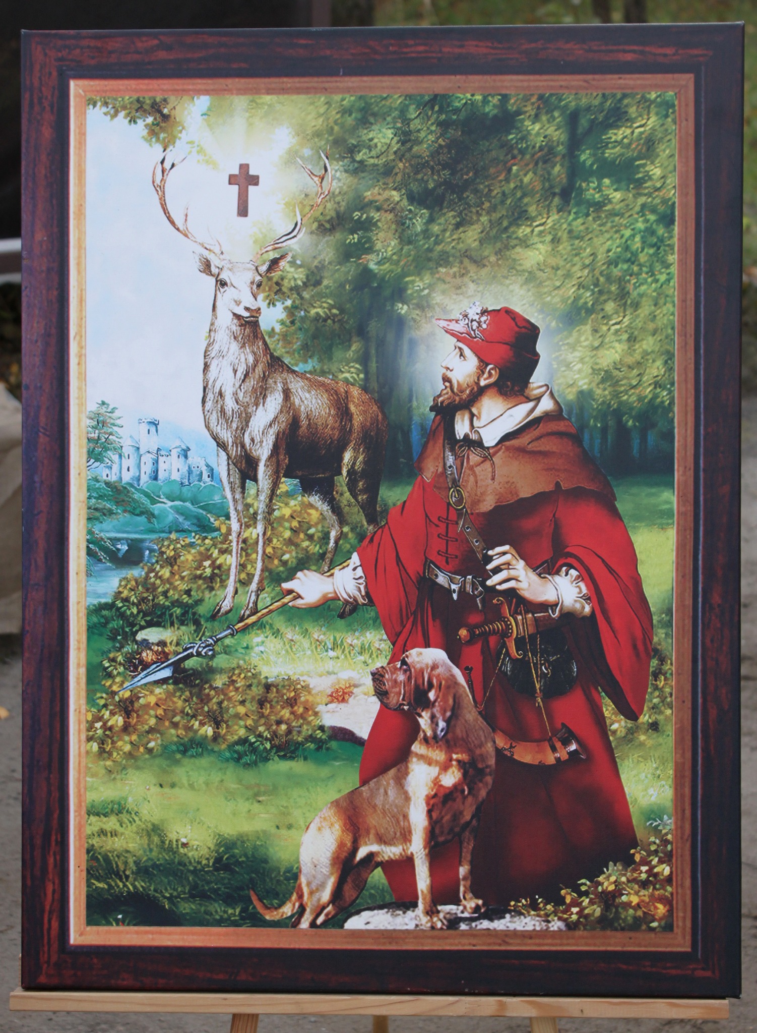 Святий Губерт – єпископ Льєжа, вважається покровителем мисливців, єгерів, лучників, лісників та мисливських собак. Народився в 650-х у Тулузі (Франція) в родині Бертрана, герцога Аквітанського. За переказами, замолоду Губерт був пристрасним мисливцем і шанувальником світських розваг; після смерті дружини при пологах повністю присвятив себе мисливству. Вранці Страсної П’ятниці Губерт вирушив на полювання і побачив у лісі надзвичайно красивого оленя. Він погнався за ним, та як тільки націлив на звіра зброю, той обернувся і між його рогами засвітився хрест. У той самий момент мисливець почув голос, що закликав його до покаяння; за легендою, пролунали слова: «Чи не час уже перестати звірину убивати, чи не час тобі уже Бога шукати?!». Вражений мисливець відмовився від усіх своїх титулів і спадщини на користь молодшого брата Одо, що став опікуном його сина, а сам ступив на дорогу священства. Пізніше Губерт був обраний єпископом Льєжа і здобув велику шану і любов серед вірних. Він помер у 727 році, а в 1744 римський папа Бенедикт XIV канонізував його.