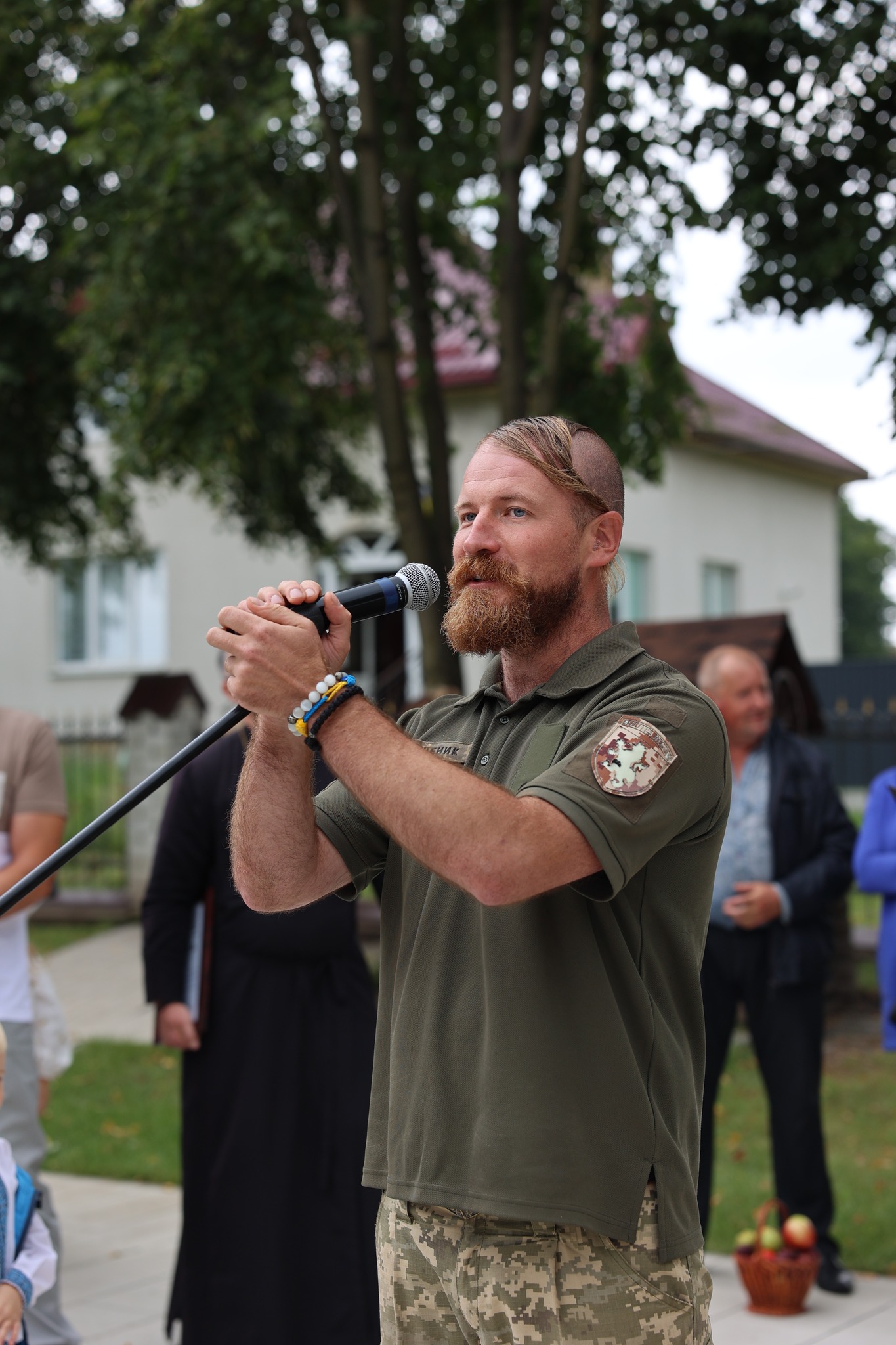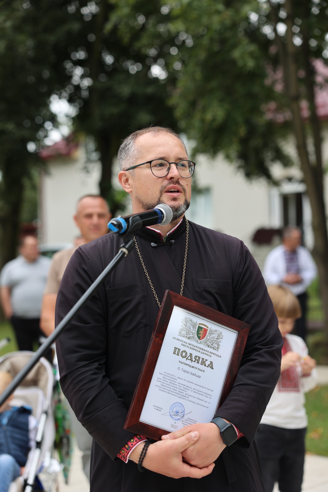 Також перед громадою від імені керівництва підрозділу виступив військовослужбовець Андрій Вітрів. Він поділився історією бойової звитяги «королівської» бригади і представив актуальні на цей час потреби. А також вручив відзнаку адміністратору парафії Преображення о. Тарасу Байцару за внесок, який громада здійснює у підтримку ЗСУ.