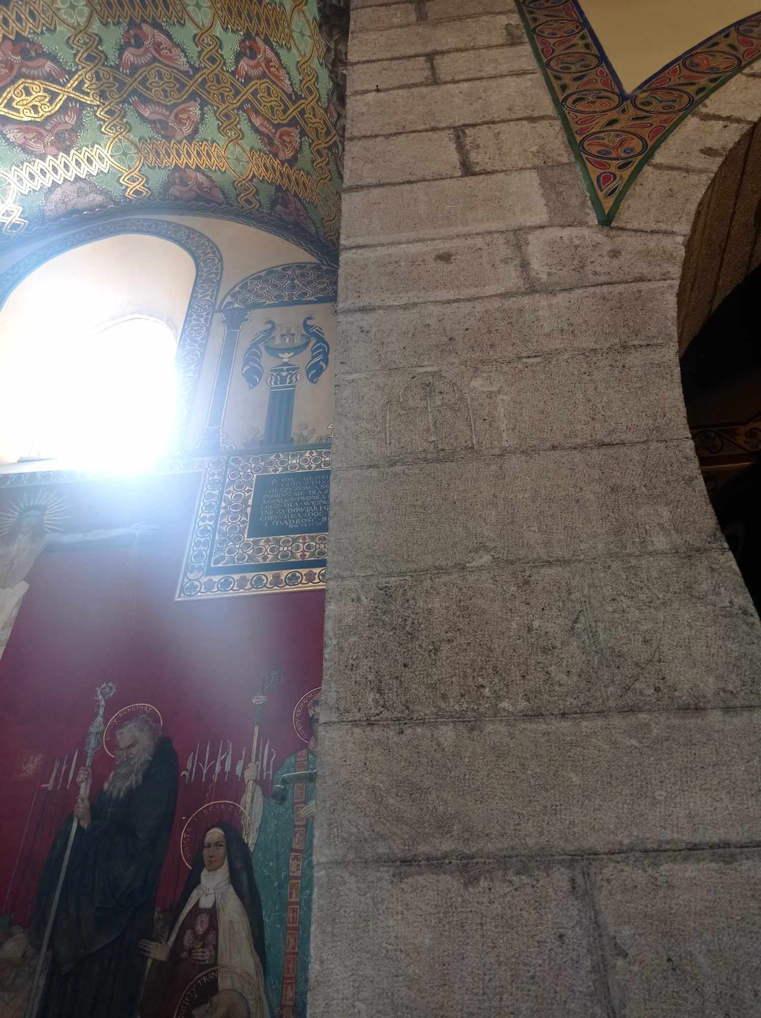 Ще одна цікавинка – різьблені хрестики на стінах біля Святилища храму. «Ці хрестики в різні часи різні люди лишали для молитовної згадки, щоб наступні покоління молилися за них, на знак вдячності Богові, з 14 до 17 століття. Вони мають орнаменти і подібні на якір – таким чином перші християни зображали хрест, навіть ще в катакомбах. І вірмени теж, подібно до давніх християн. В Єрусалимі багато таких знаків якоря. Це символ хреста і символ твердості віри, символ, що хрест є якір для нас, який наш човен стримує на хвилях моря життя. Орнаменти зображають квітучий хрест, бо Христос воскрес та смертю смерть подолав», – зауважив диякон.