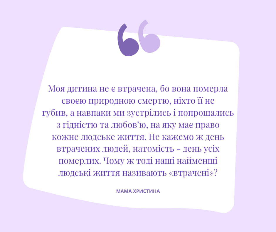 Мама Христина: «Моя дитина не є втрачена, бо вона померла своєю природною смертю, ніхто її не губив а навпаки ми зустрілись і попрощались з гідністю та любов’ю, на яку має право кожне людське життя. Не кажемо ж день втрачених людей, натомість – день усіх померлих. Чому ж тоді наші найменші людські життя називають “втрачені”?»