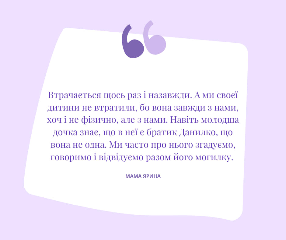 Мама Ярина: «Втрачається щось раз і назавжди. А ми своєї дитини не втратили, бо вона завжди з нами, хоч і не фізично, але з нами. Навіть молодша дочка знає, що в неї є братик Данилко, що вона не одна. Ми часто про нього згадуємо, говоримо і відвідуємо разом його могилку»