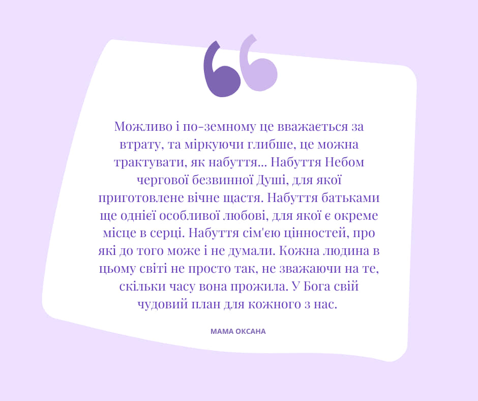 Мама Оксана: «Можливо і по земному це вважається за втрату, та міркуючи глибше, це можна трактувати, як набуття… Набуття Небом чергової безвинної Душі, для якої приготовлене вічне щастя. Набуття батьками ще однієї особливої любові, для якої є окреме місце в серці. Набуття сім’єю цінностей, про які до того може і не думали. Кожна людина в цьому світі не просто так, не зважаючи на те, скільки часу вона прожила. У Бога свій чудовий план для кожного з нас»