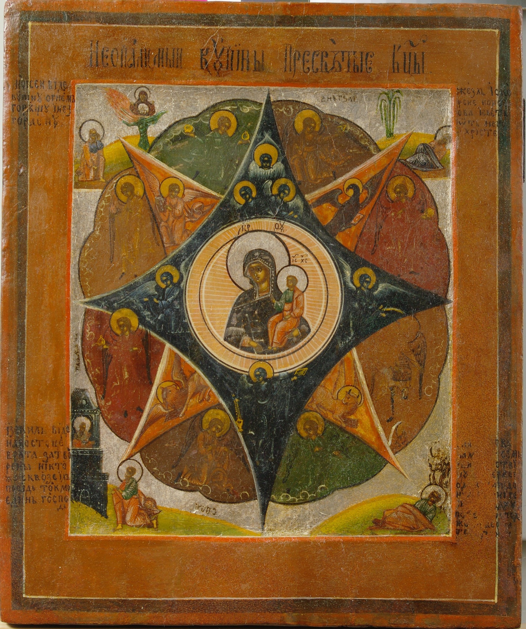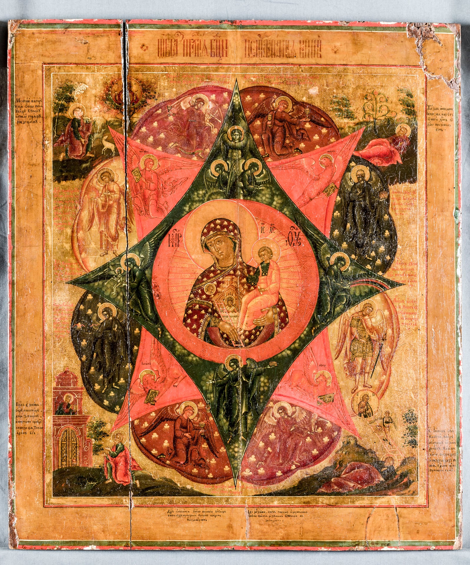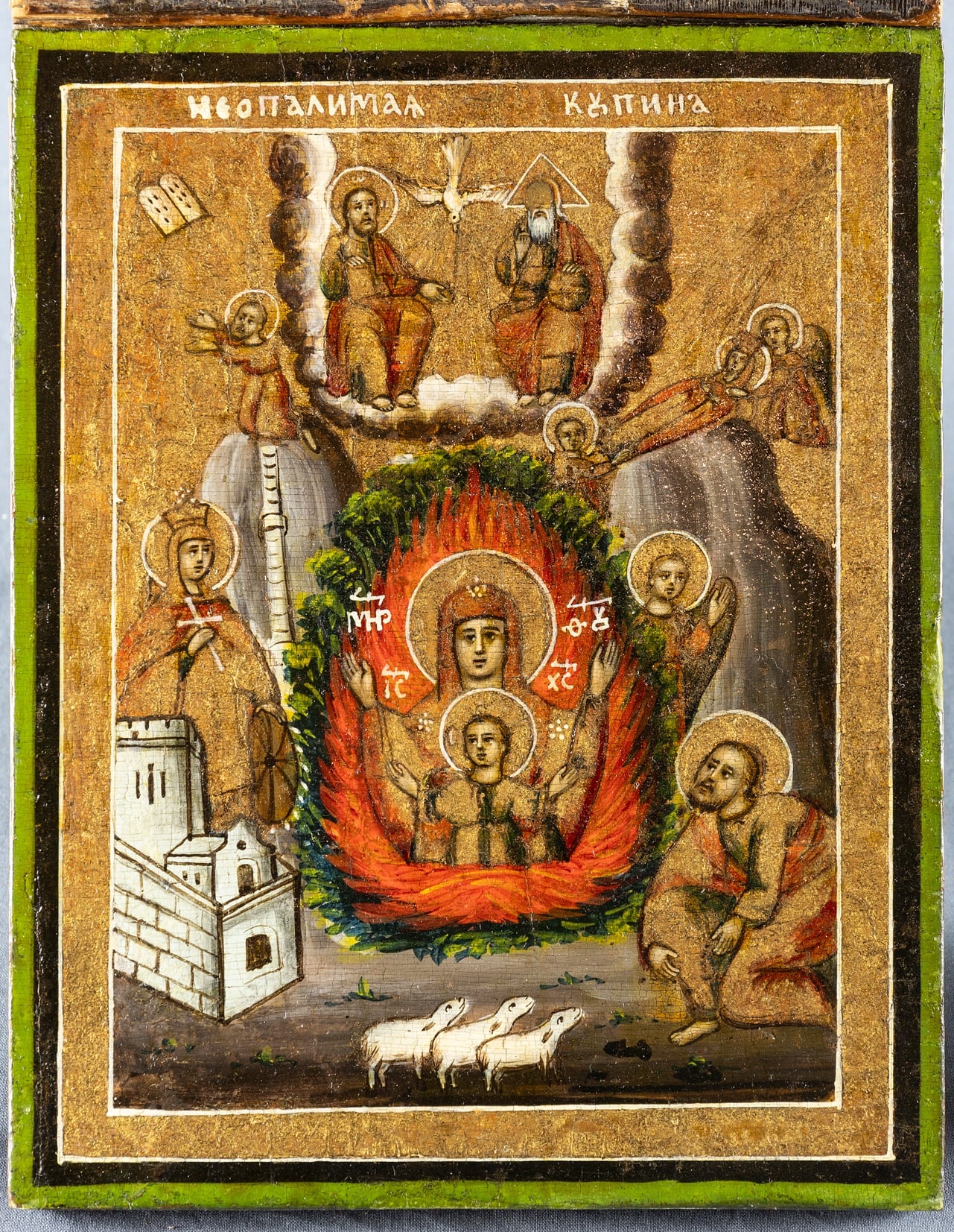 «Назва ікони походить від старозавітного прообразу, що вказував на Богоматір: неопалима купина це кущ, який палав у вогні, але не згорав (Вих. 3:2)…За переказами, першообраз ікони Богородиці “Неопалима Купина ” був написаний на камені тієї скелі, де до Мойсея звернувся Бог з палаючого куща», — йдеться у публікації музею.