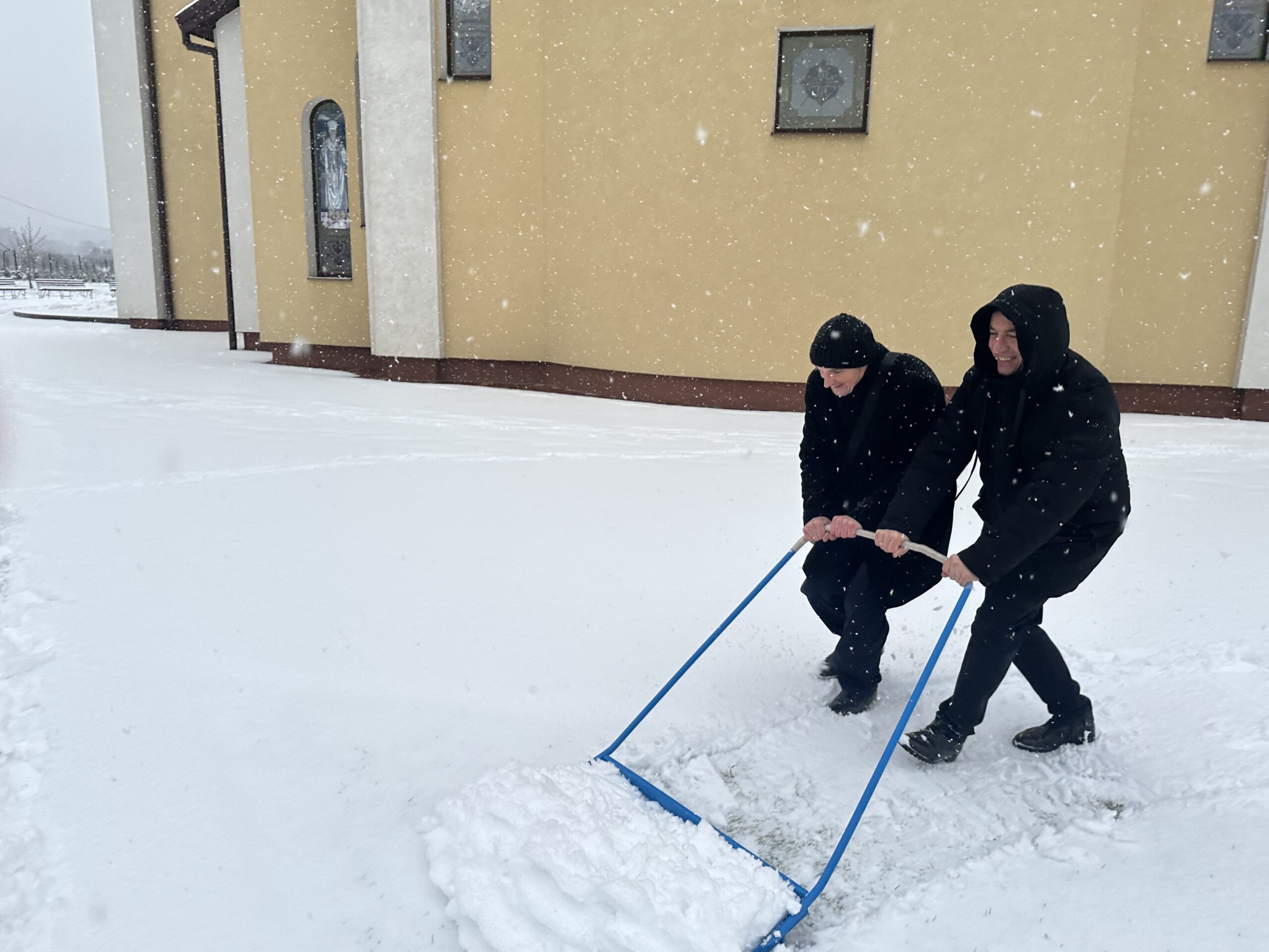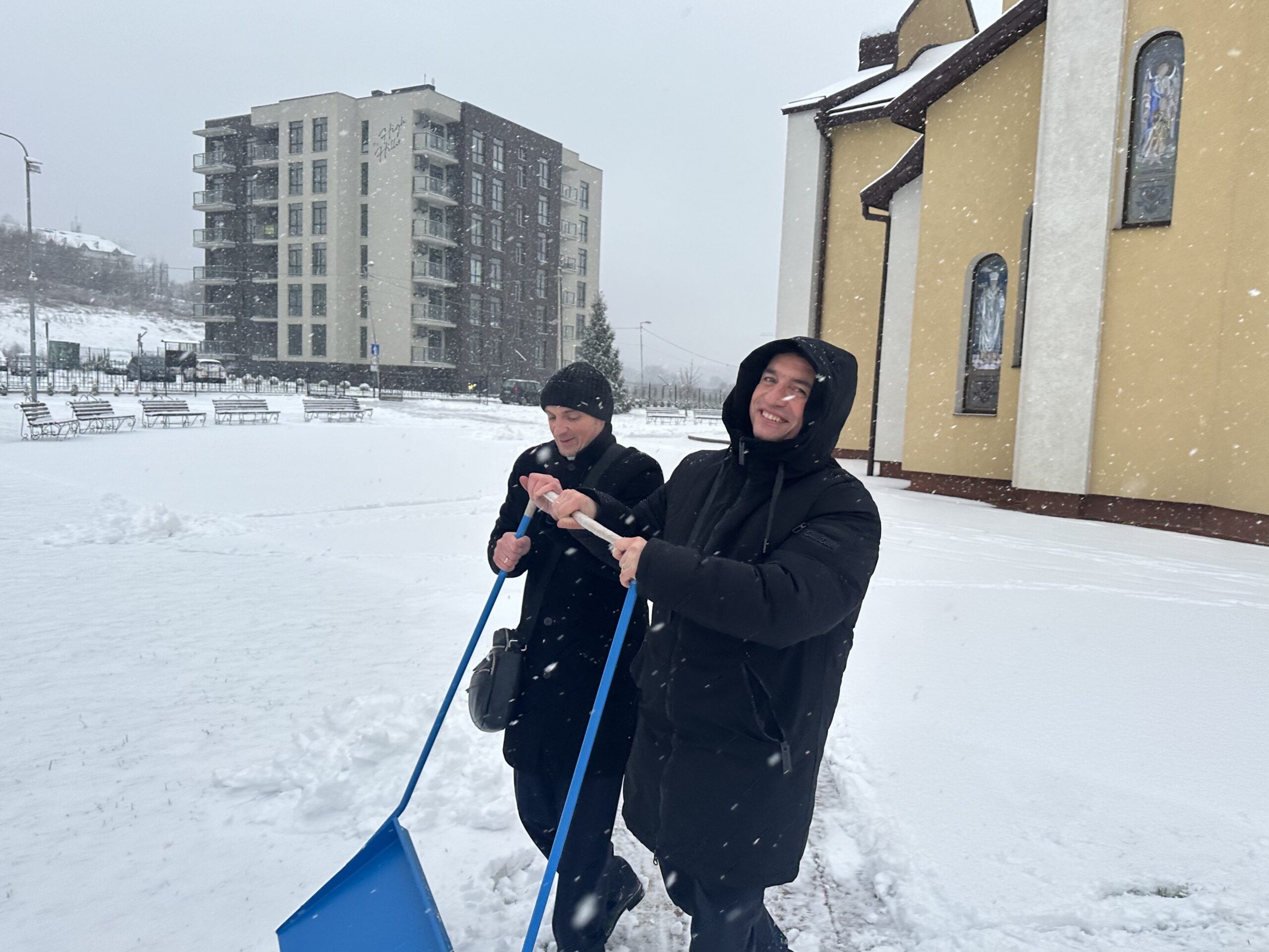 Отця Андрія Корчагіна я застав за прибиранням території храму від снігу, допомагав йому інший священник, відповадальний за медичне капеланство у Львівськй Архиєпархії УГКЦ о.Тарас Гадомський. Фото: Андрій Толстой