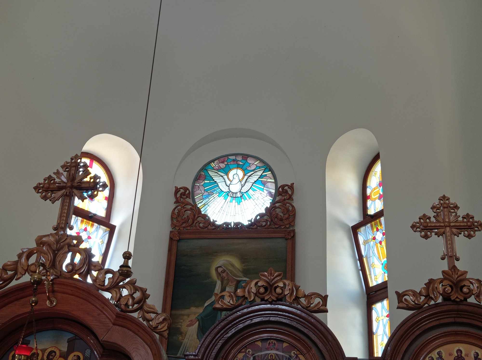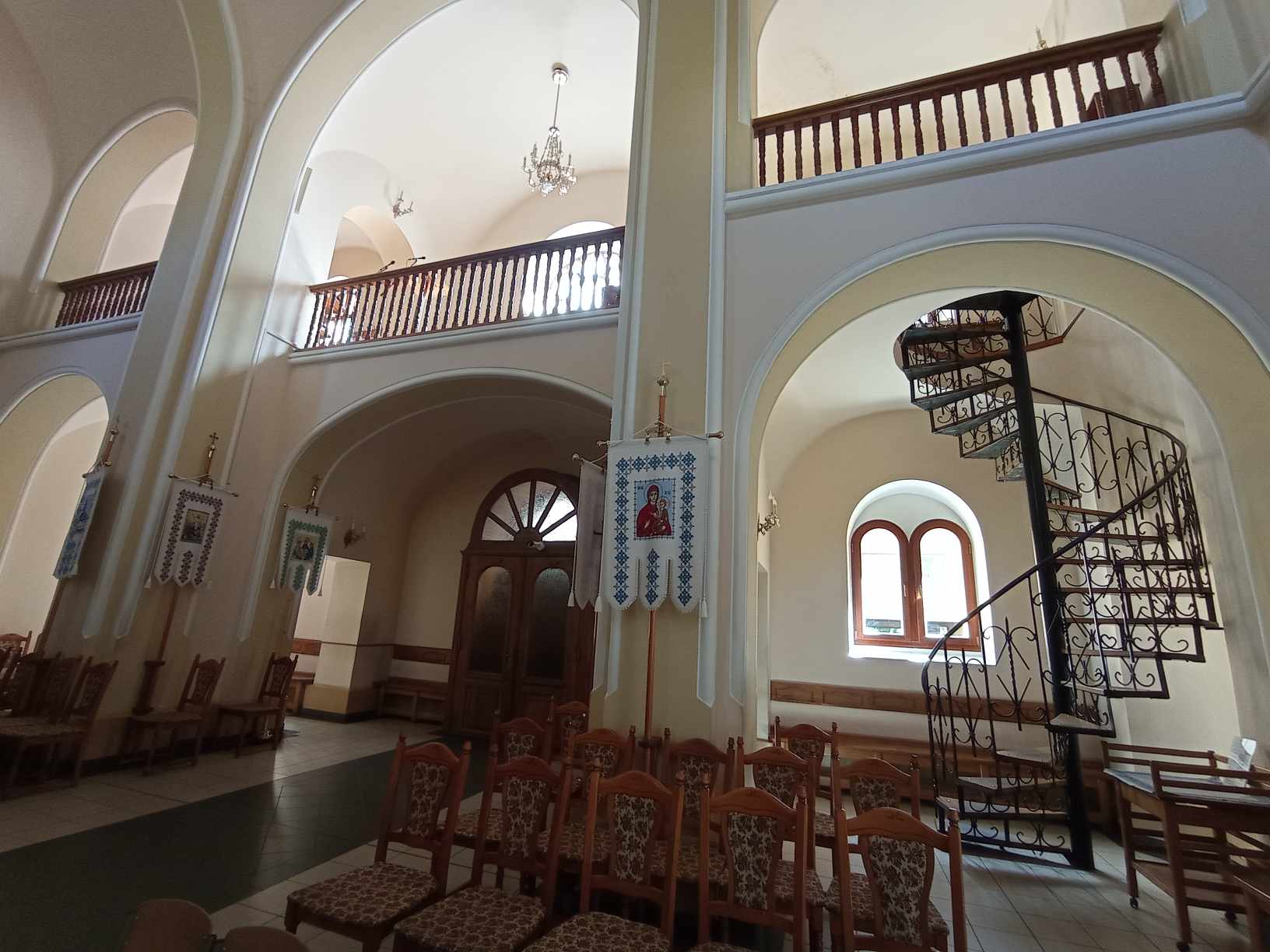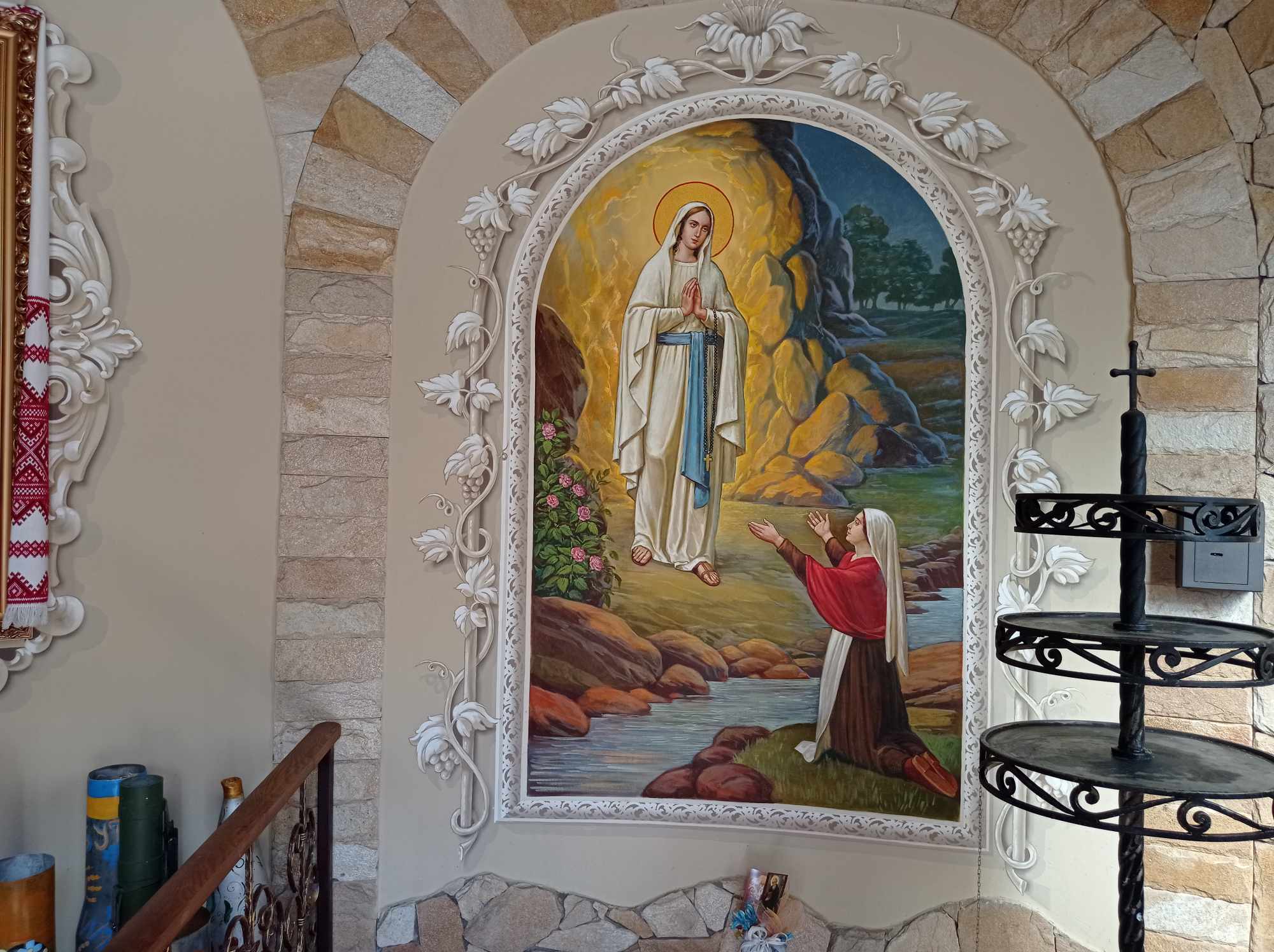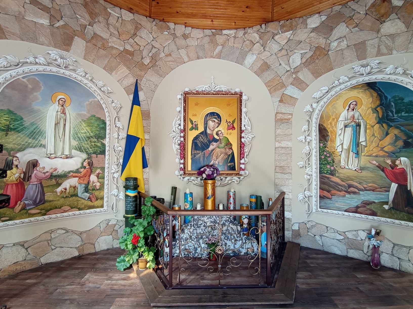 На вітражах каплиці – засновник редемптористів святий Альфонс Ліґуорі та святий Герард. Всередині – ікона Матері Божої Неустанної Помочі, якою опікуються редемптористи, а також два відомі об’явлення Богородиці – у Фатімі та Люрді