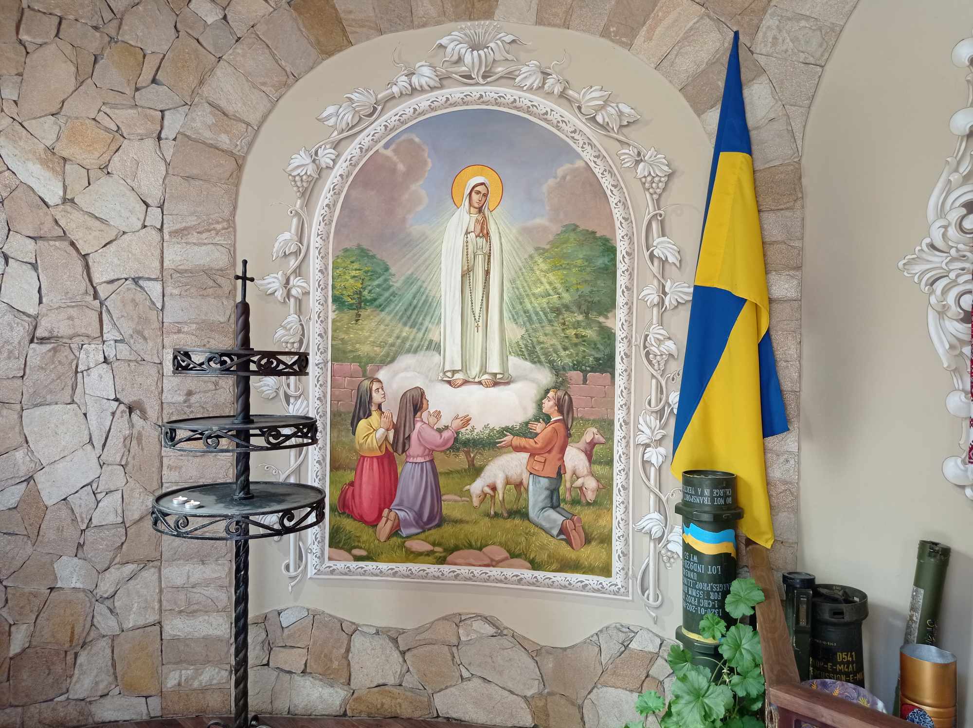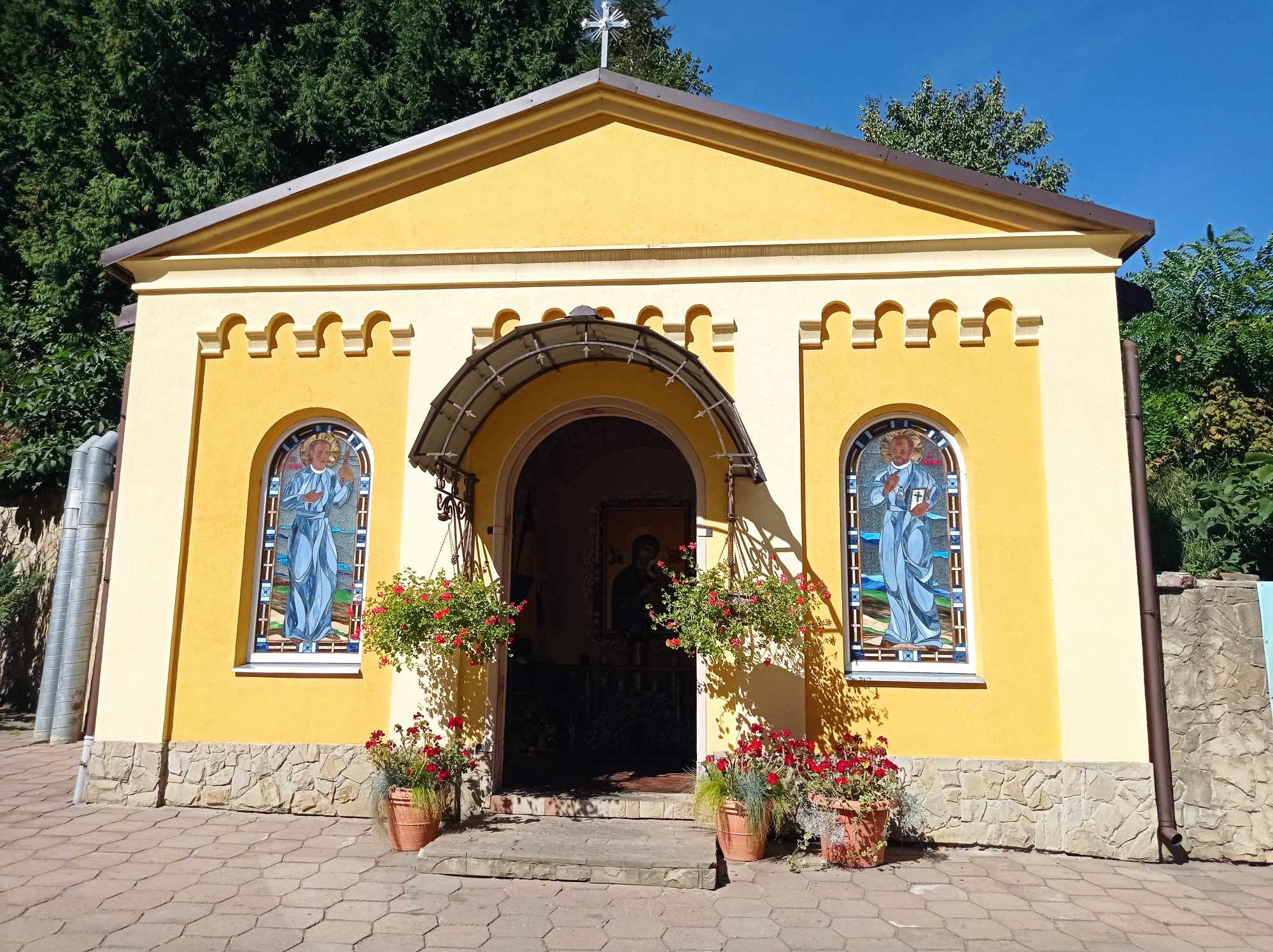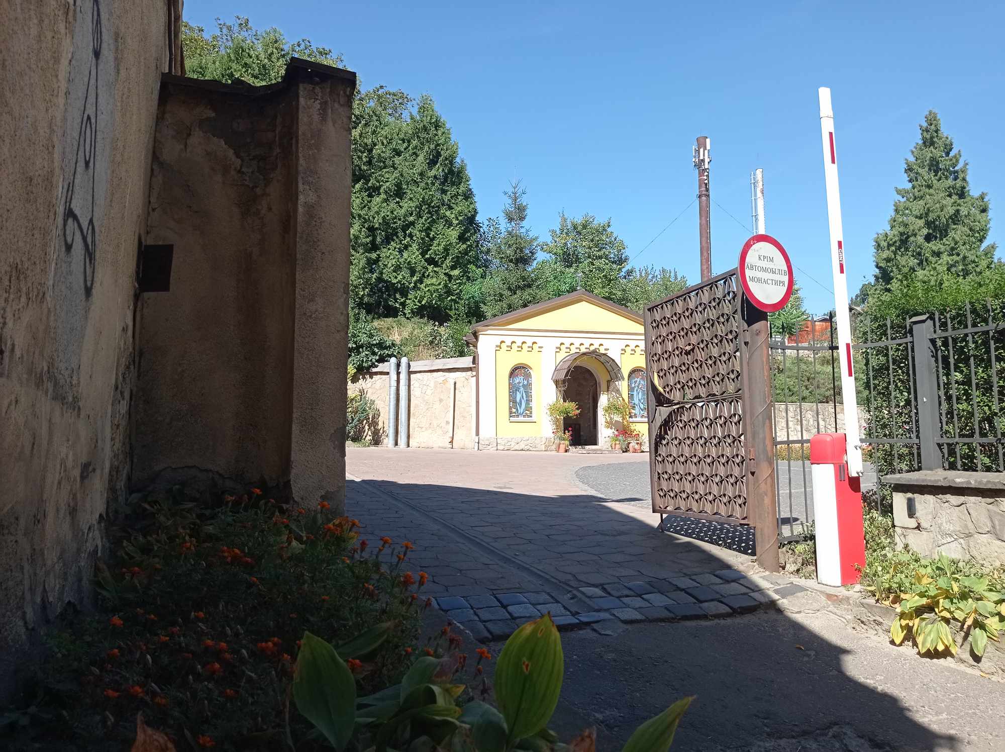 На подвір’ї розташована невелика каплиця – сюди люди також часто приходять на молитву. В каплиці можна побачити розфарбовані гільзи. Отець Віталій розповів, що це – дарунок військових, для яких неодноразово тут проводять збірки. Зокрема, монастир підтримує львівських військових, що воюють на різних напрямках.
