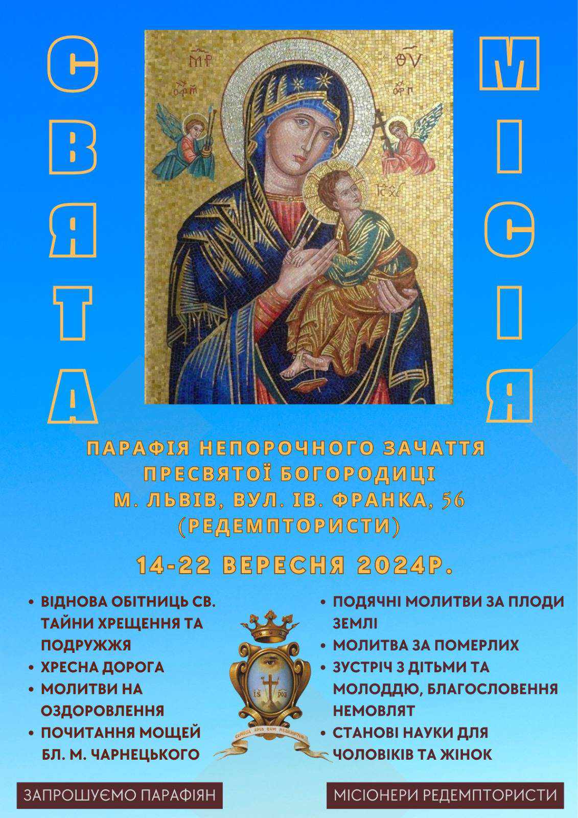 Місійна діяльність – одна з особливих рис Згромадження Найсвятішого Ізбавителя. Тому вже 14 вересня Отці редемптористи та сестри Василіянки запрошують львів’ян та гостей міста на Святу Місію до храму Непорочного Зачаття.