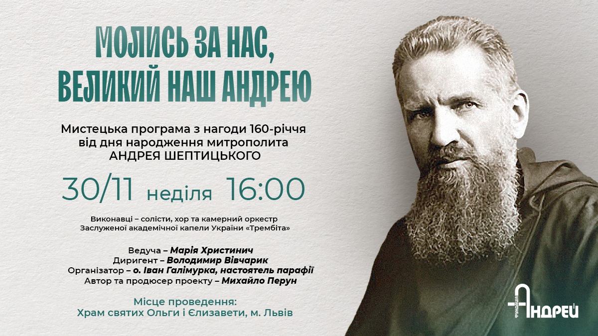 Мистецька програма «Молись за нас, великий наш Андрею…» присвячена 160-річчю від дня народження Митрополита Андрея Шептицького. Організатори щиро запрошують всіх охочих цим творчим заходом ушанувати пам’ять видатного предстоятеля Греко-католицької церкви.