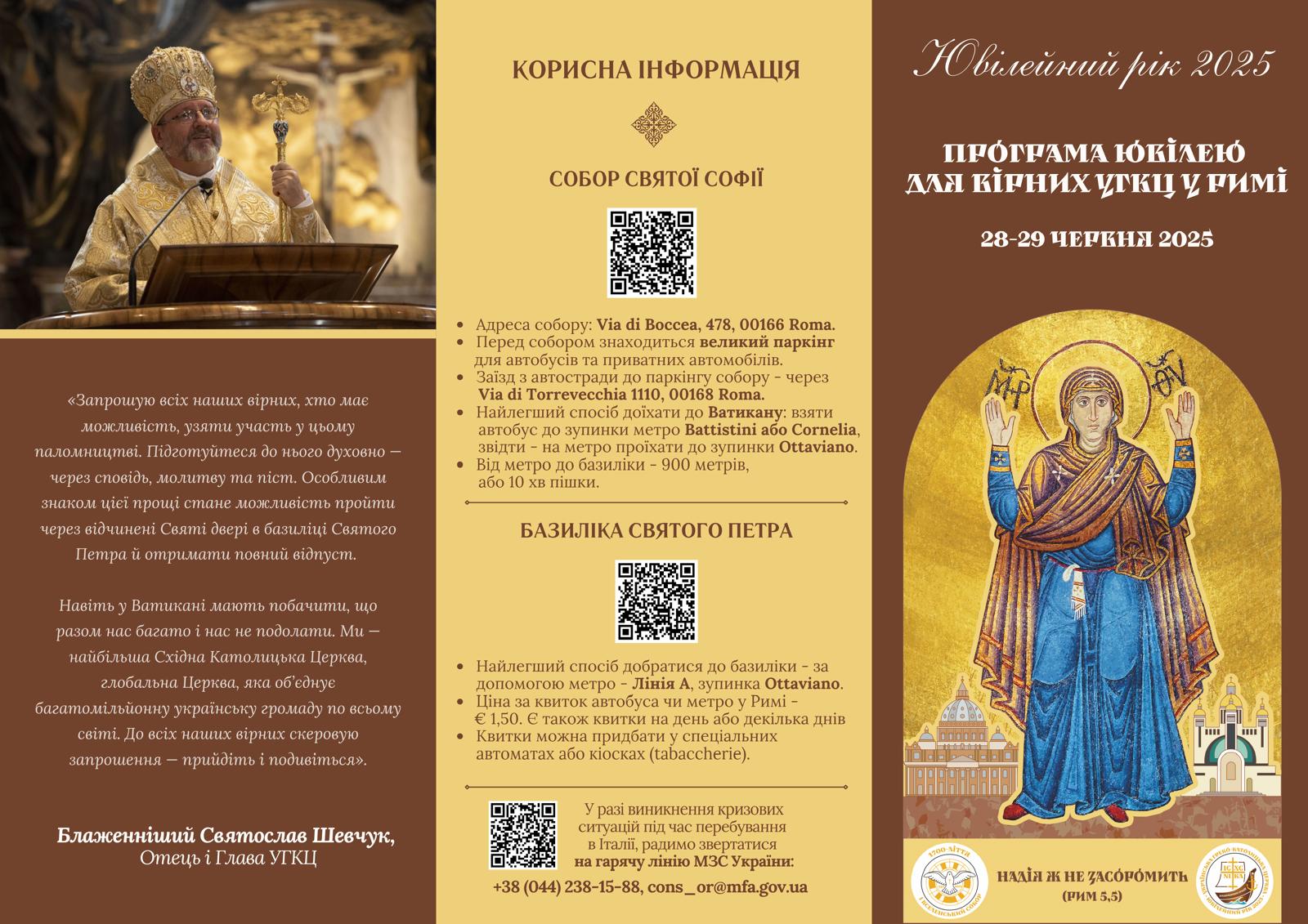 «Запрошую всіх наших вірних, хто має можливість, узяти участь у цьому паломництві. Підготуйтеся до нього духовно — через сповідь, молитву та піст. Особливим знаком цієї прощі стане можливість пройти через відчинені Святі двері в базиліці Святого Петра й отримати повний відпуст. Навіть у Ватикані мають побачити, що разом нас багато і нас не подолати. Ми — найбільша Східна Католицька Церква, глобальна Церква, яка об’єднує багатомільйонну українську громаду по всьому світі. До всіх наших вірних скеровую запрошення — прийдіть і подивіться», – наголосив Блаженніший Святослав.