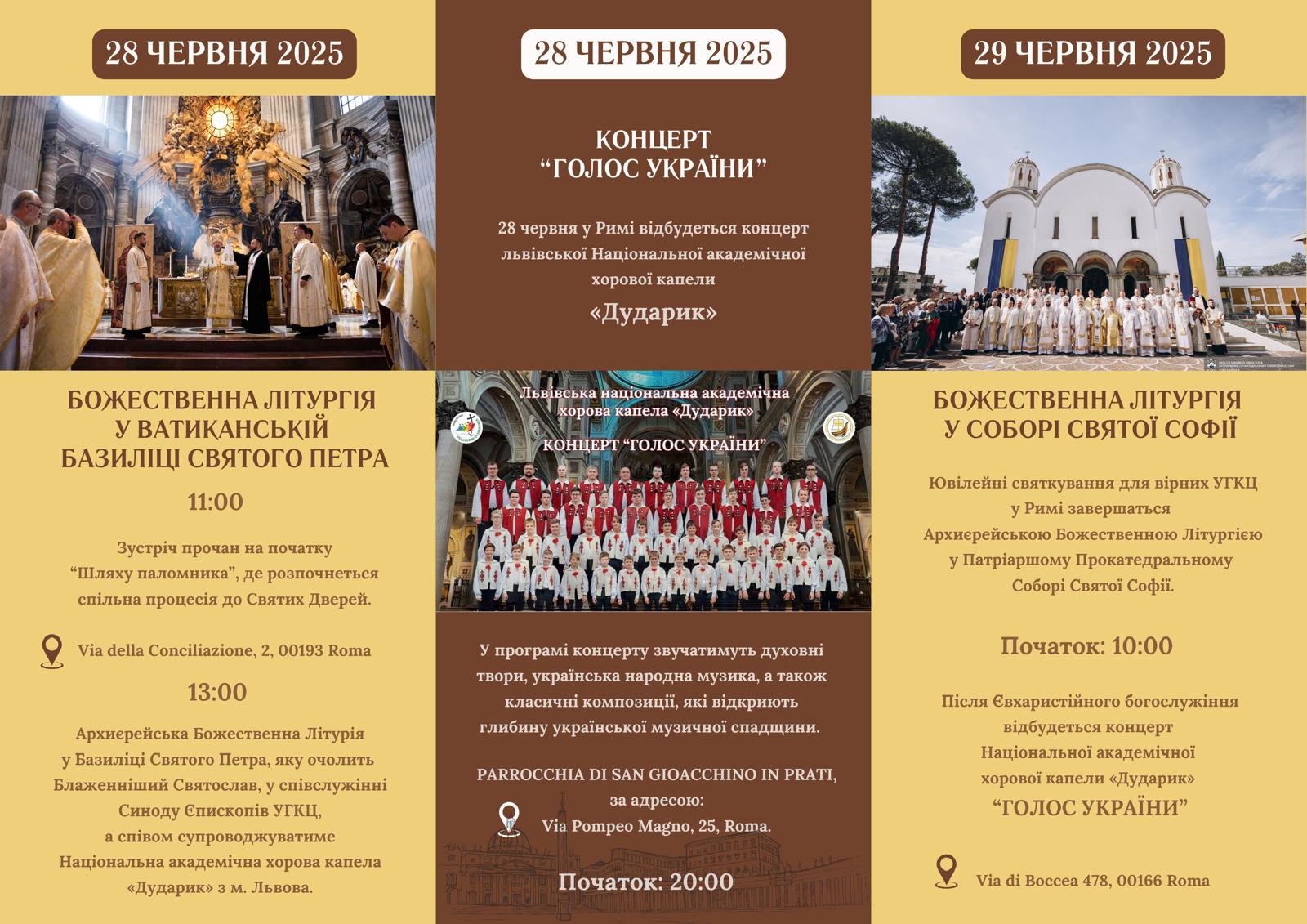 В рамках паломництва 28-29 червня запланована також Божественна Літургія у Прокатедральному соборі святої Софії у Римі та концерти львівської Національної академічної хорової капели «Дударик».