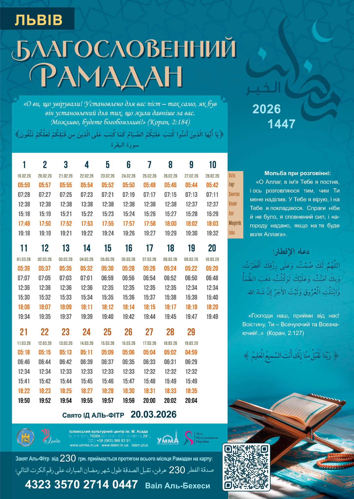 Імам Ібрагім: Перший день посту цього року випадає на 19 лютого, в четвер, але розпочинаємо ми піст молитвою в середу. Рамадан прив’язаний до ісламського календаря, а він – місячний. Це означає, що він залежить від положення Місяця: молодик, перша чверть, повня і так далі. І якраз у ніч на 19 лютого випадає початкова фаза Місяця. А оскільки це місячний календар, то Рамадан щороку зміщується приблизно на 10 днів.