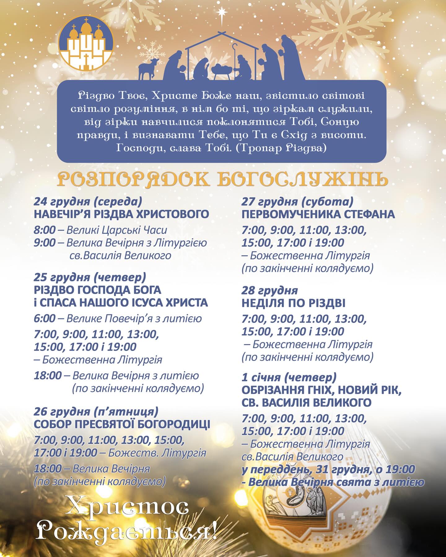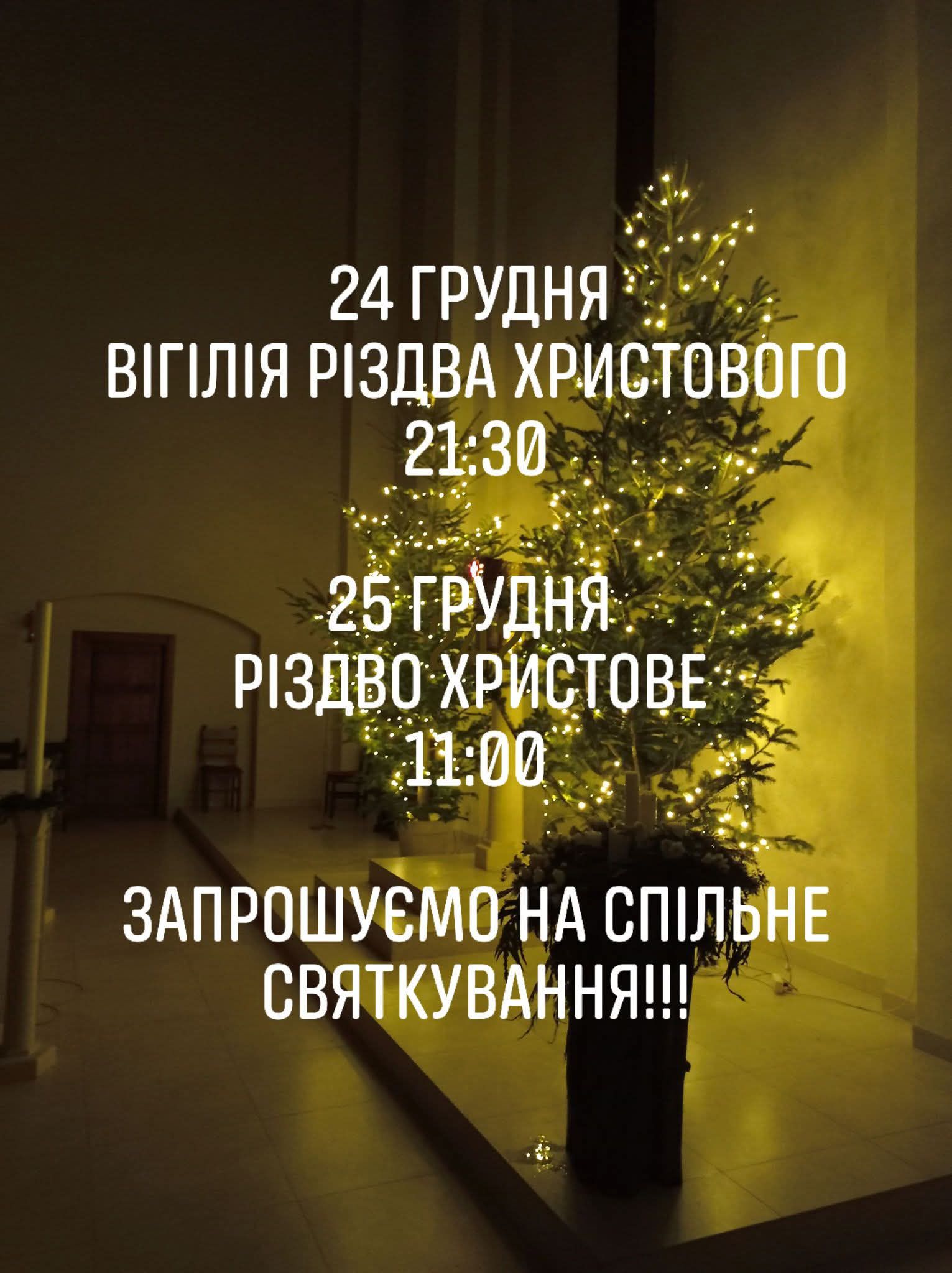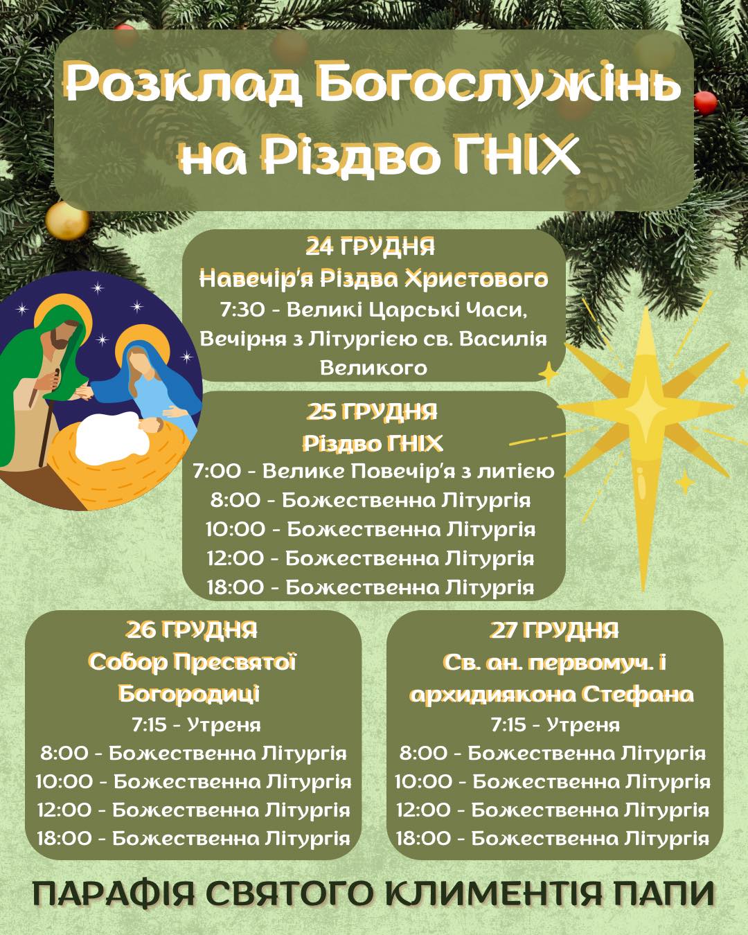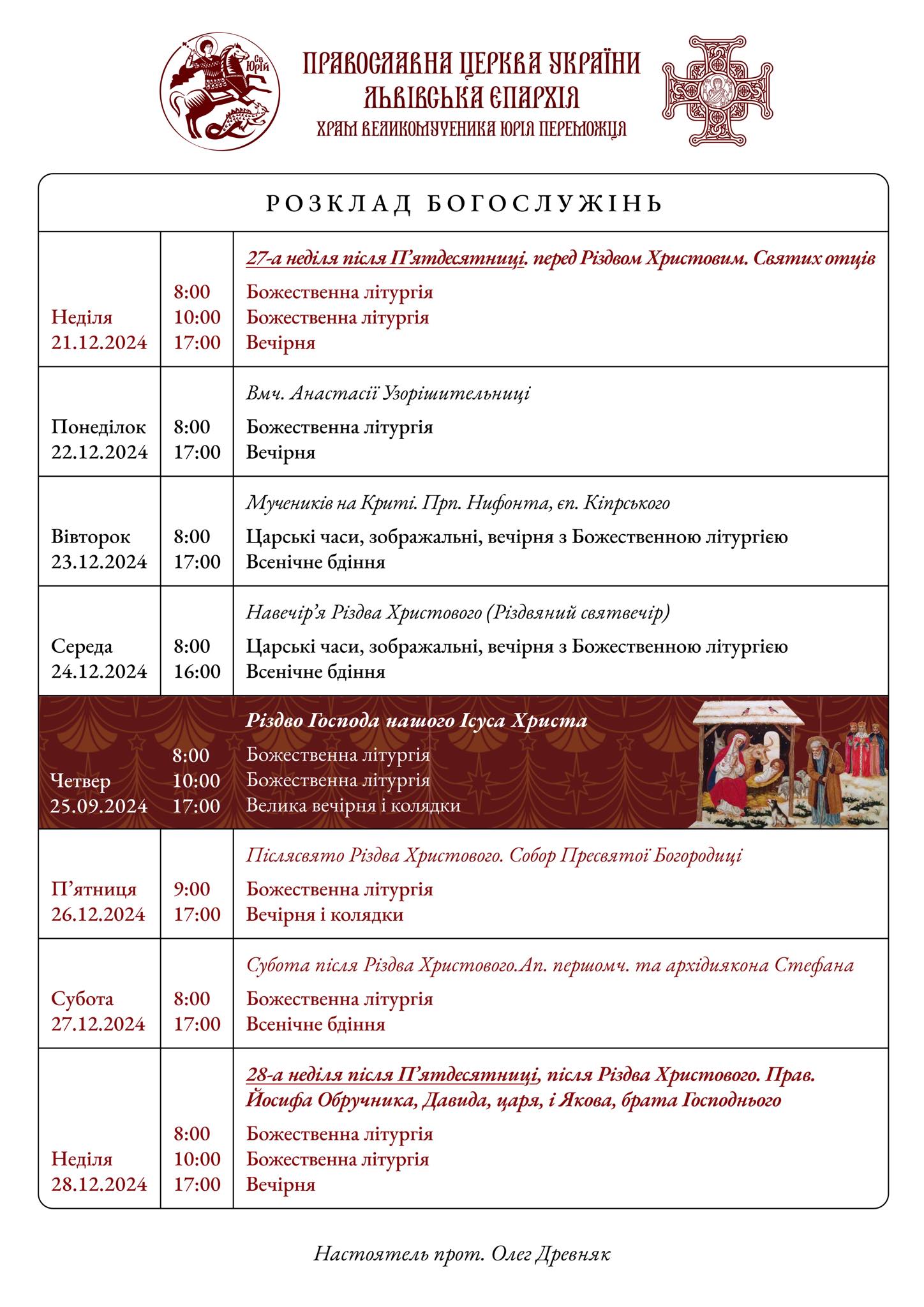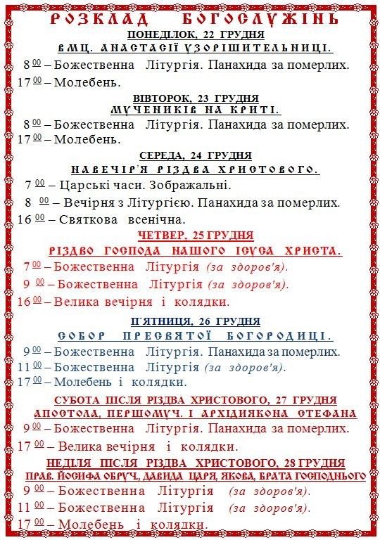 17:00 – Всеношне богослужіння, в часі з якого буде роздаватися Різдвяна просфора до Святого вечора