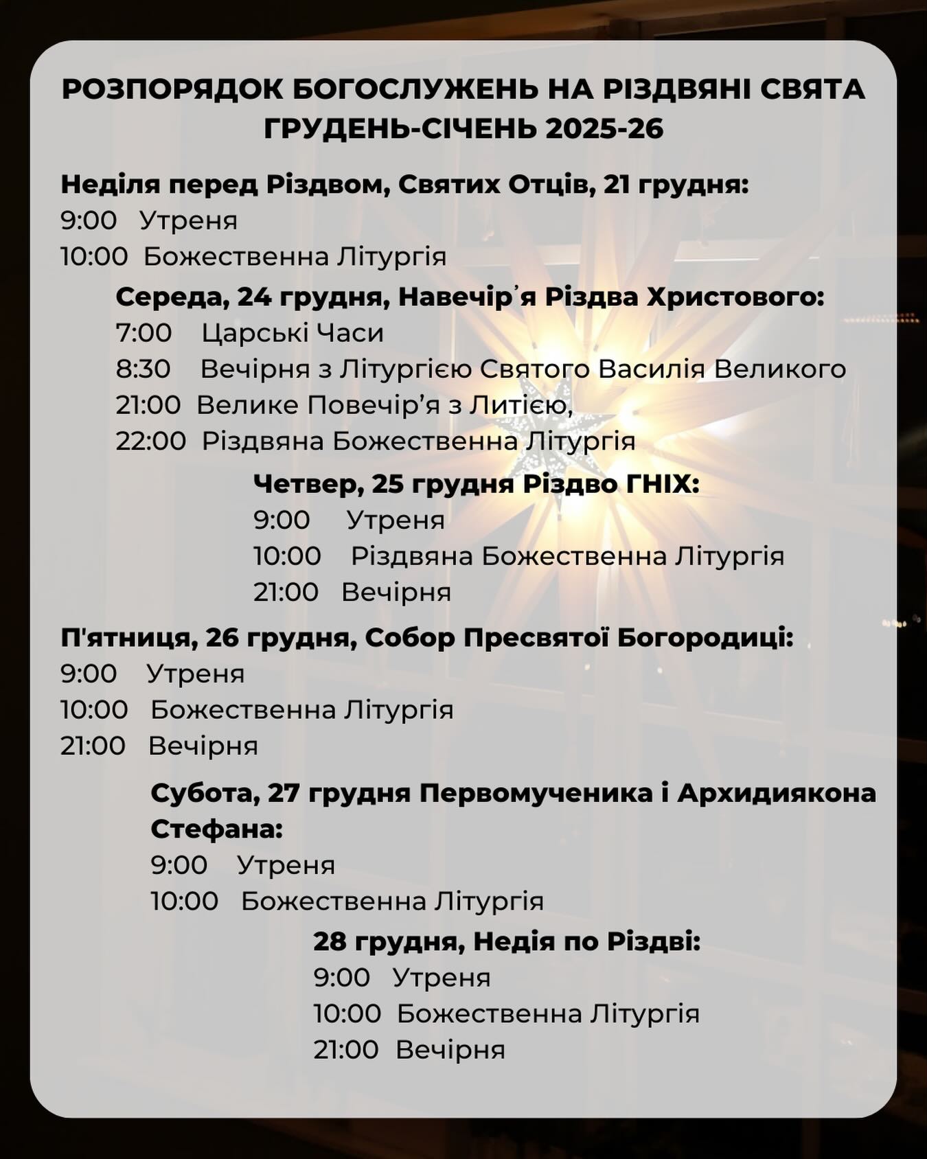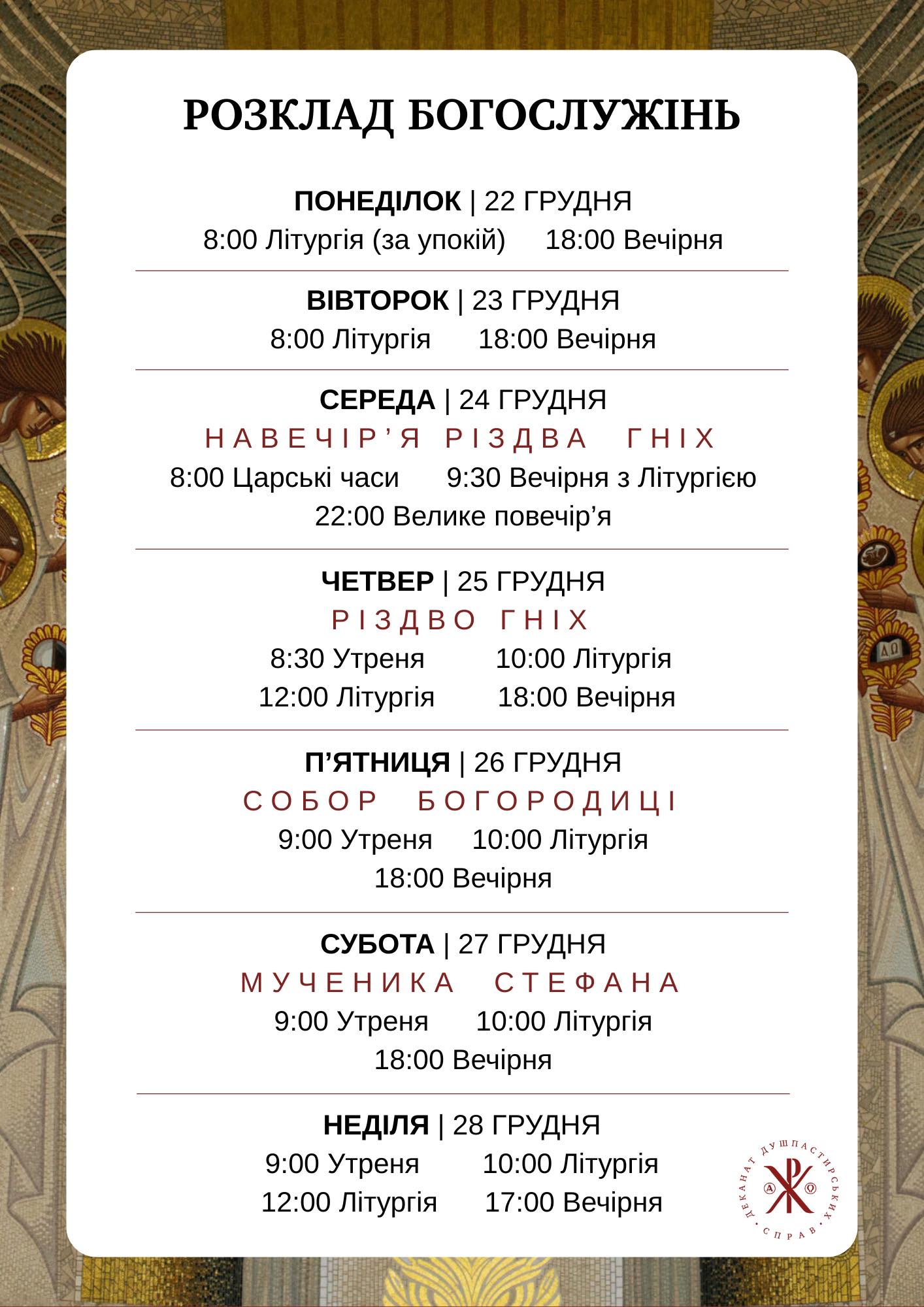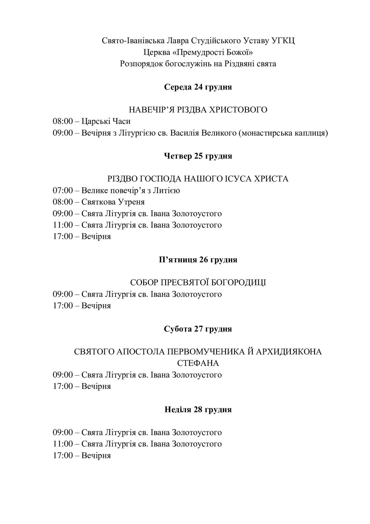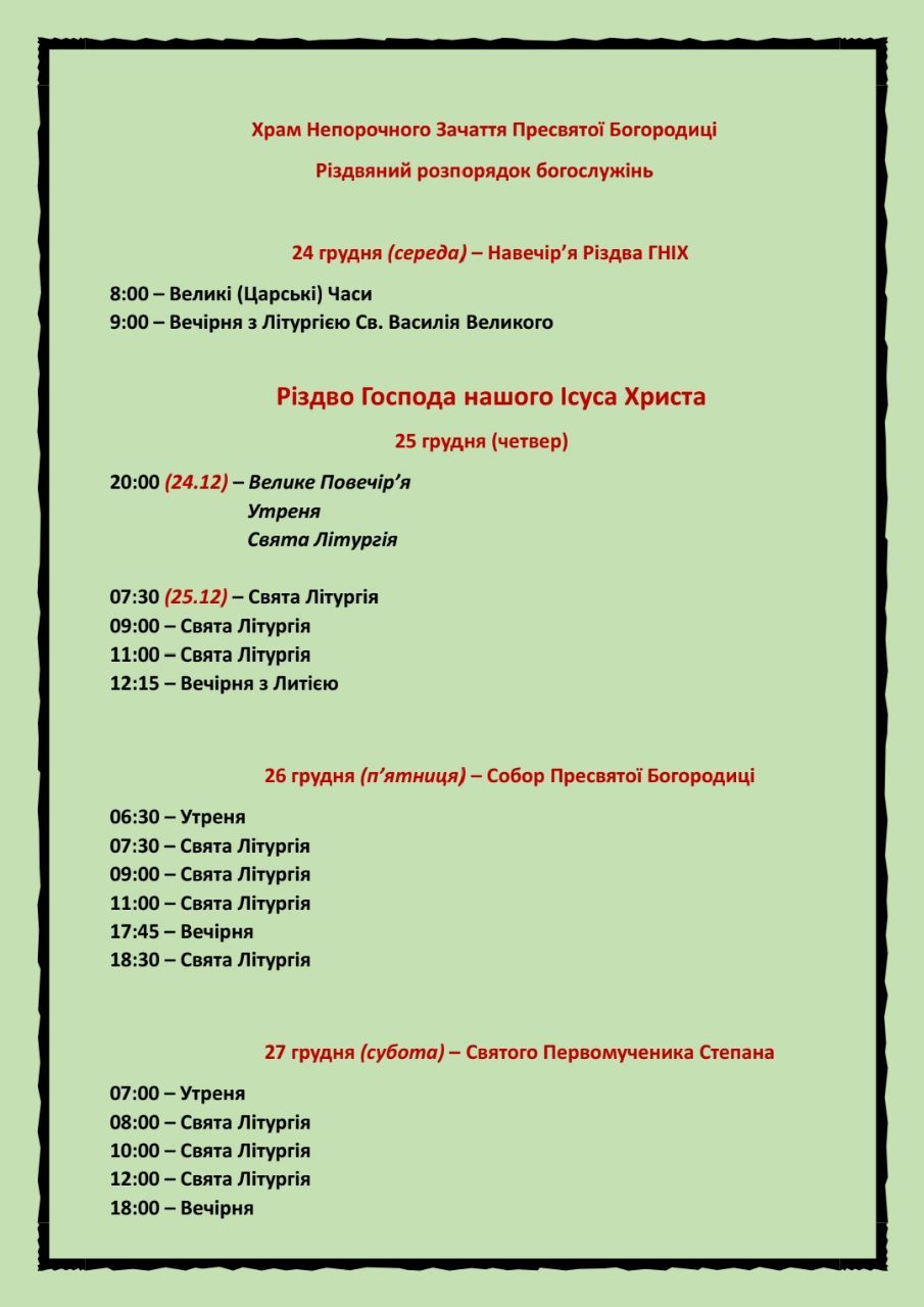 17:00 – Всеношне богослужіння, в часі з якого буде роздаватися Різдвяна просфора до Святого вечора