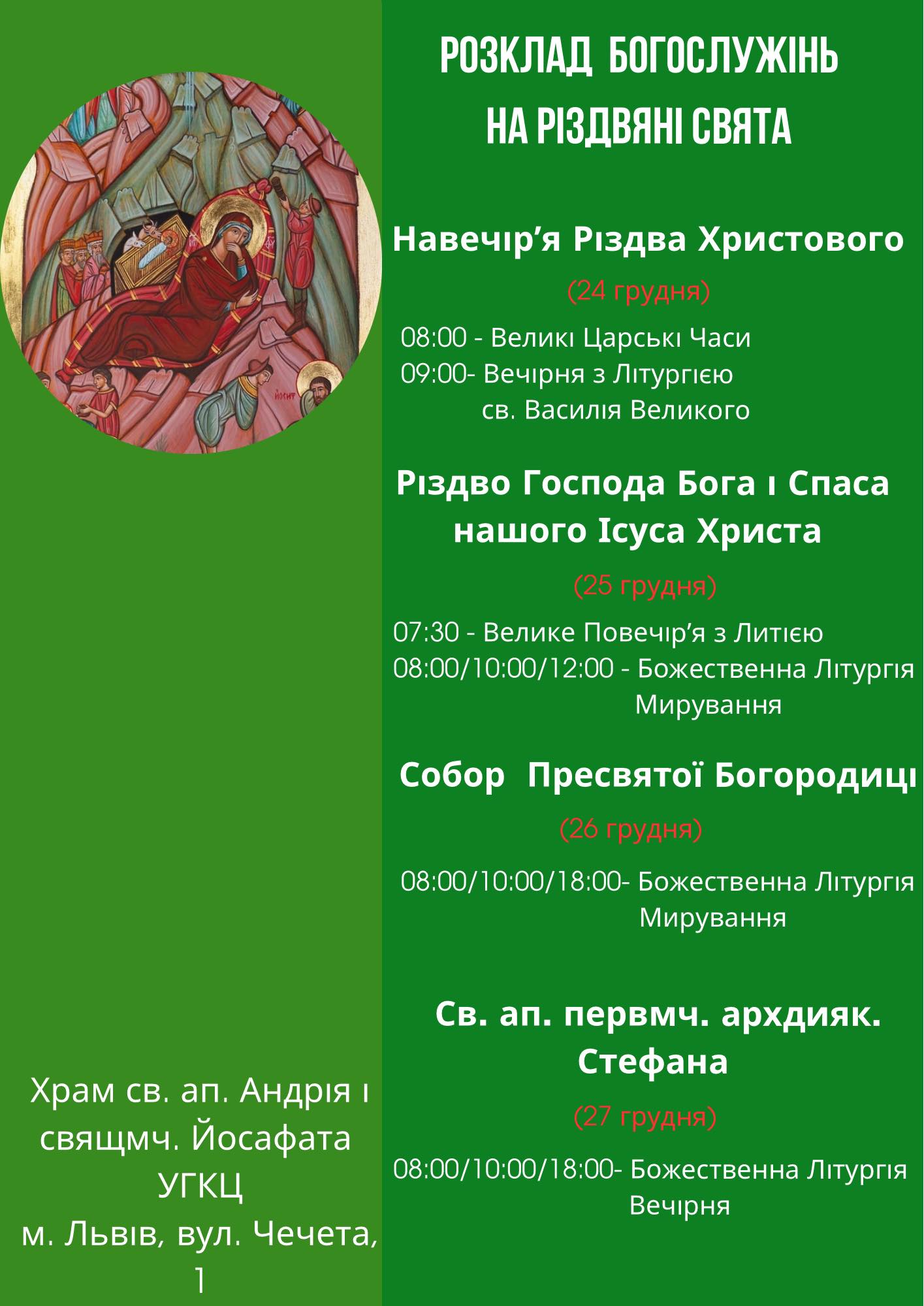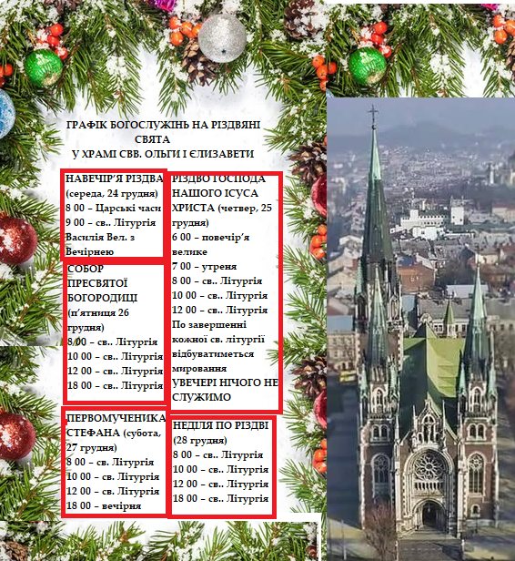25 грудня Церква святкує Різдво Христове. Пропонуємо розпорядок святкових богослужінь у деяких львівських храмах УГКЦ, ПЦУ та РКЦ.