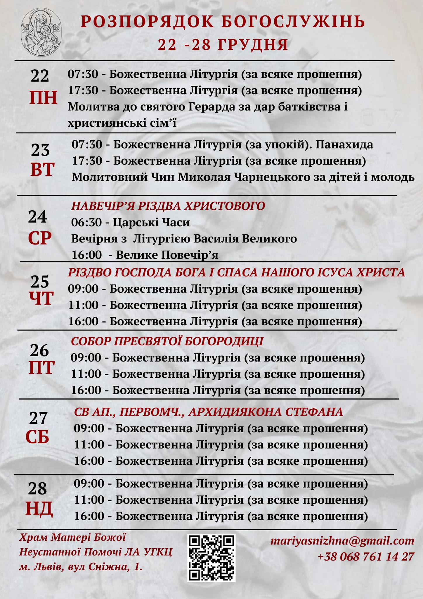 7:00, 9:00, 11:00, 13:00, 15:00, 18:00 – Божественна Літургія