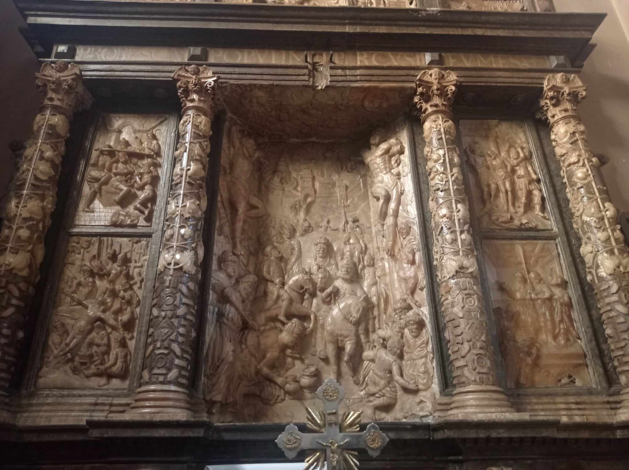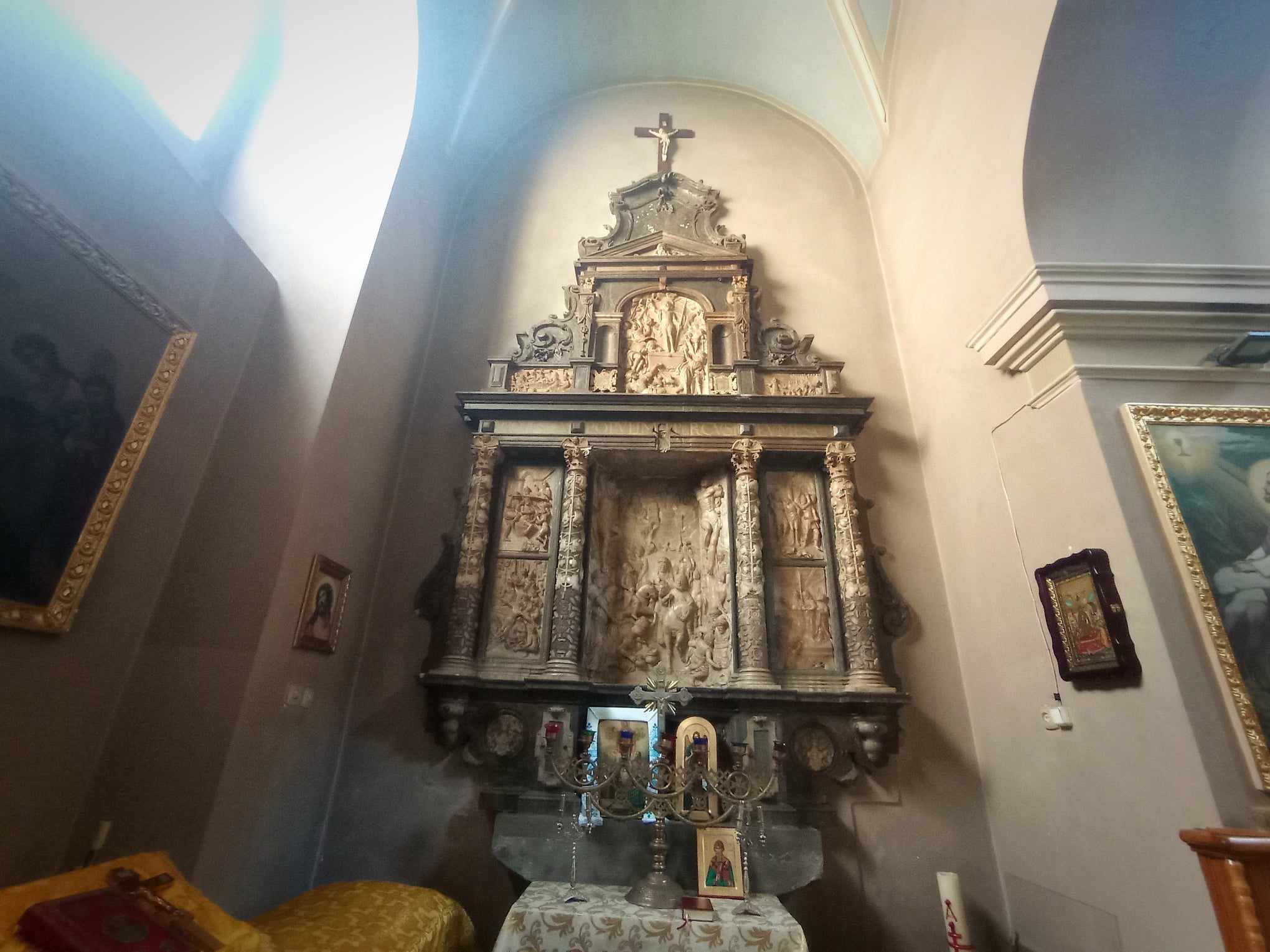 Особливу увагу привертає алебастровий вівтар Страстей Христових 1599 року, відомий як вівтар Шольц-Вольфовича. У храмі він розміщений ліворуч від Святилища. Бароковий вівтар було свого часу перенесено до цього храму як дар із костелу єзуїтів. Цікава річ, на яку звертають увагу деякі дослідники, начебто в центрі вівтаря серед картин Господніх Страстей зображено персонажа в окулярах. Це риса, притаманна бароковому мистецтву – накладання сучасних реалій на історичні події.