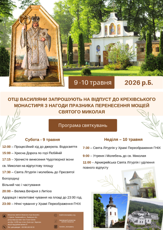 На празник Перенесення мощей святого Миколая запрошує вірян на відпуст Крехівський монастир отців-василіян.
