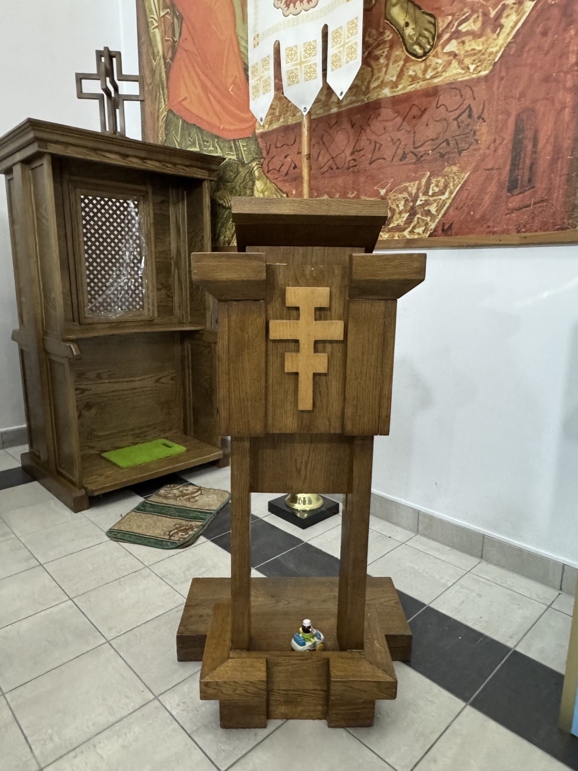 «Раніше ми сповідали без сповідальниць, але ковід поставив свої виклики, і довелося їх виготовити. Зробили їх дуже простими, вони були не зовсім зручні, а тепер поставили трошки міцніші. Це практично, тому що звук не розходиться; священникам зручно сповідати, і людям, напевно, зручно сповідатися. У майбутньому хочемо зробити їх шкляними. Бо шкло дуже гарно забирає звук, але залишає прозорість», — зазначив о. Орест.