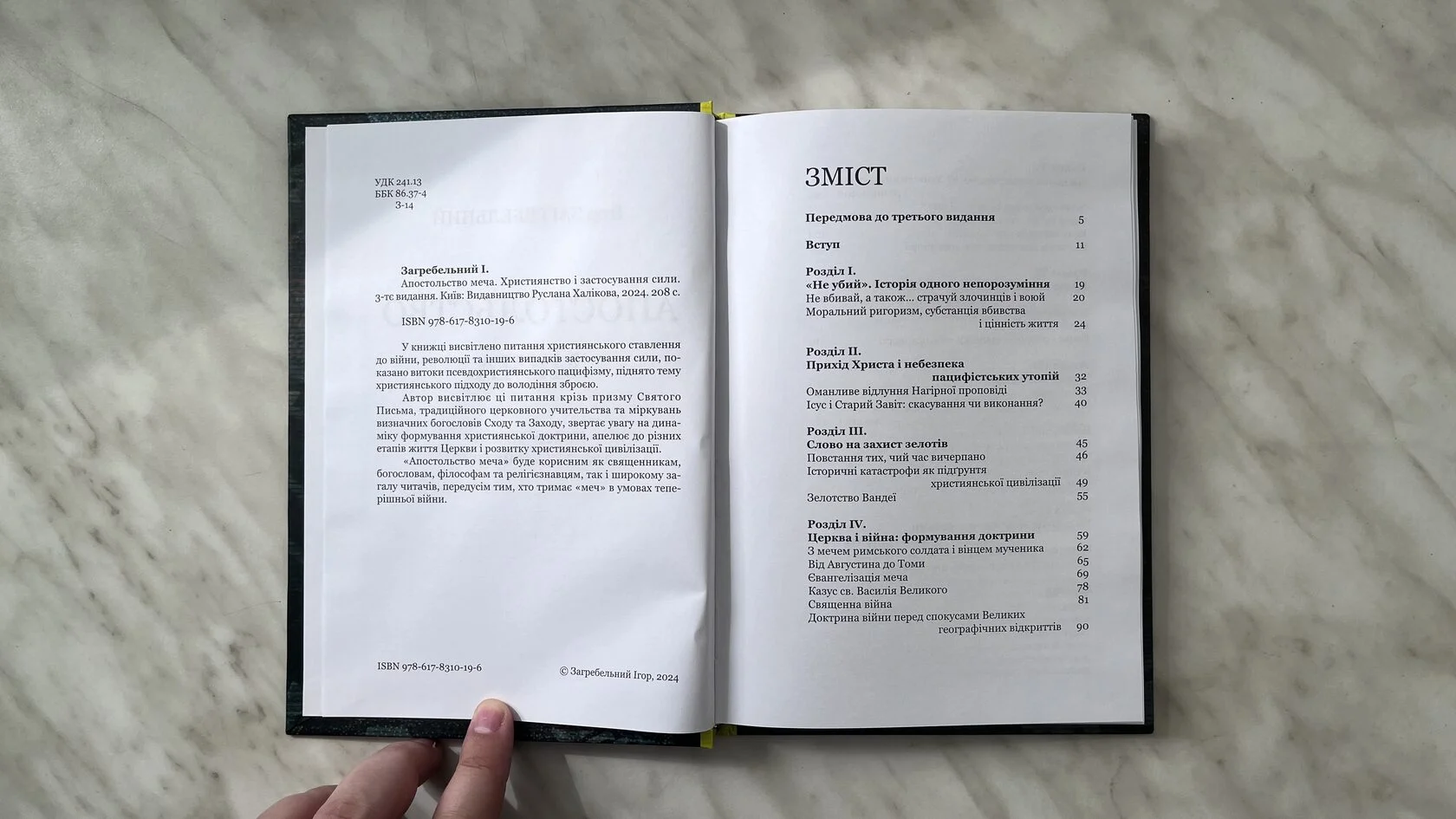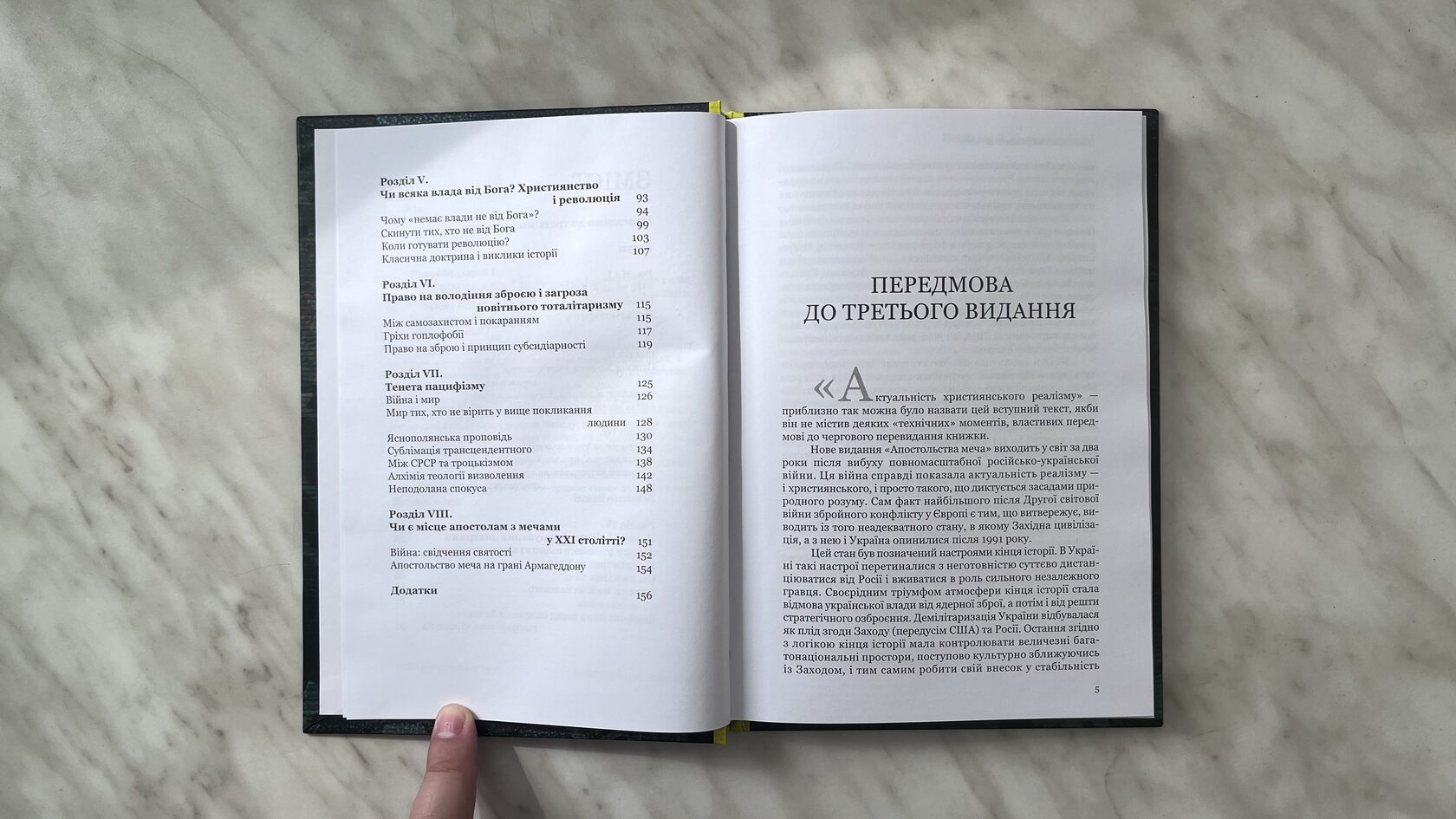 Основний текст не сильно відрізняється від тексту першого видання. Він зазнав лише деяких редагувань, звичних для випадків, коли автор переглядає свій текст із перспективи кількох років. Крім основного тексту, книжка містить окрему передмову, в якій я серед іншого зупиняюся на питанні, чи призвів перехід війни у повномасштабну фазу до руйнування пацифістських уявлень серед українських християн. Також книжка містить додатки, куди увійшли деякі мої статті, що перетинаються з проблематикою «Апостольства меча». Це статті різного змісту: від дослідження витоків спотворених уявлень про християнство до аналізу понтифікату Папи Франциска з його глобалістською і пацифістською риторикою, окремі зразки якої під час повномасштабної війни викликали сильне незадоволення в Україні.