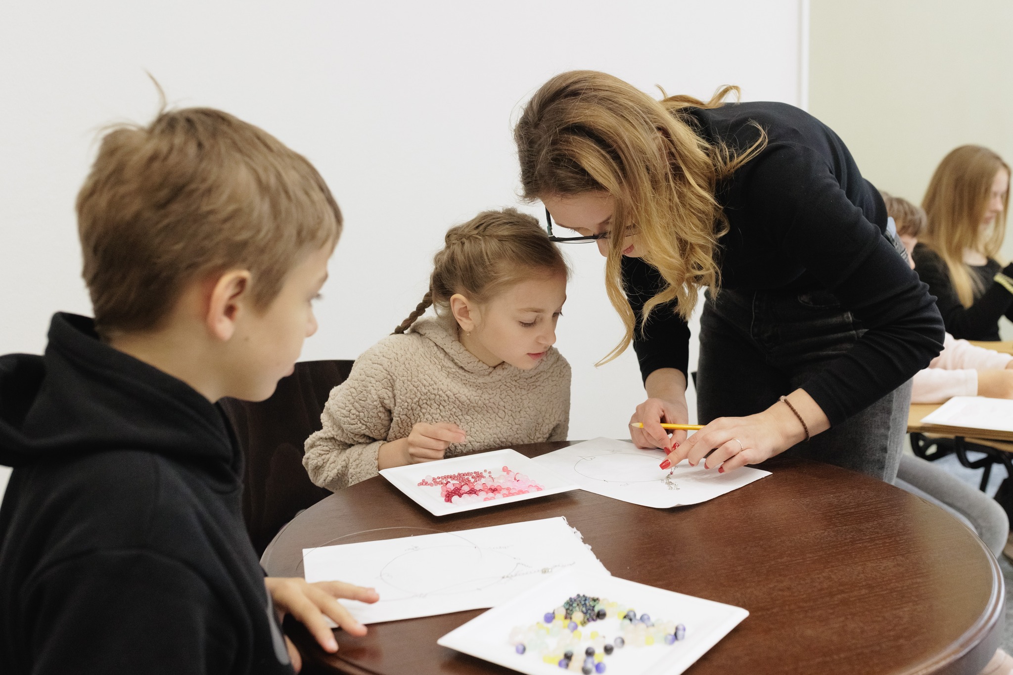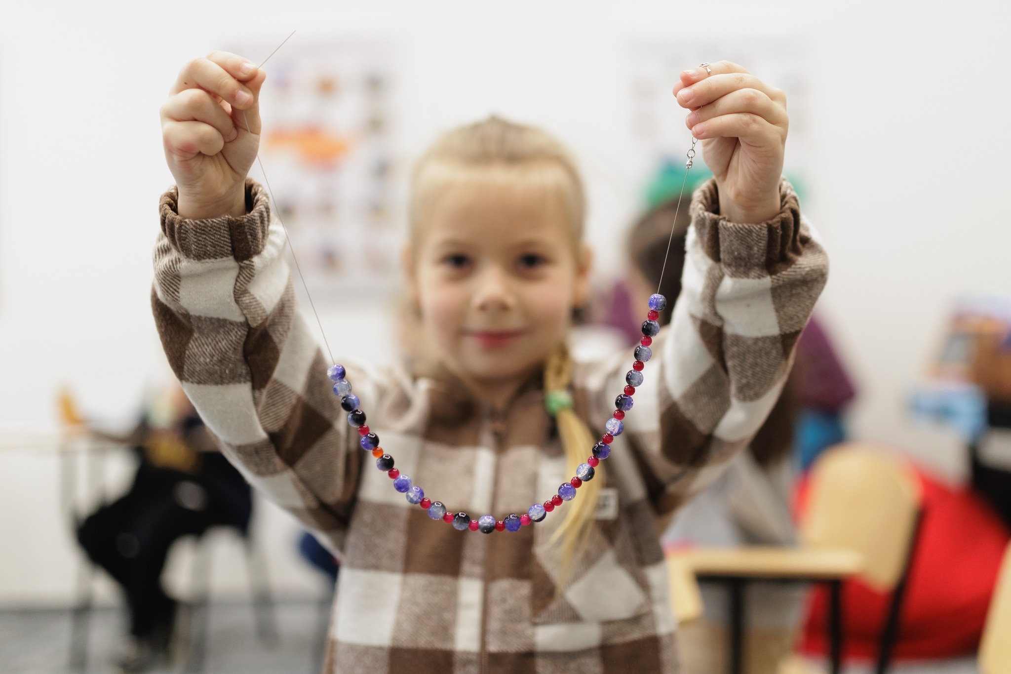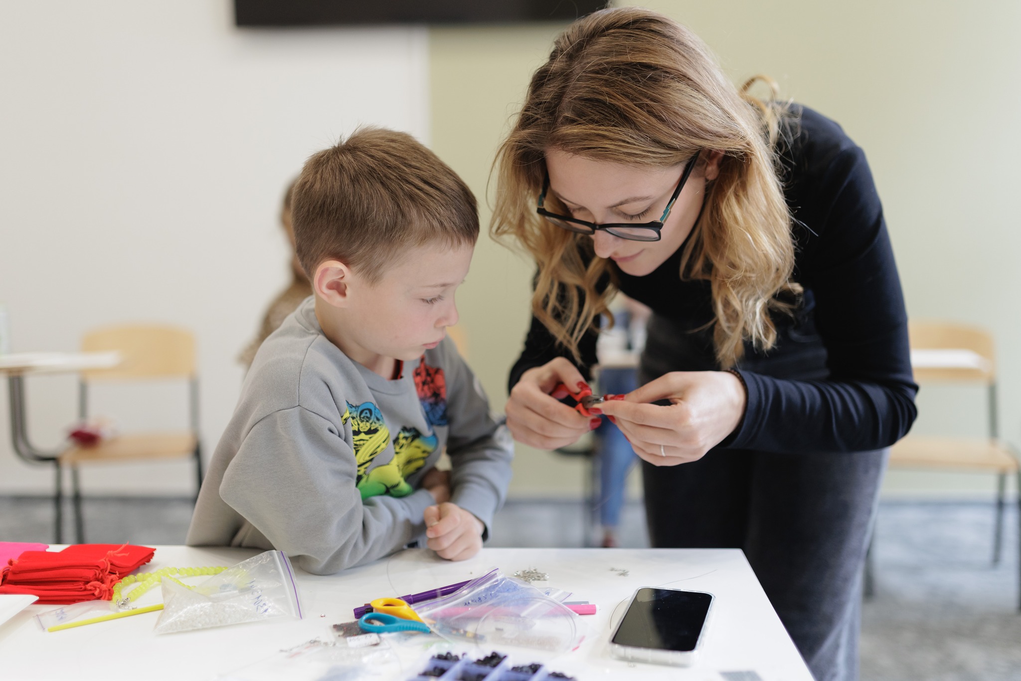 Майстер-клас для діток Захисників провели 10 травня. Учасники мали можливість власноруч виготовити подарунок для мам на День Матері – намисто зі скляних намистин.
