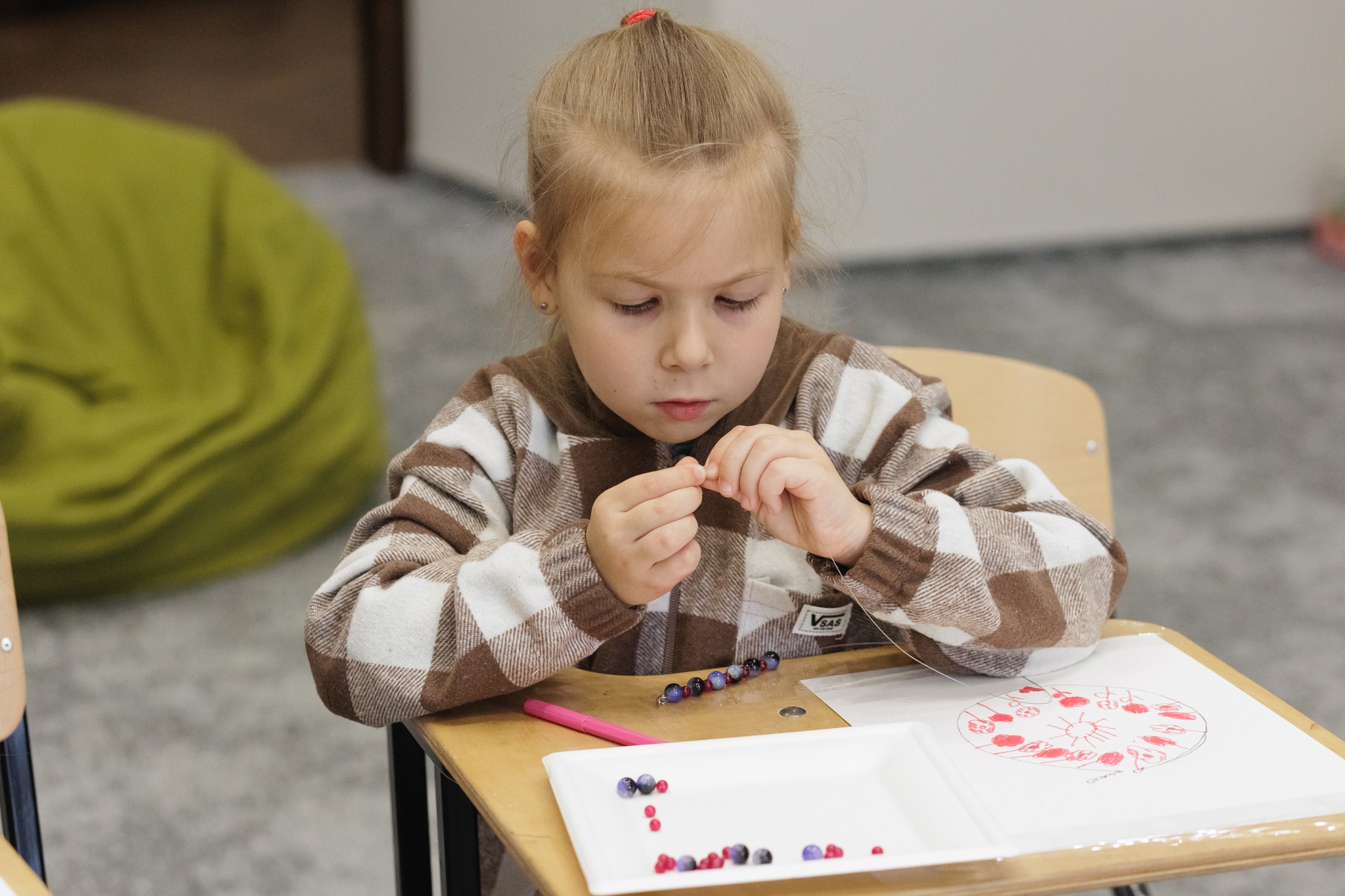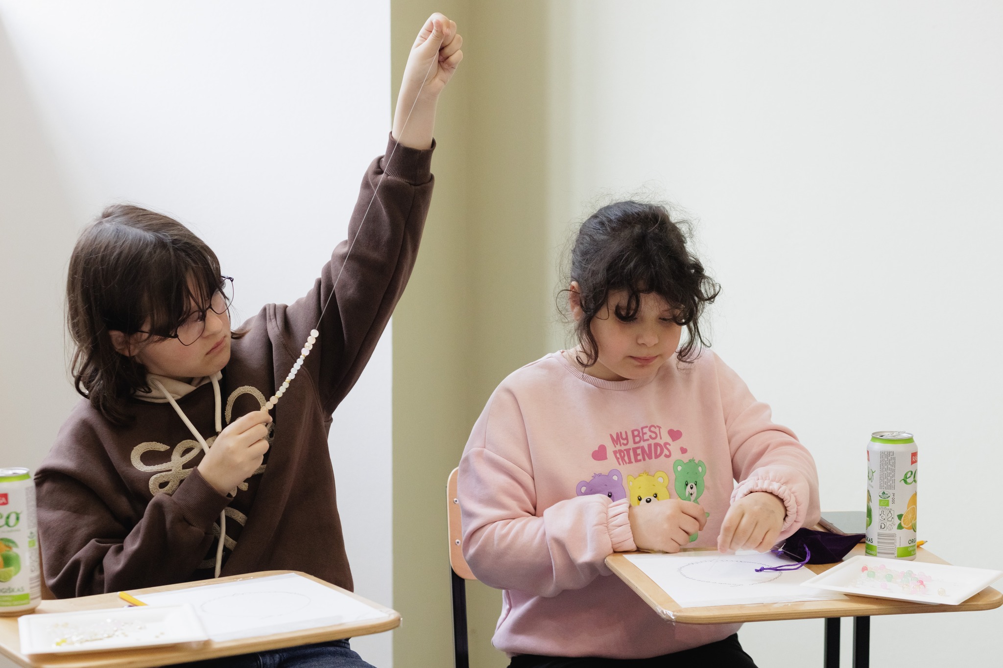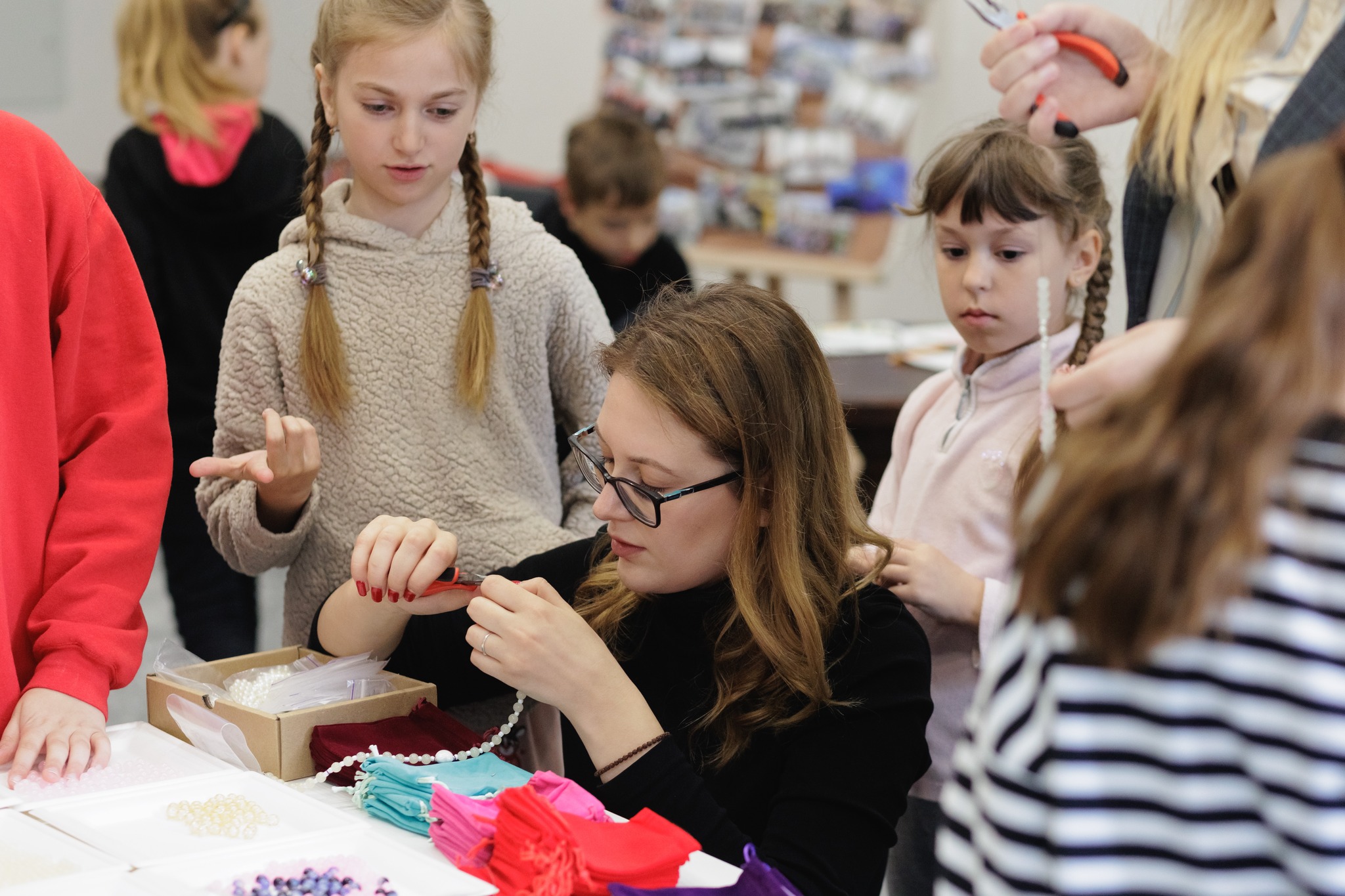 Майстер-клас для діток Захисників провели 10 травня. Учасники мали можливість власноруч виготовити подарунок для мам на День Матері – намисто зі скляних намистин.